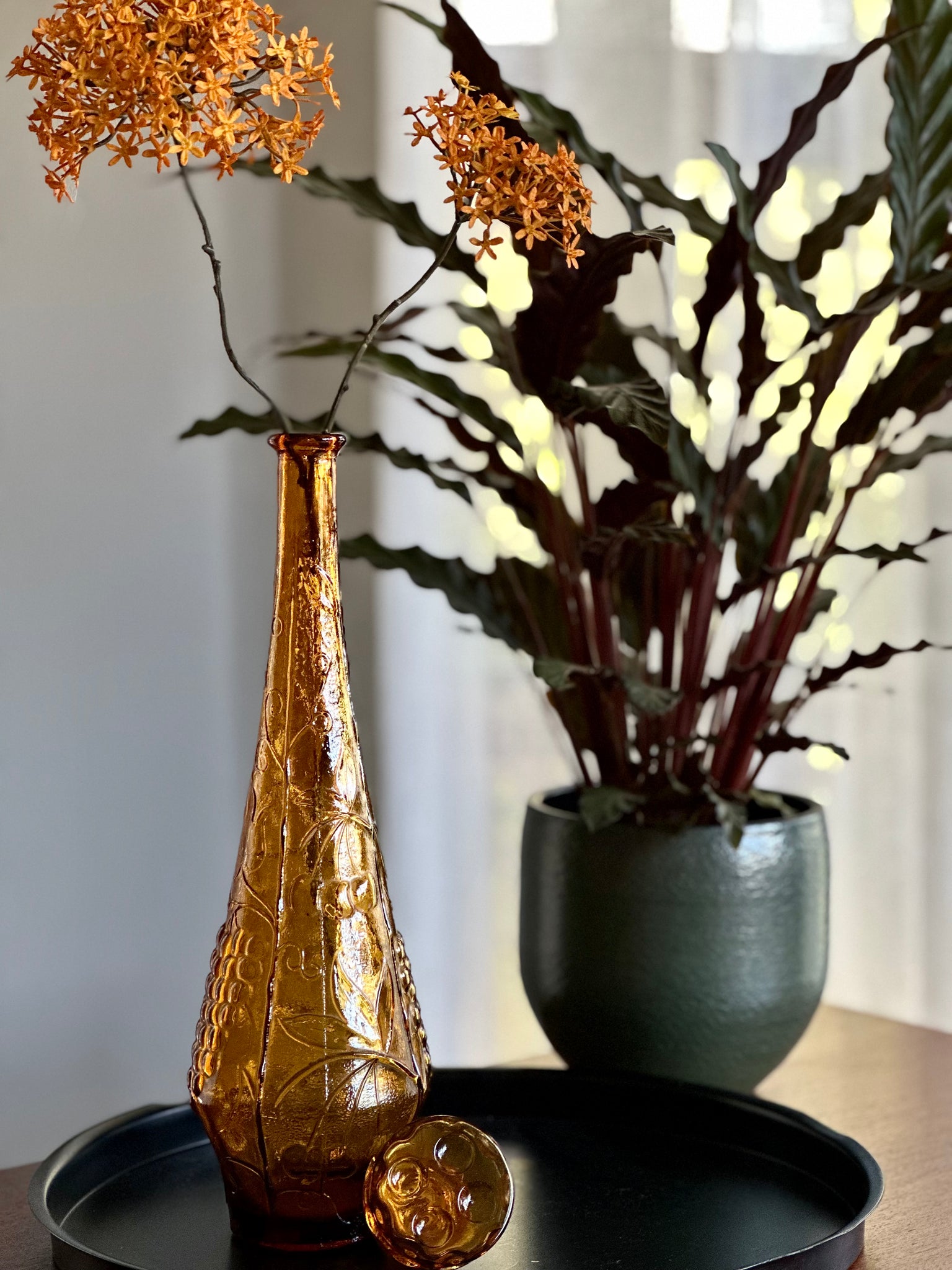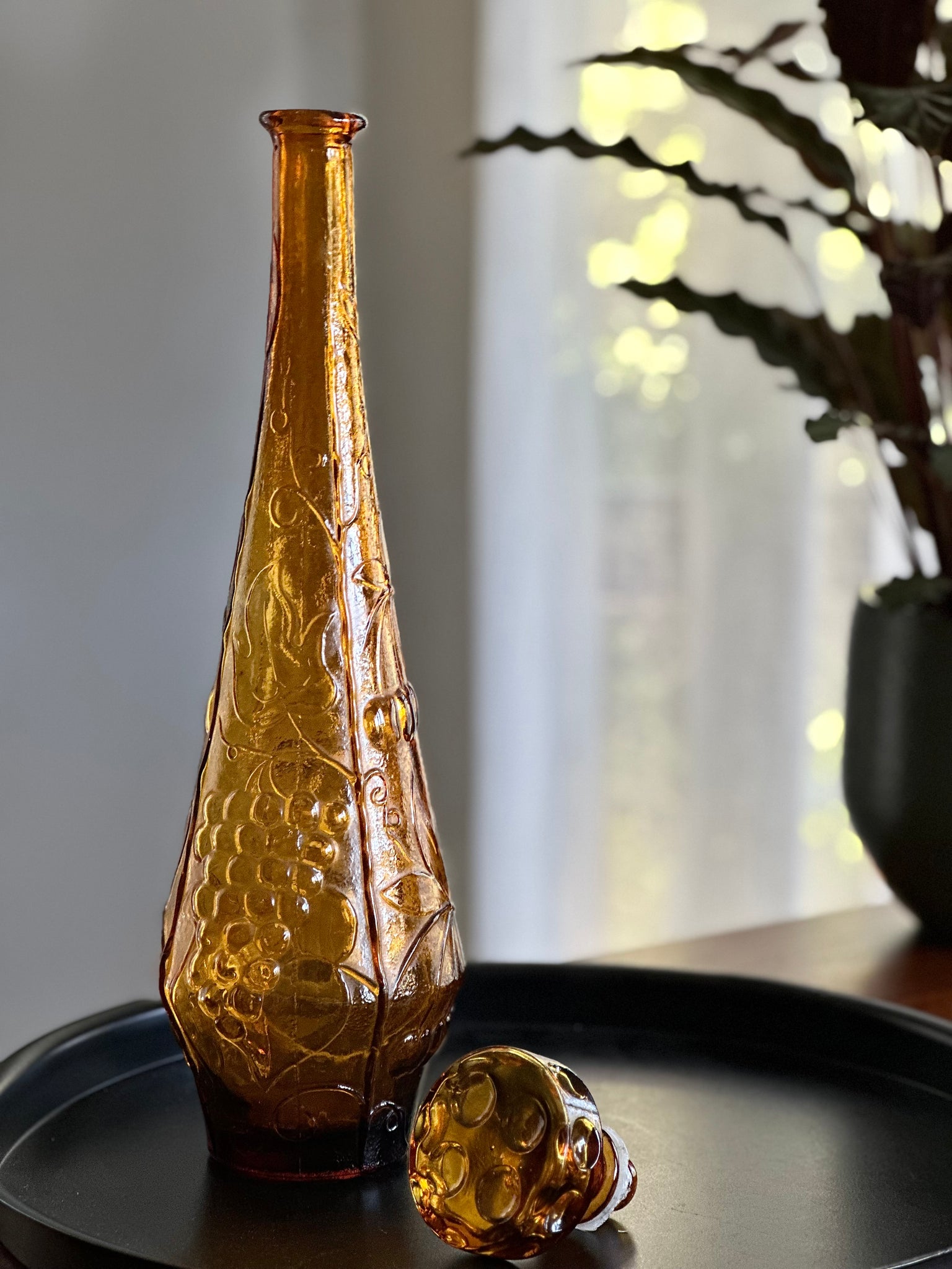 Amber glass genie bottles are among the most recognisable and sought-after decorative objects of the mid-century era. With their tall, sculptural silhouettes and richly textured surfaces, these bottles became design icons in the 1960s and 1970s, celebrated for their whimsical forms and the warm, jewel-like glow of coloured glass.