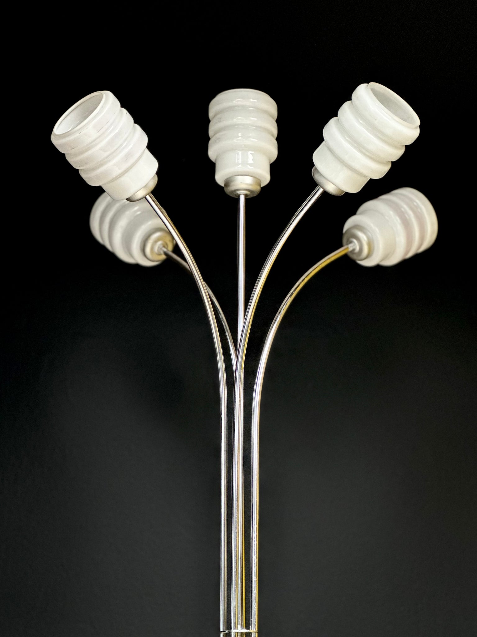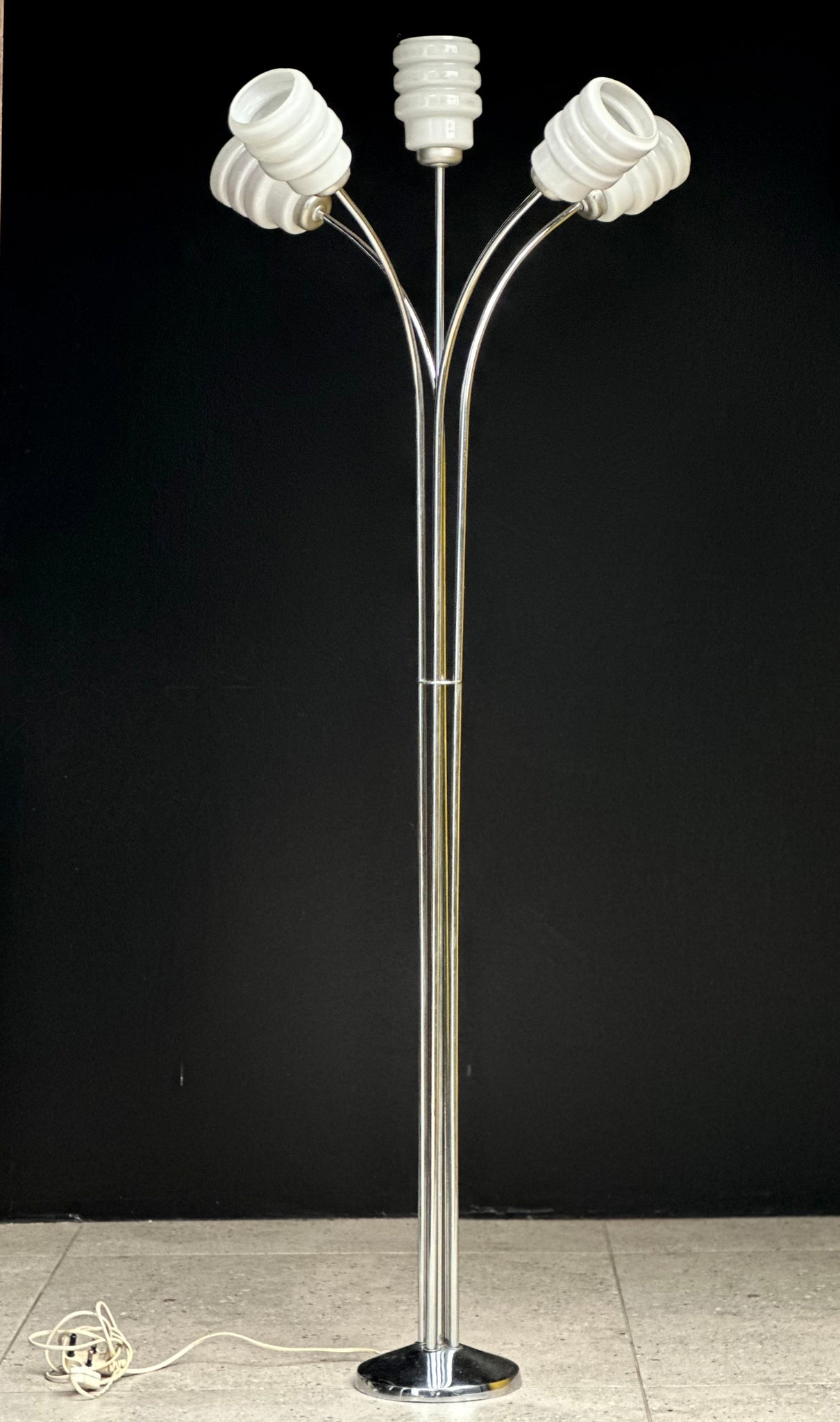 A bold Mid-Century Modern floor lamp features a striking five-arm chrome stem that fans outward in elegant curves. Each arm holds its ribbed white glass shades, which add texture and diffuse light softly. The chrome base and stem give the piece a sleek, reflective finish, typical of mid-century lighting that blends functional design with sculptural form.