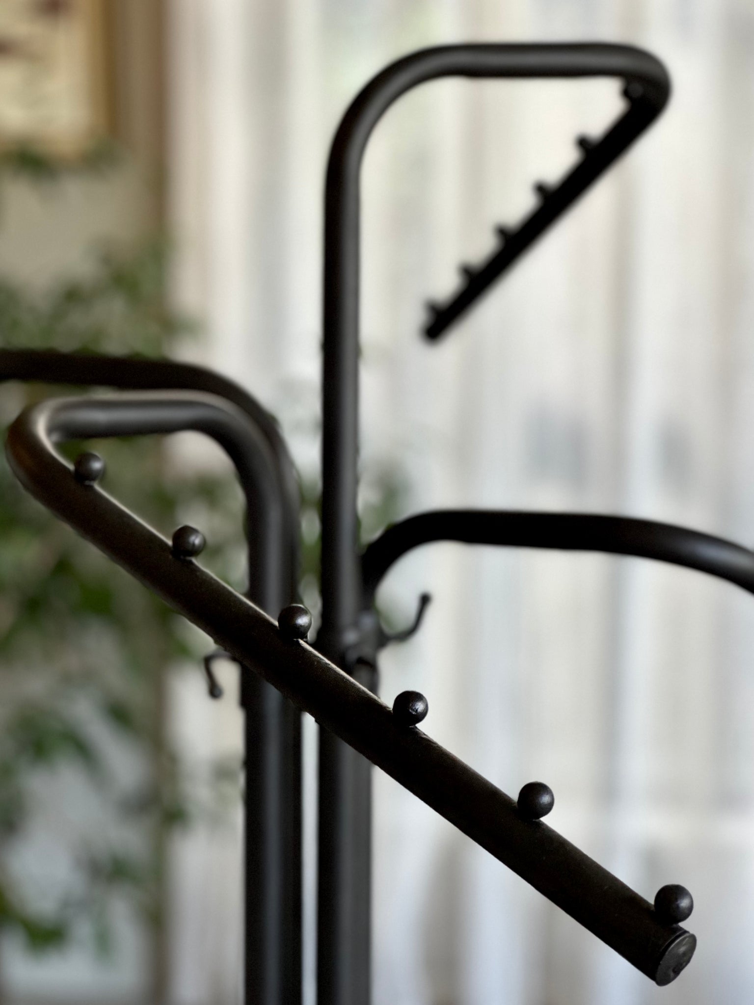 Each arm is spaced for optimal hanging, accommodating jackets, bags, or accessories without crowding. In good vintage condition.
