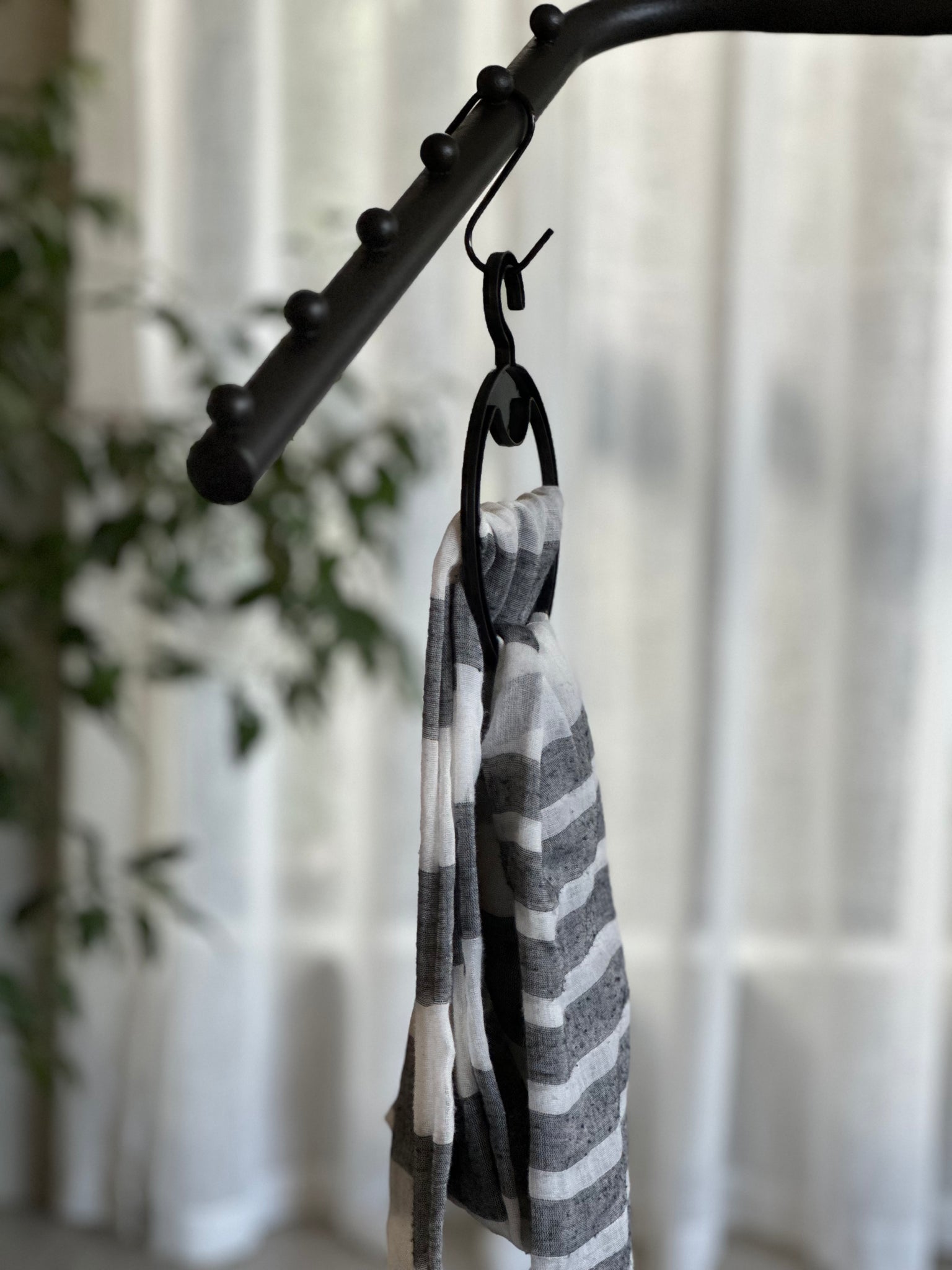 Bring function and form together with this minimalist black metal clothes stand, ideal for both retail and personal spaces. Featuring a sturdy tubular steel construction, the stand is designed with four angled arms, each fitted with ball-end hooks to prevent garments from slipping. The matte black finish lends an industrial aesthetic, making it a sleek addition to modern interiors or vintage-themed boutiques.