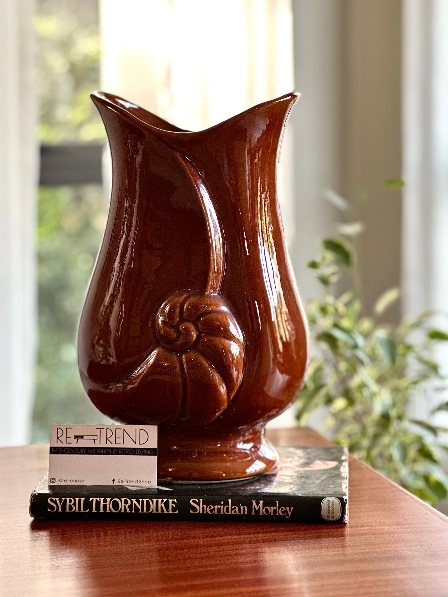A Retro glazed brown vase with a distinctive design. The vase has an undulating, wavy rim that flares outward, and it features a raised, spiral-like motif on its body. The base is broad and slightly flared, providing stability. It is in overall good condition and marked "61-200" at the bottom of the vase.