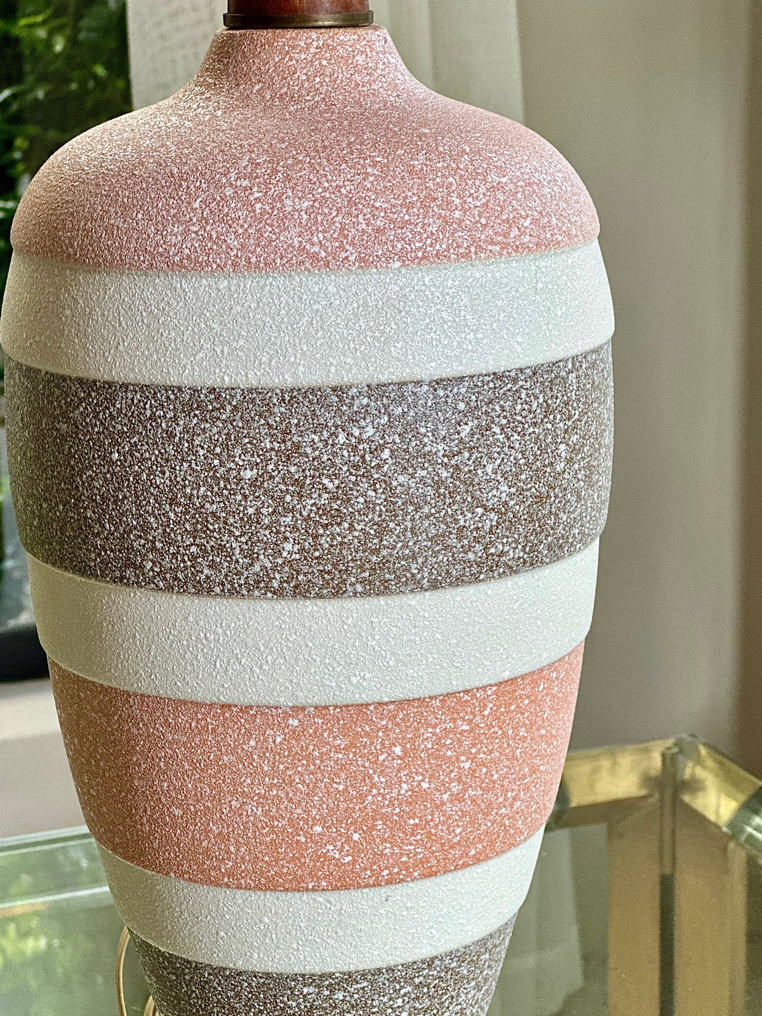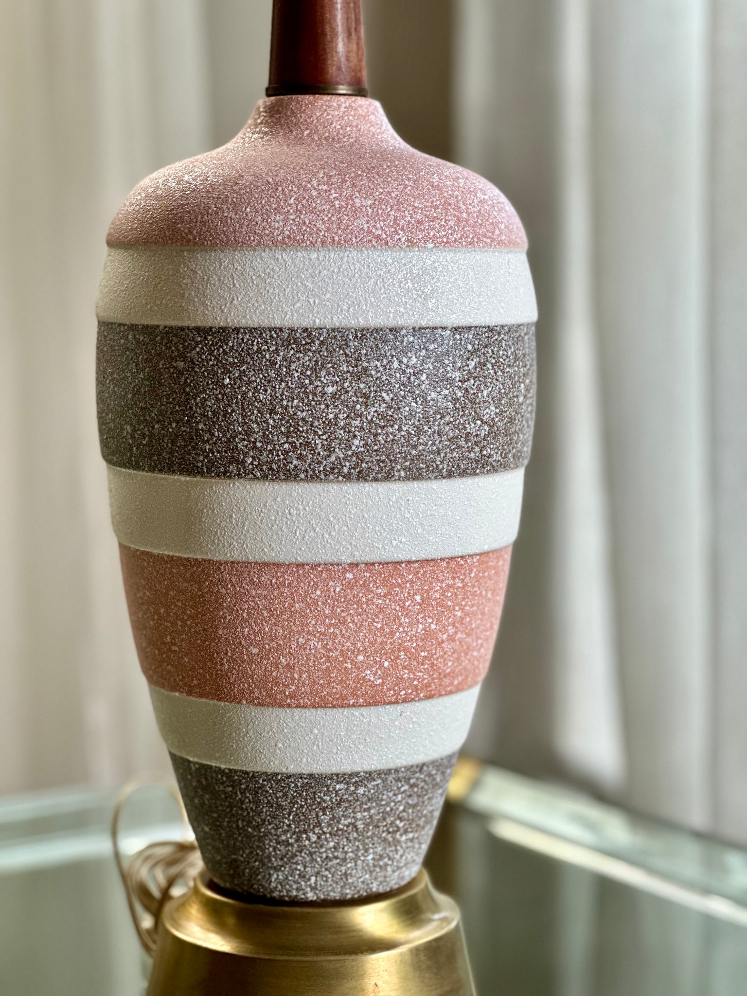 A unique Retro lamp with a neutral-toned base textured, brass plated base, and a complementary shade.