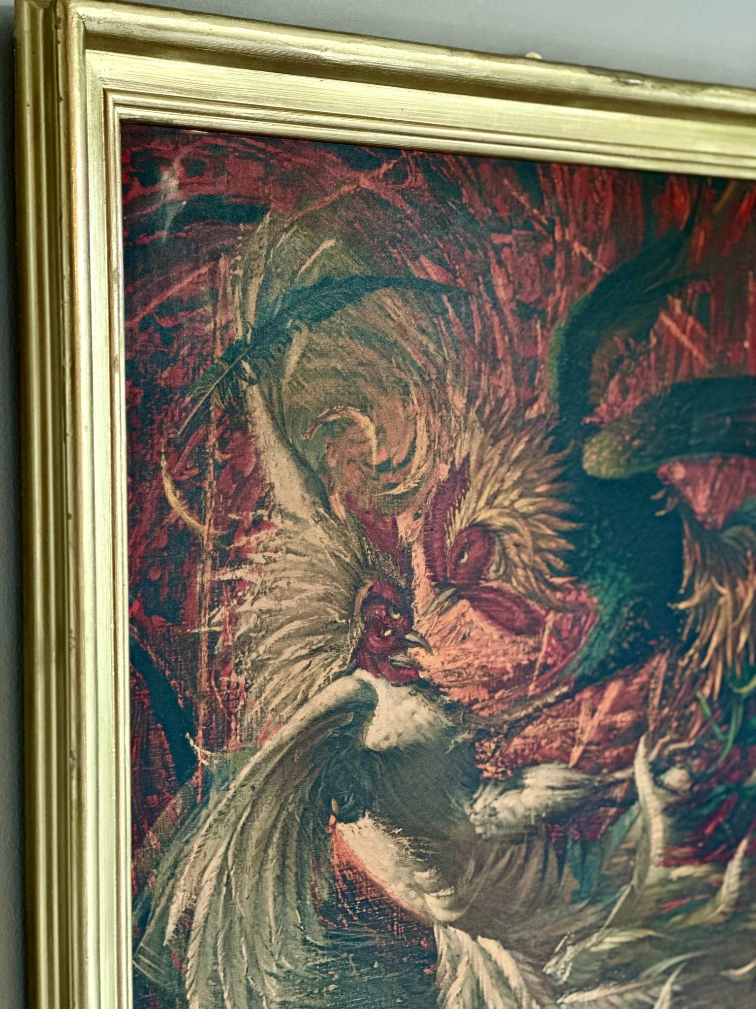 Vladimir Tretchikoff’s "Fighting Cocks" is a striking composition bursting with vivid color, meticulous detail, and dramatic energy. The tension between the birds is captured in their richly painted plumage, rendered with exceptional precision. Tretchikoff’s expert use of light and shadow enhances the depth and texture, bringing every feather to life.