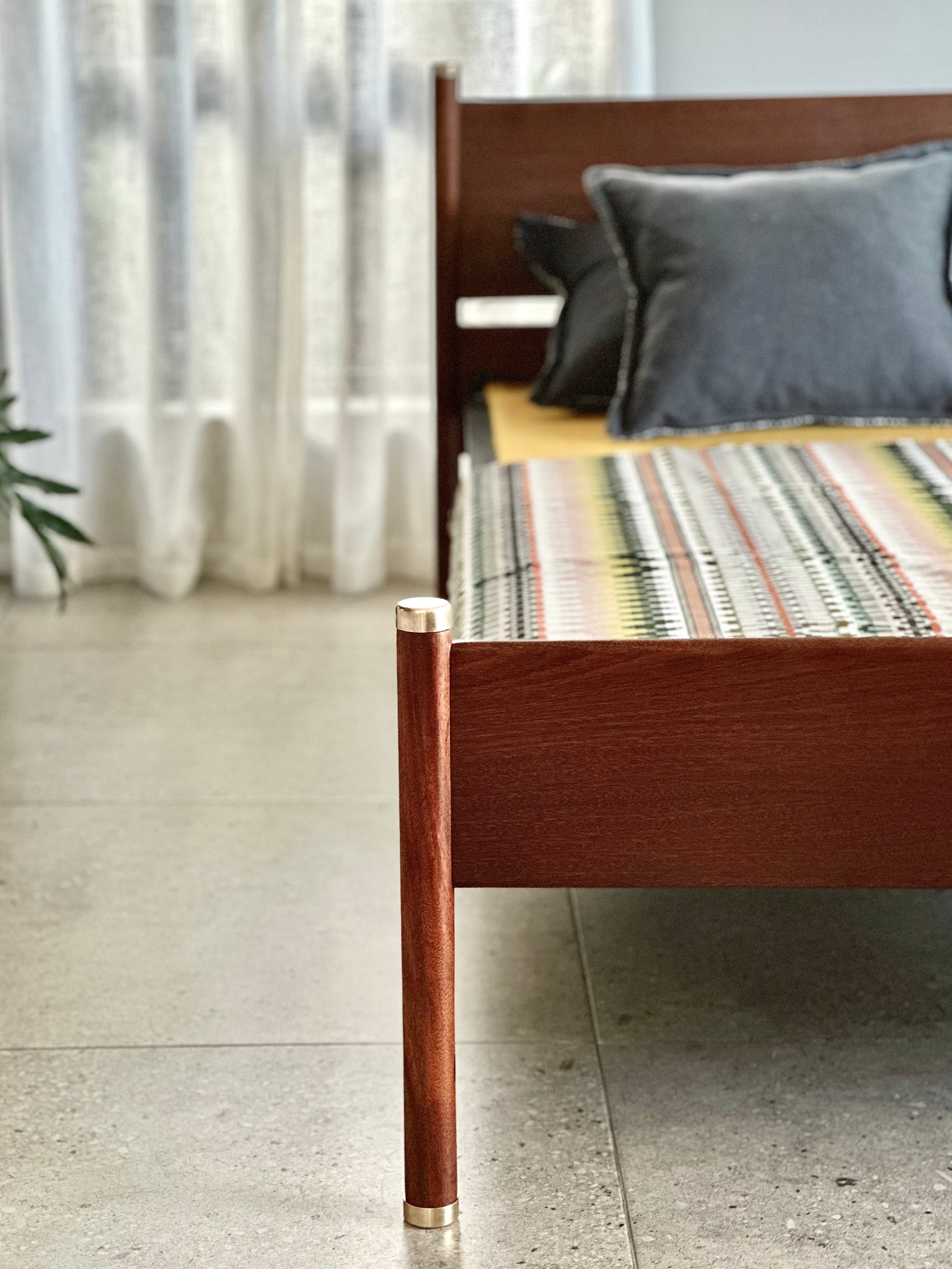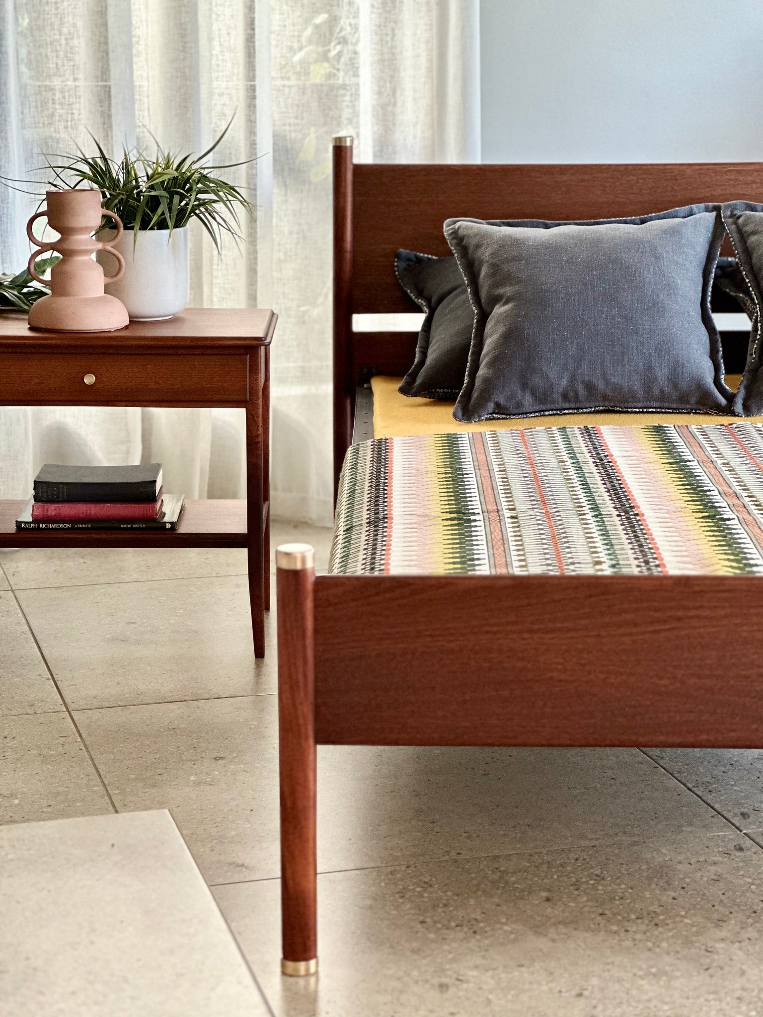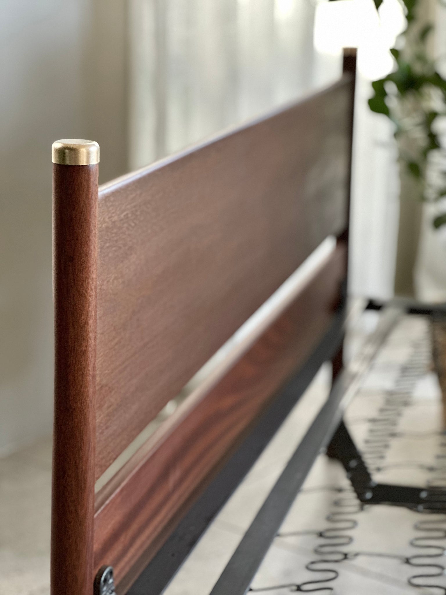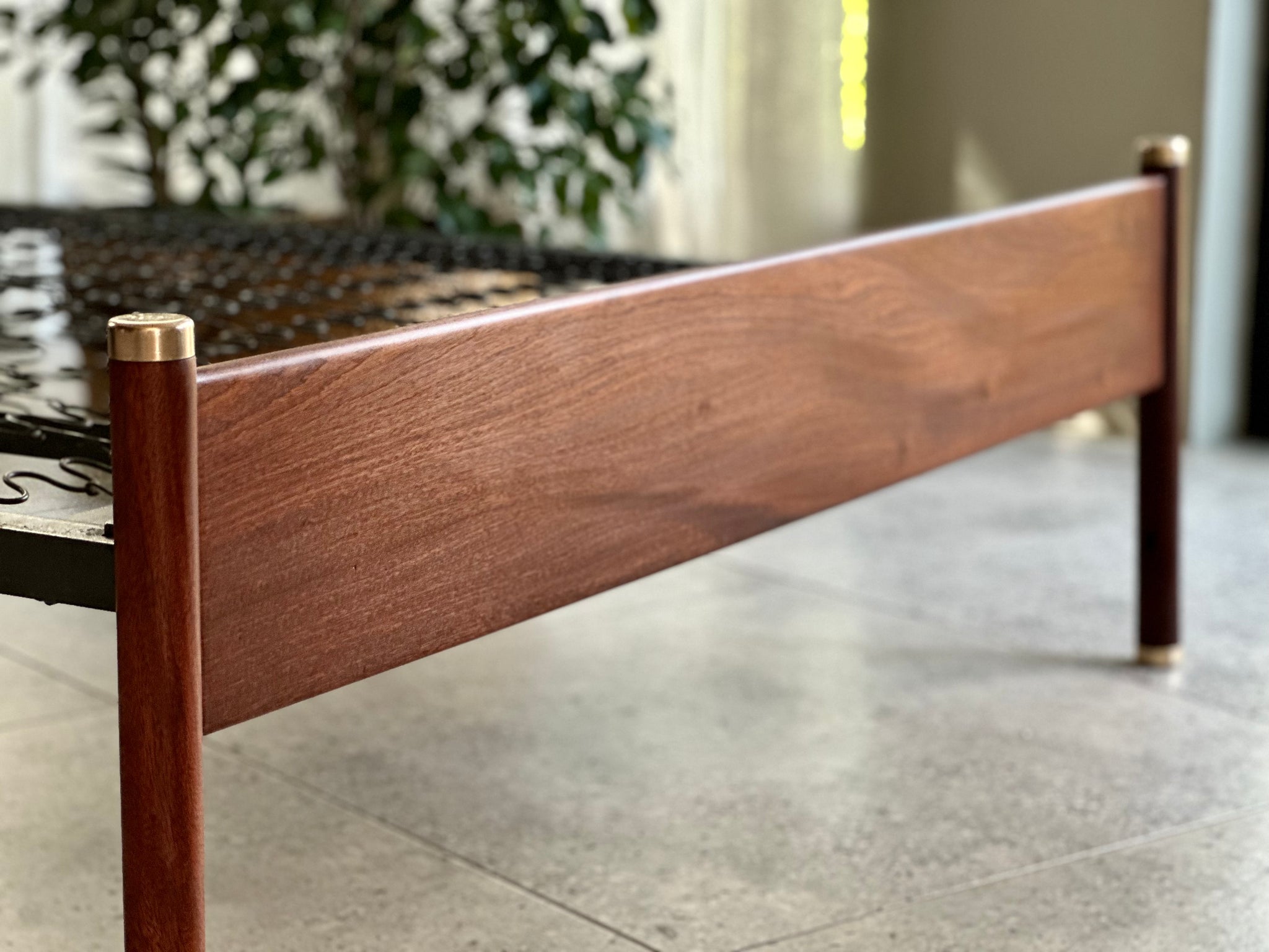 A finely crafted mid-century double bed showcasing the work of South African maker DS Vorster. The design combines a solid wood headboard and footboard in a warm, restored finish with a sturdy steel frame and spring base for long-lasting durability. Subtle brass-capped details highlight the refined lines and add a touch of elegance to the piece.