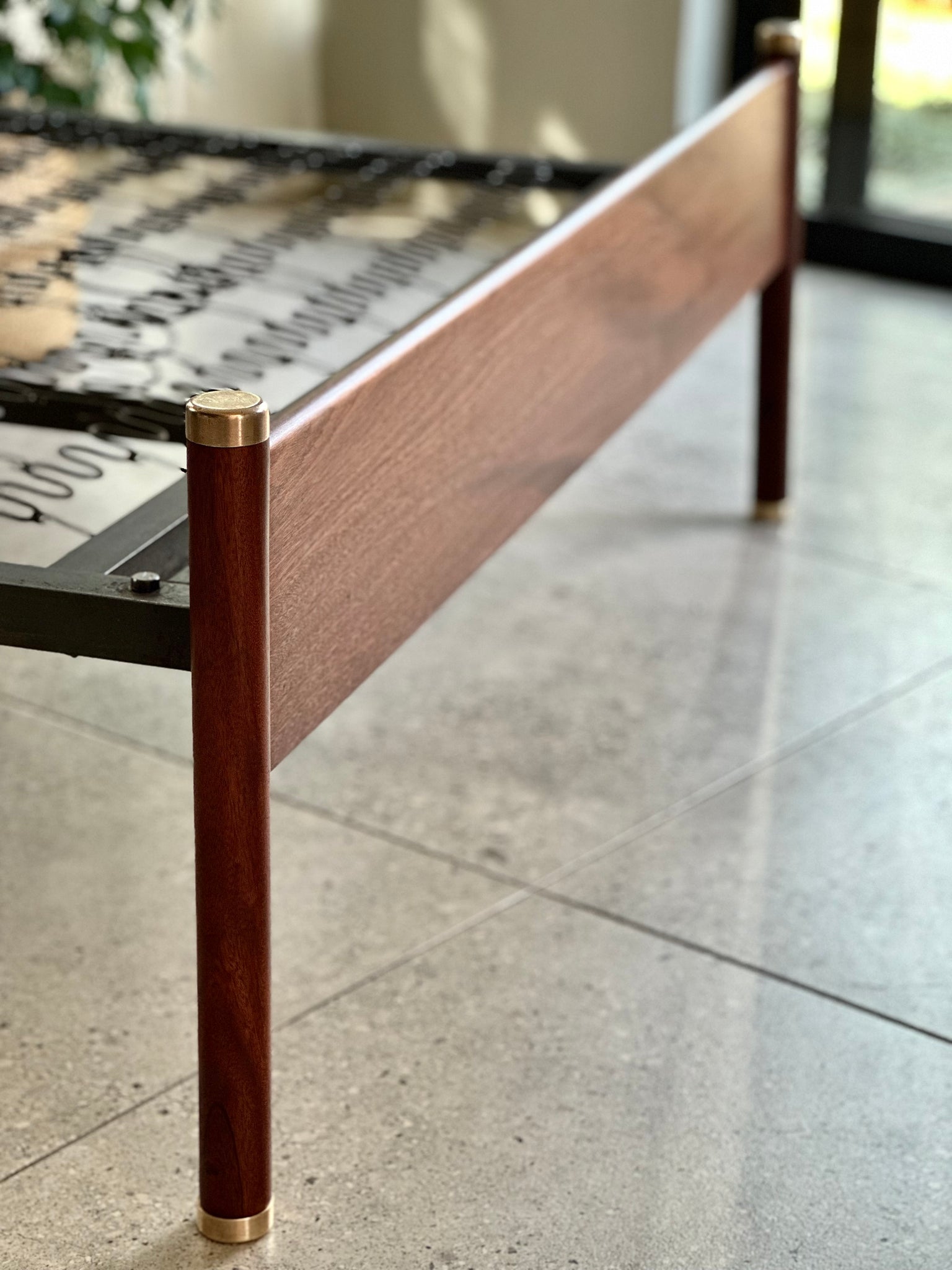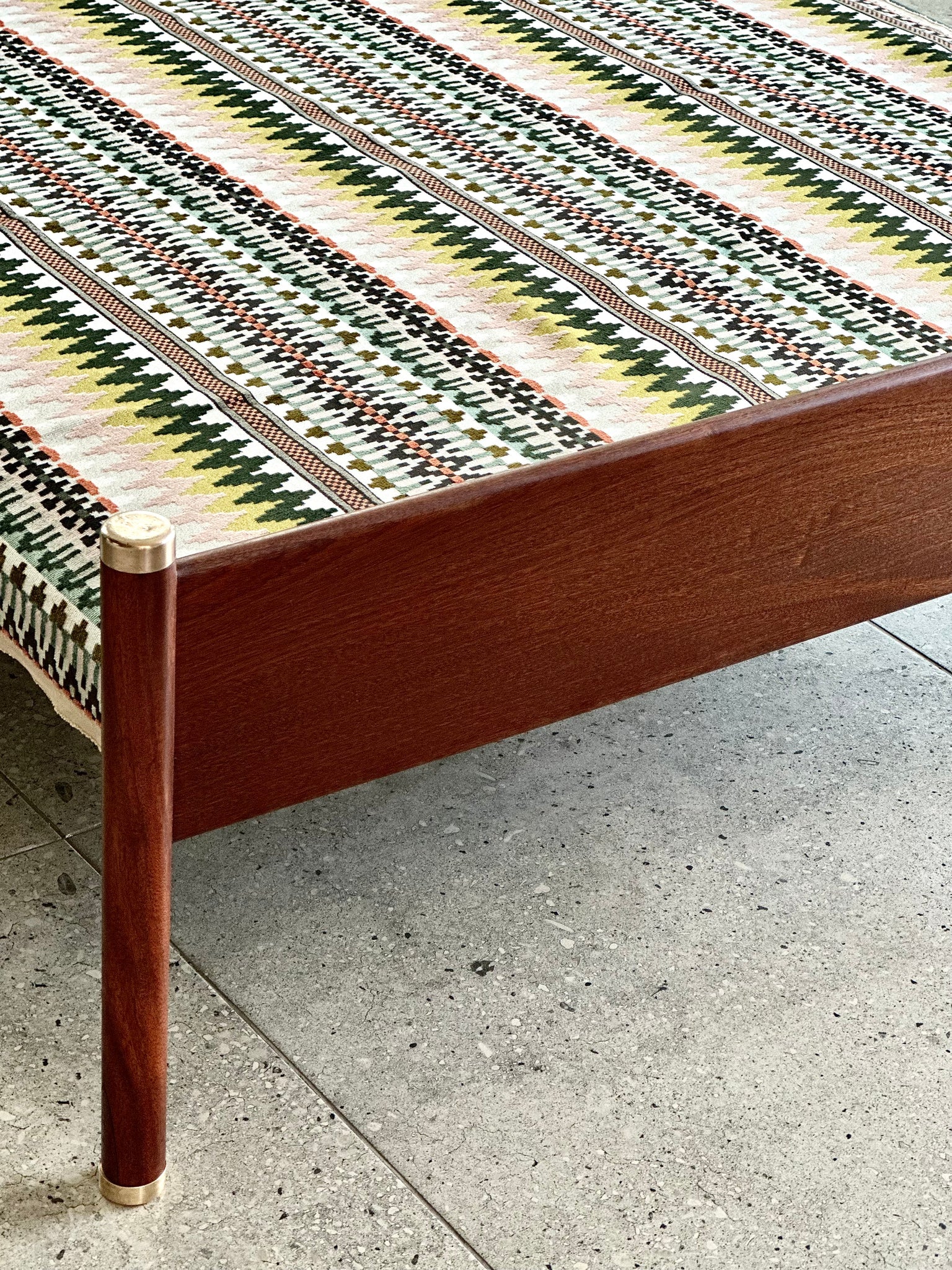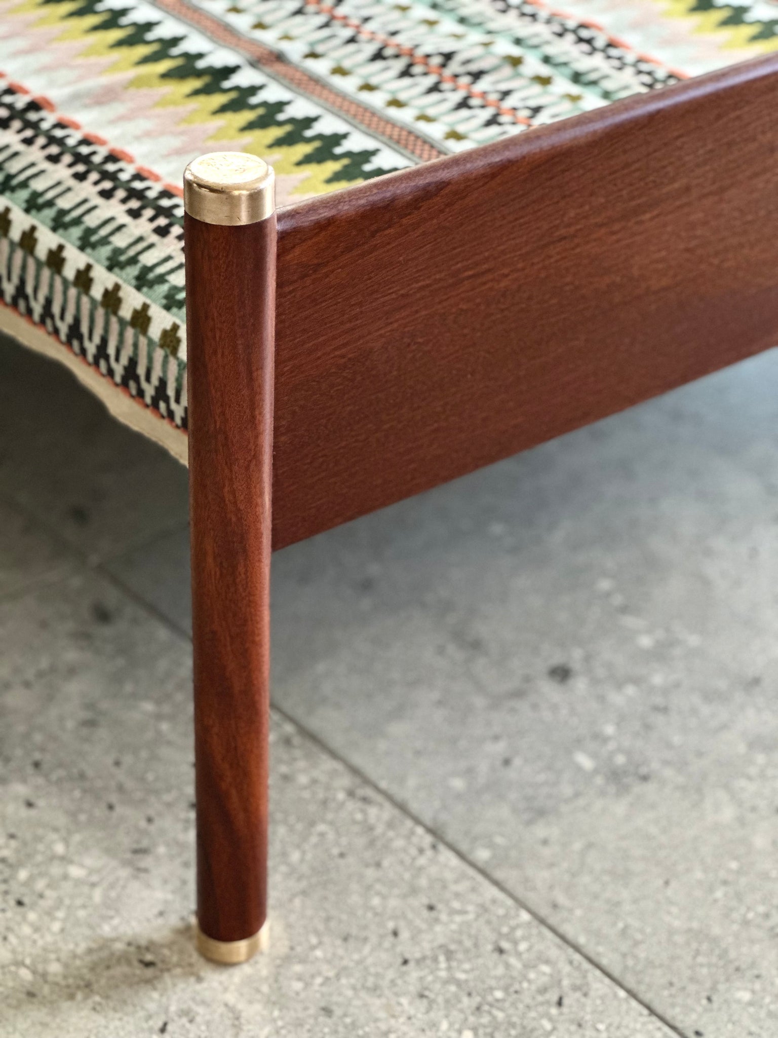 A finely crafted mid-century double bed showcasing the work of South African maker DS Vorster. The design combines a solid wood headboard and footboard in a warm, restored finish with a sturdy steel frame and spring base for long-lasting durability. Subtle brass-capped details highlight the refined lines and add a touch of elegance to the piece.