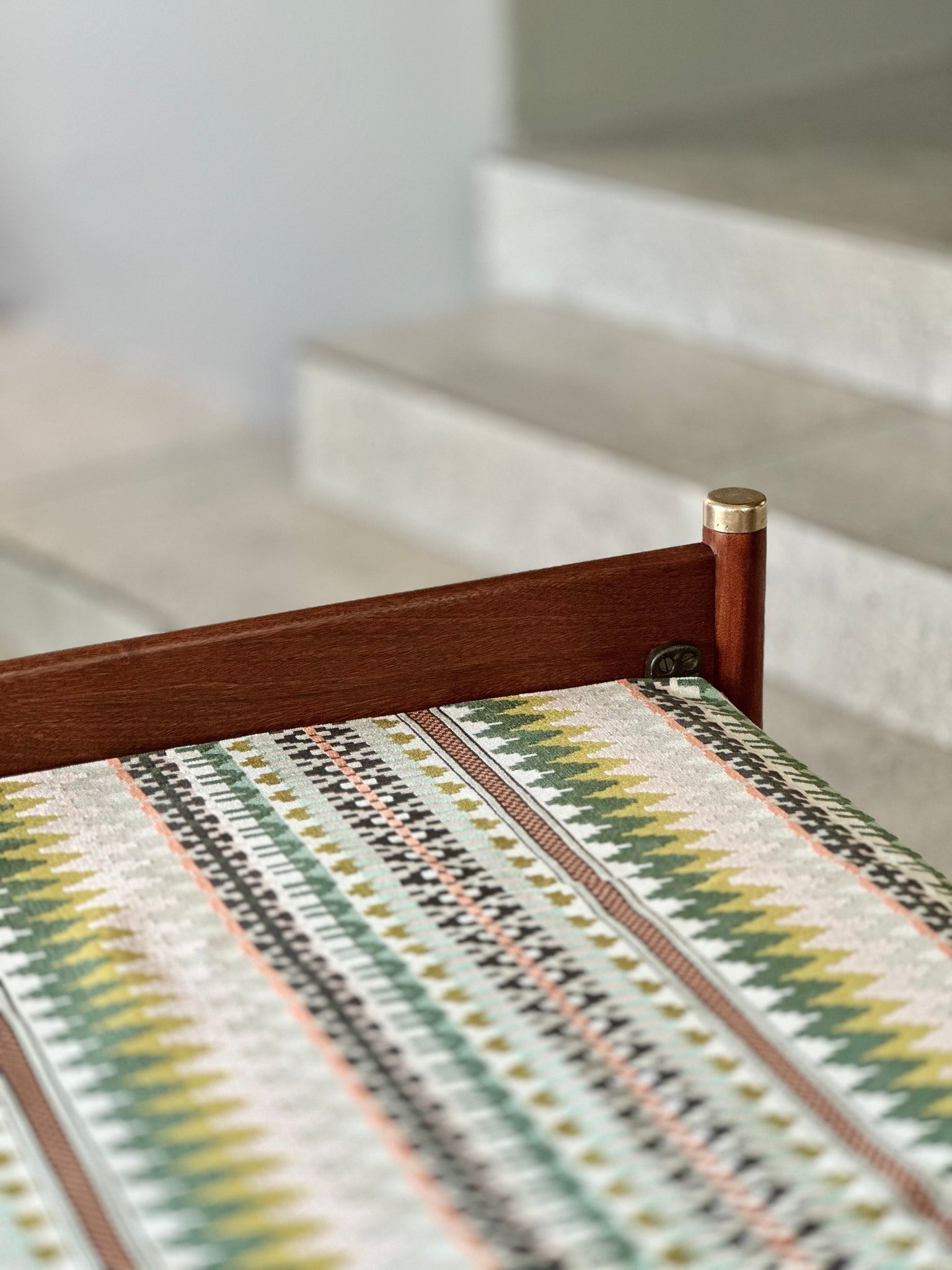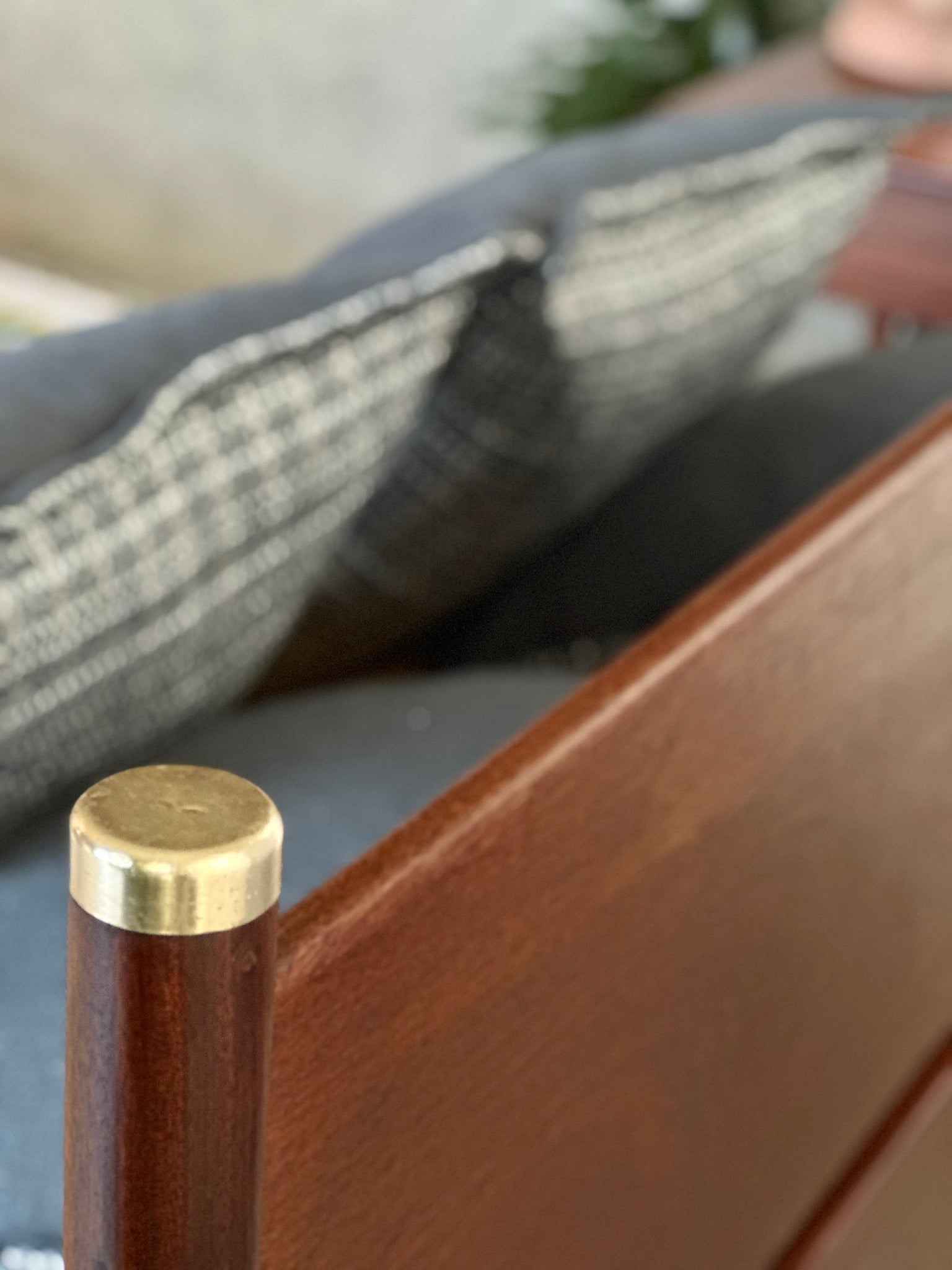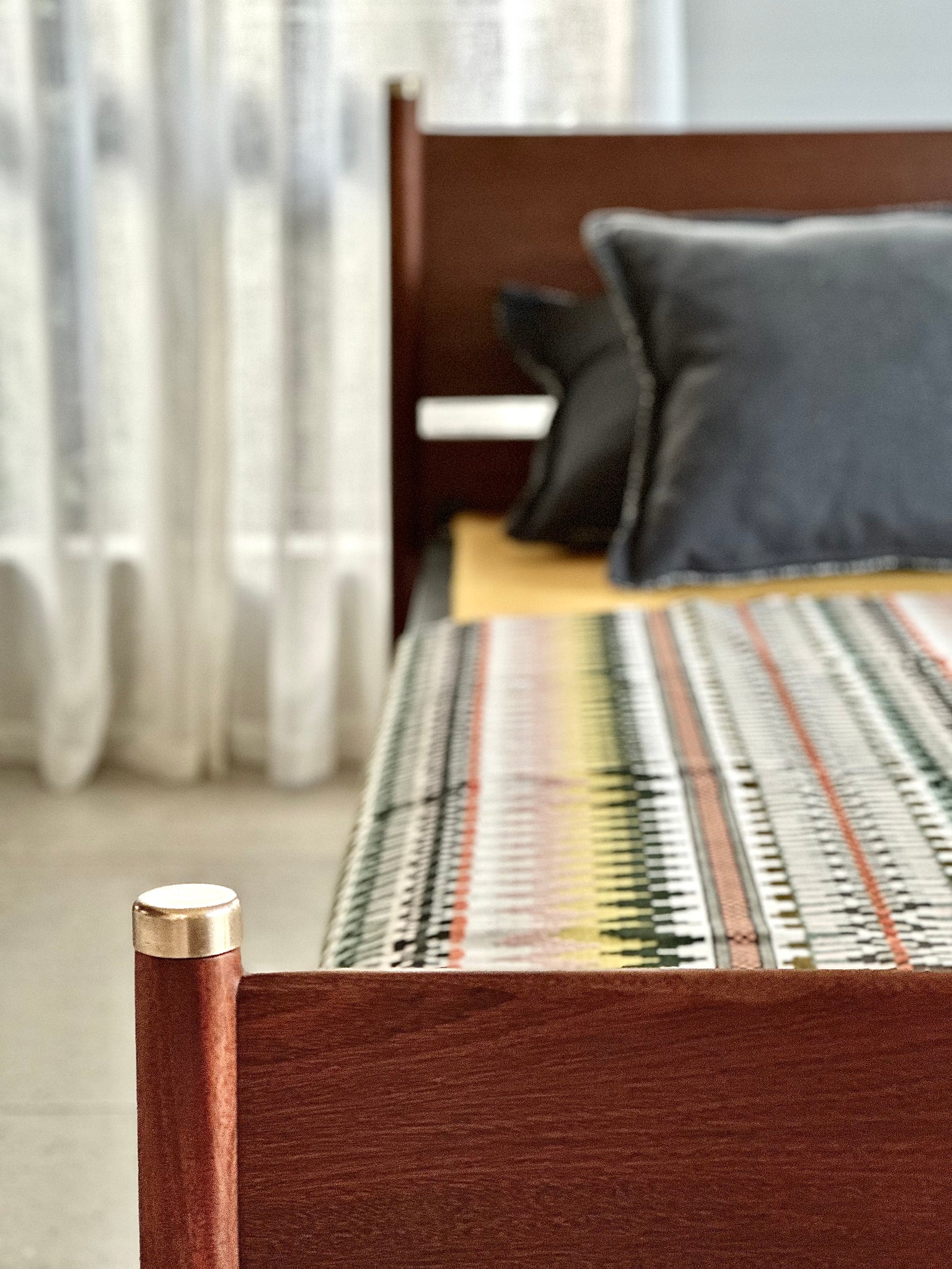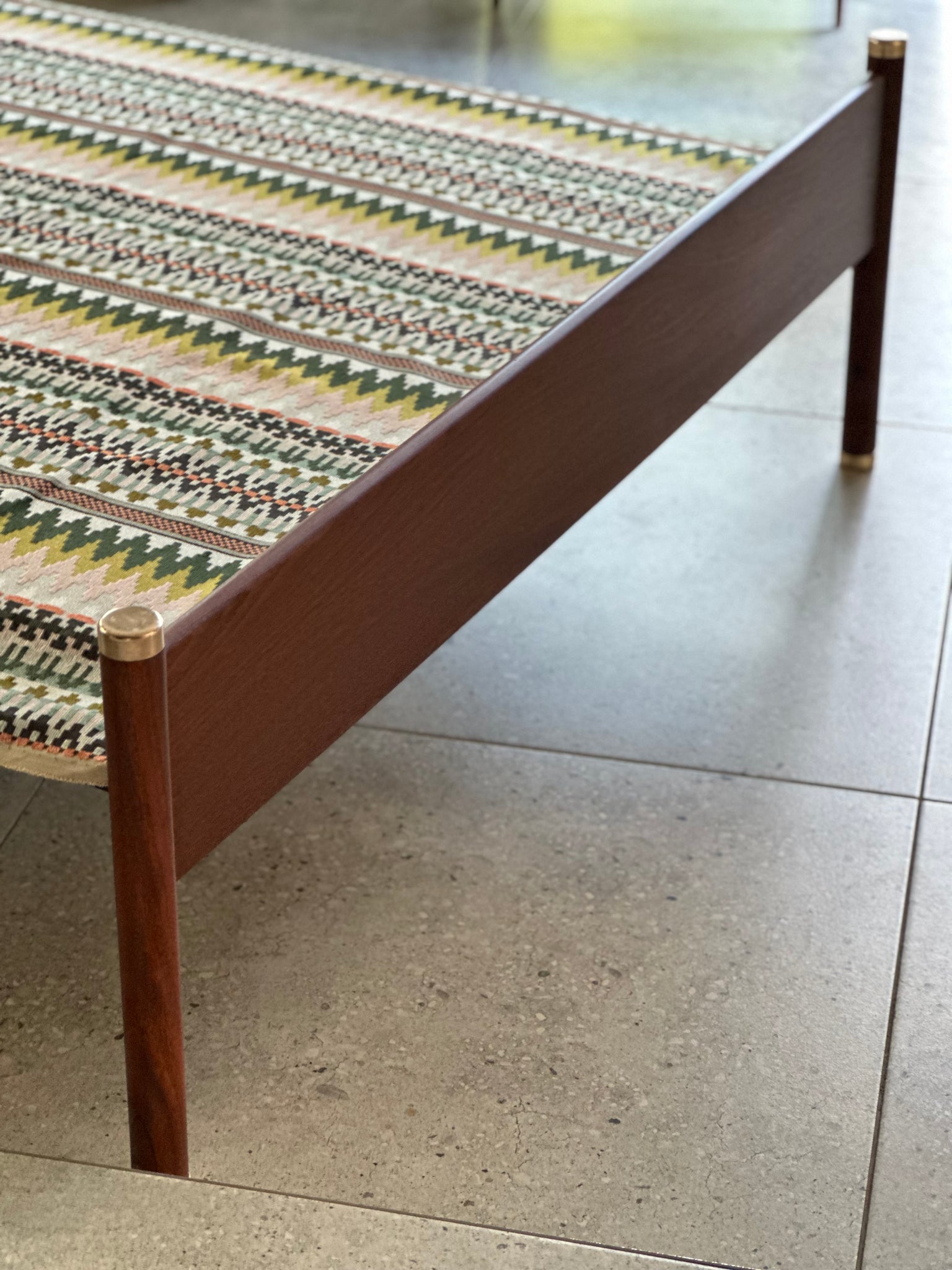 A finely crafted mid-century double bed showcasing the work of South African maker DS Vorster. The design combines a solid wood headboard and footboard in a warm, restored finish with a sturdy steel frame and spring base for long-lasting durability. Subtle brass-capped details highlight the refined lines and add a touch of elegance to the piece.