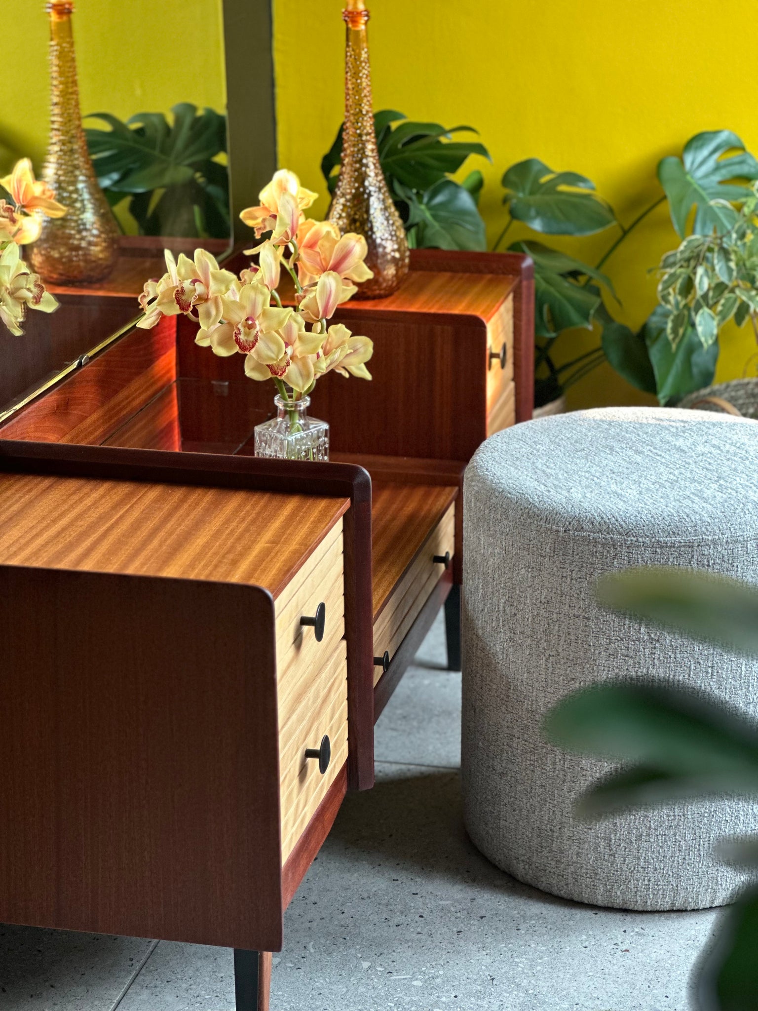 Fully restored and in excellent condition. The dresser’s mirror carries signs of age and use, perfectly consistent with its vintage provenance and adding to its authentic charm.