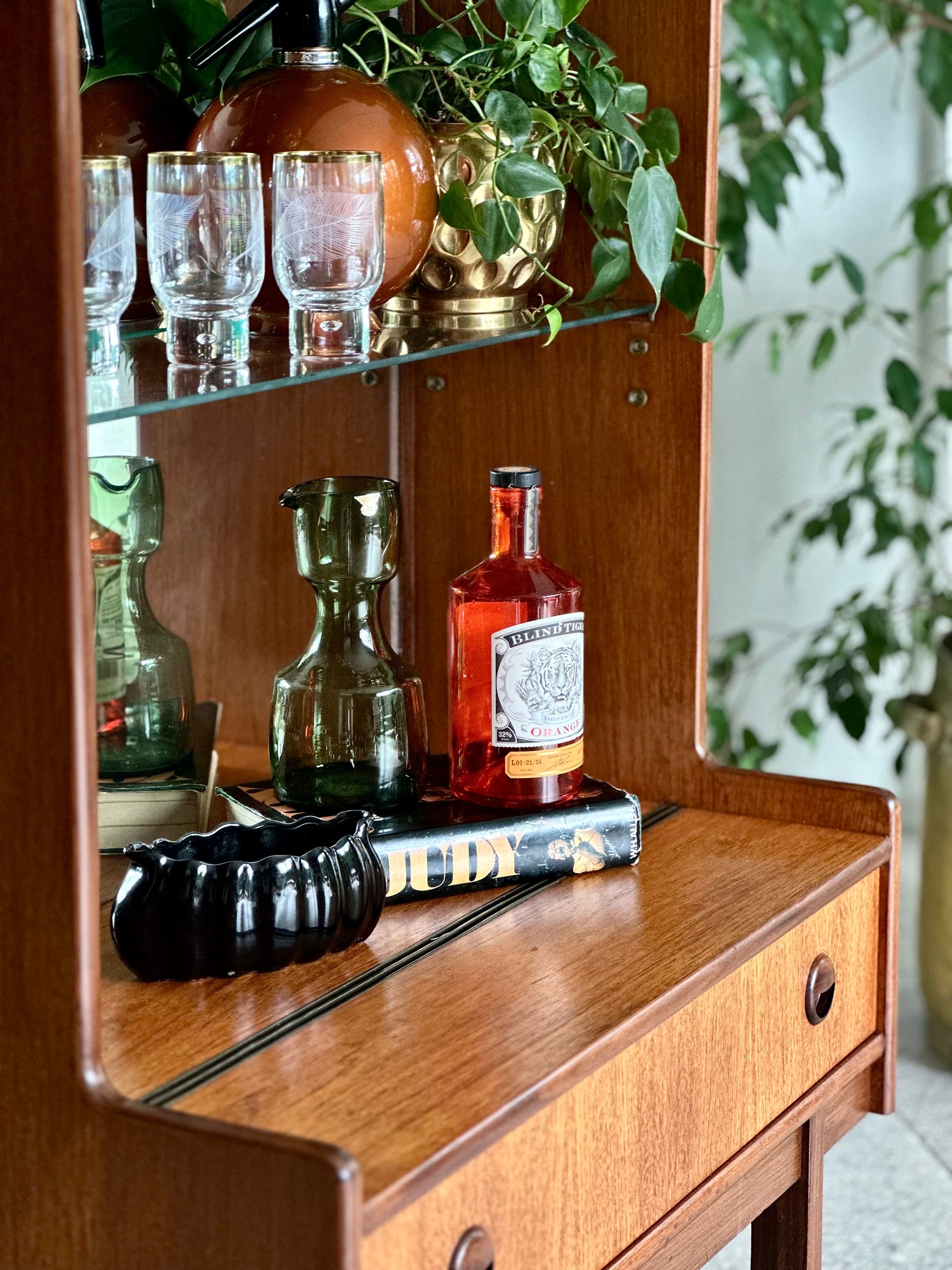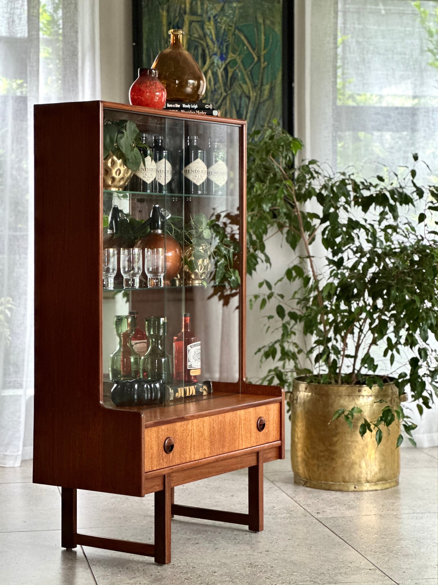 The upper display compartment presents as a refined drinks or showcase cabinet, now fitted with new glass sliding doors for both protection and practicality. Internally, the cabinet features a glass shelf, and an additional custom-cut glass shelf has been added to enhance display capacity while maintaining visual lightness. The interplay between teak framing and glass creates that unmistakable 1960s British modern aesthetic, functional yet quietly elegant.