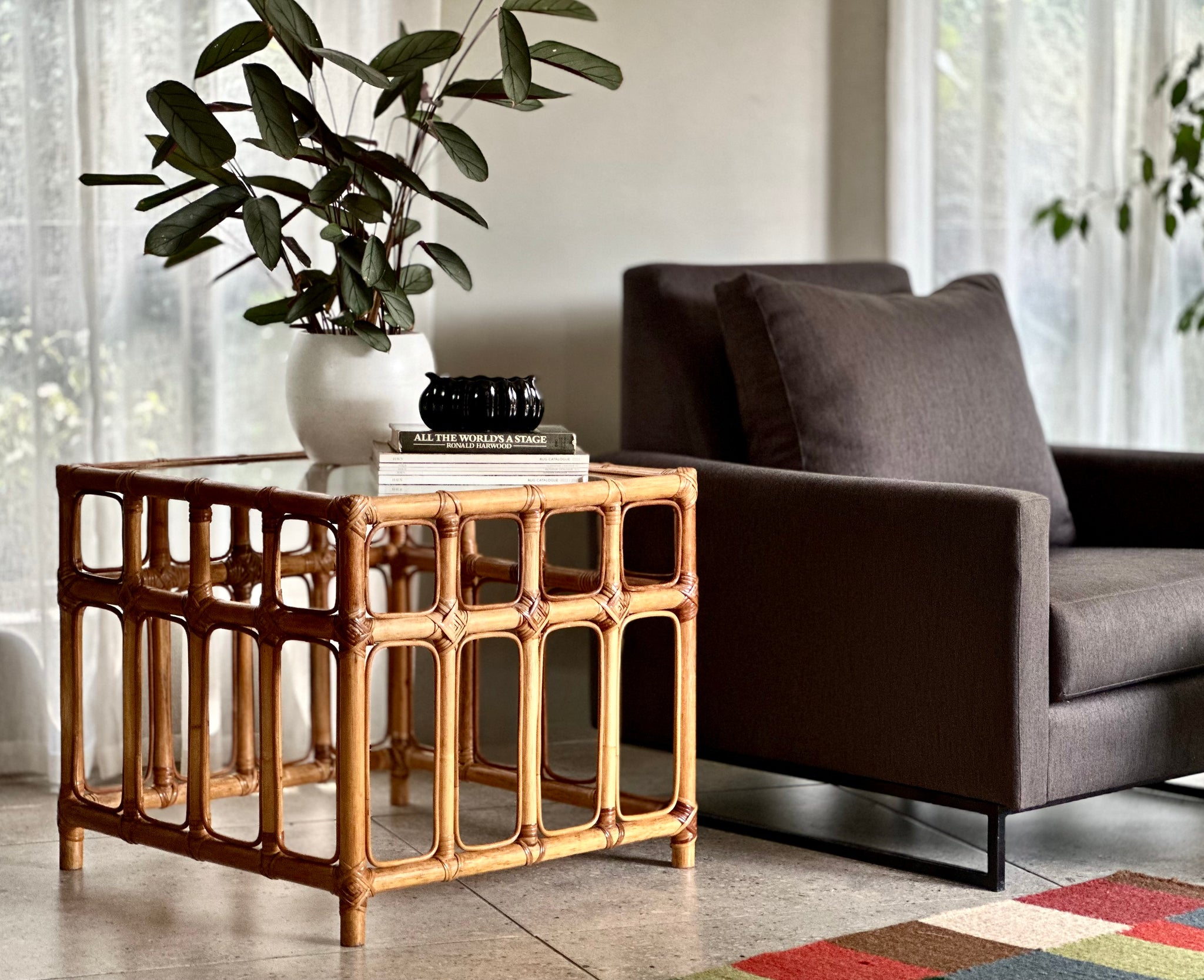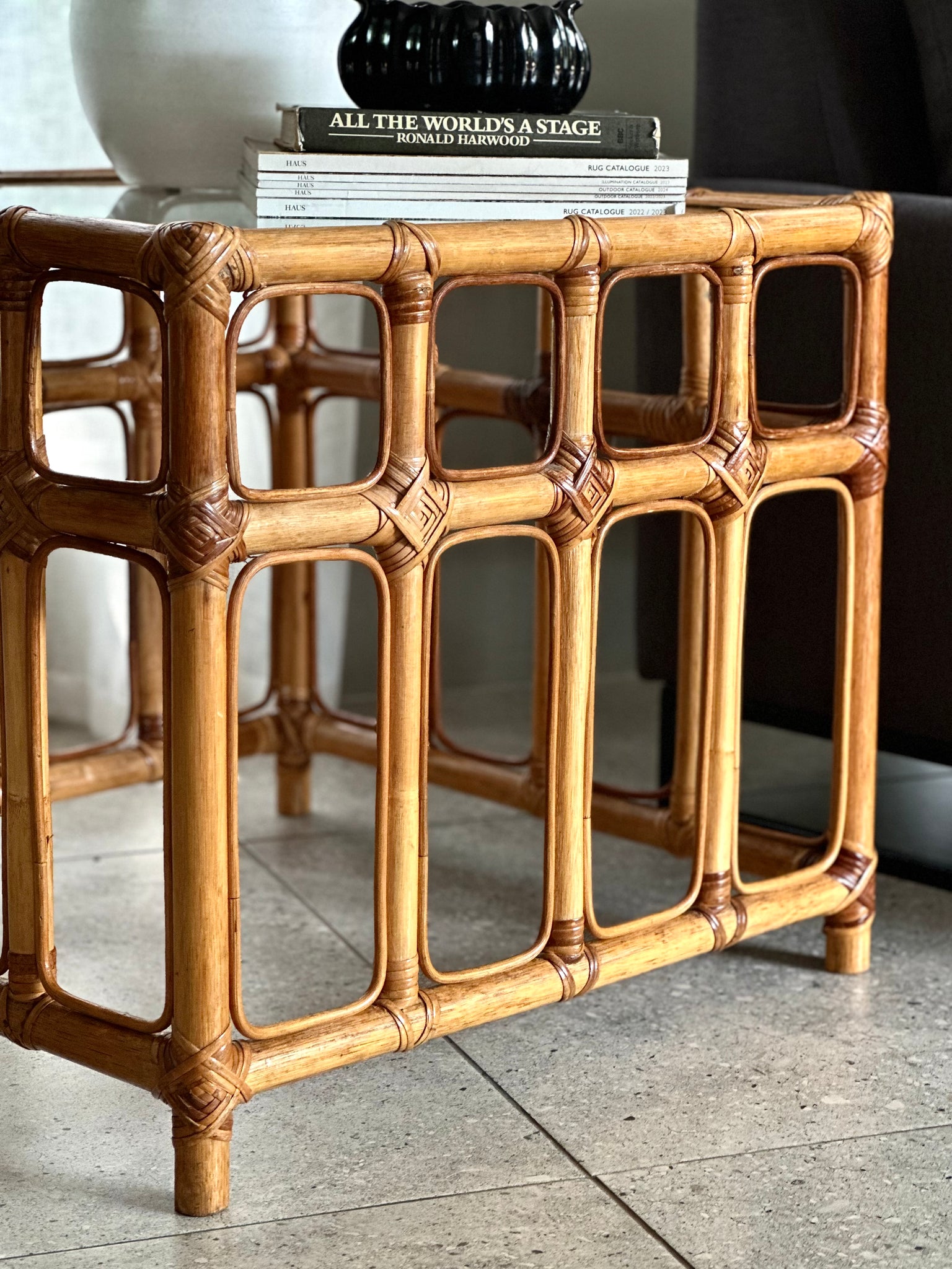 The frame forms a striking geometric grid that feels light. The warm honey tone of the cane highlights the natural texture and craftsmanship, while the repeated wrapped intersections add subtle decorative detail from every angle.
