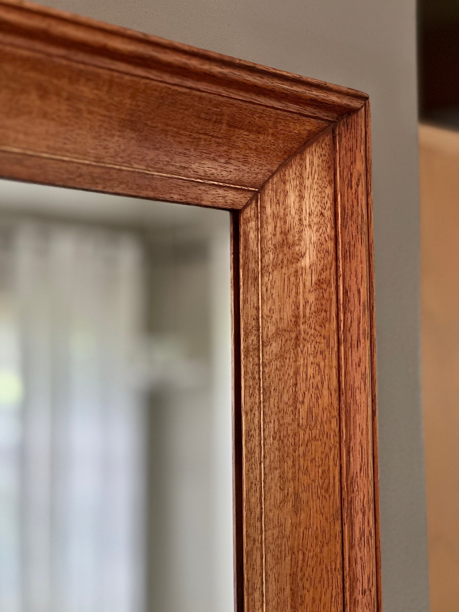 A beautifully framed wall mirror set in a solid timber frame with warm, rich grain that adds depth and character. The clean rectangular form is softened by subtle stepped detailing along the inner edge, giving the piece a refined, timeless feel.