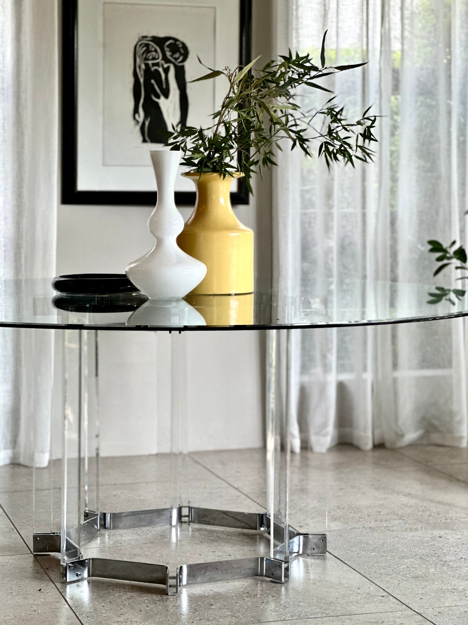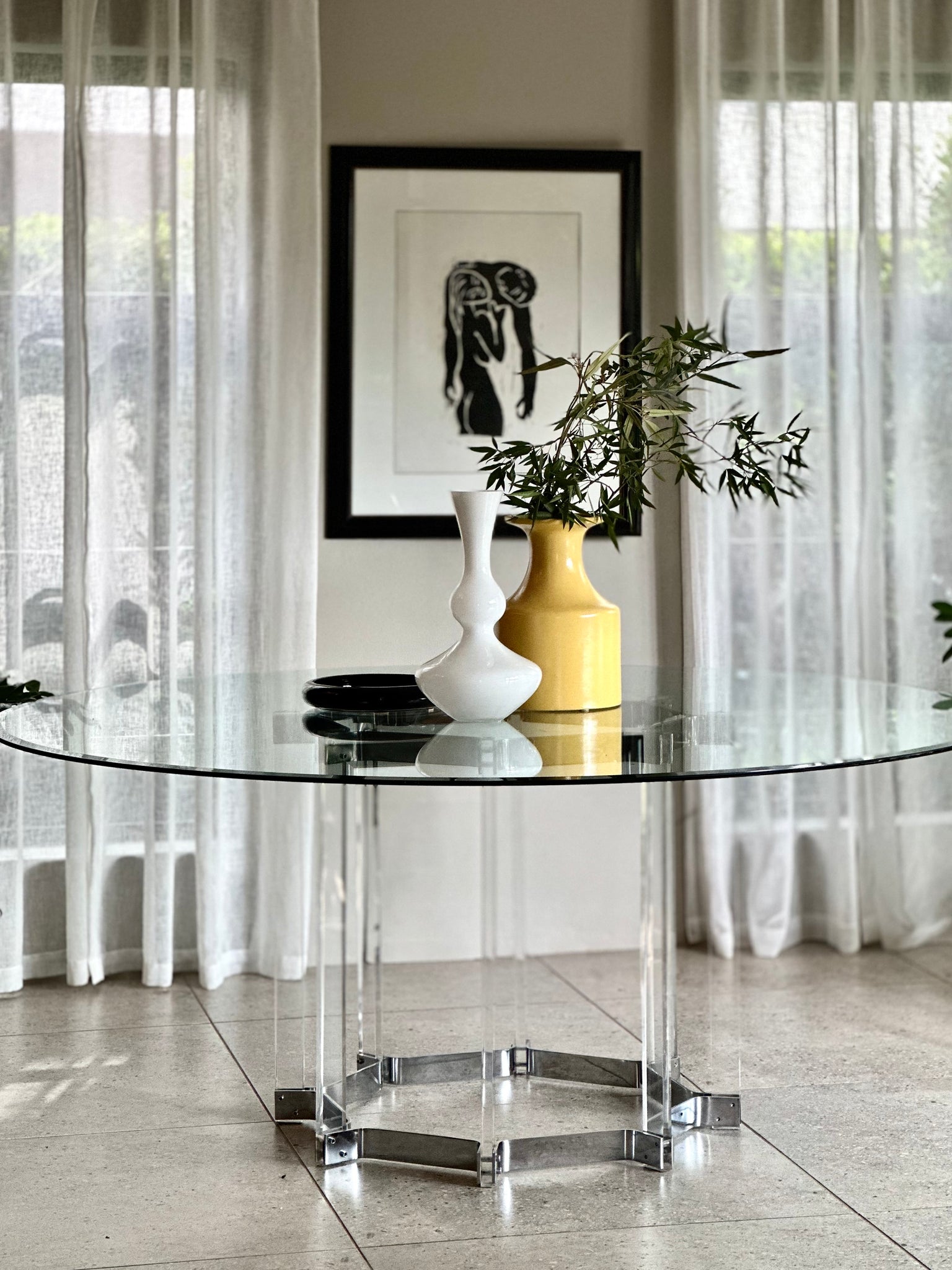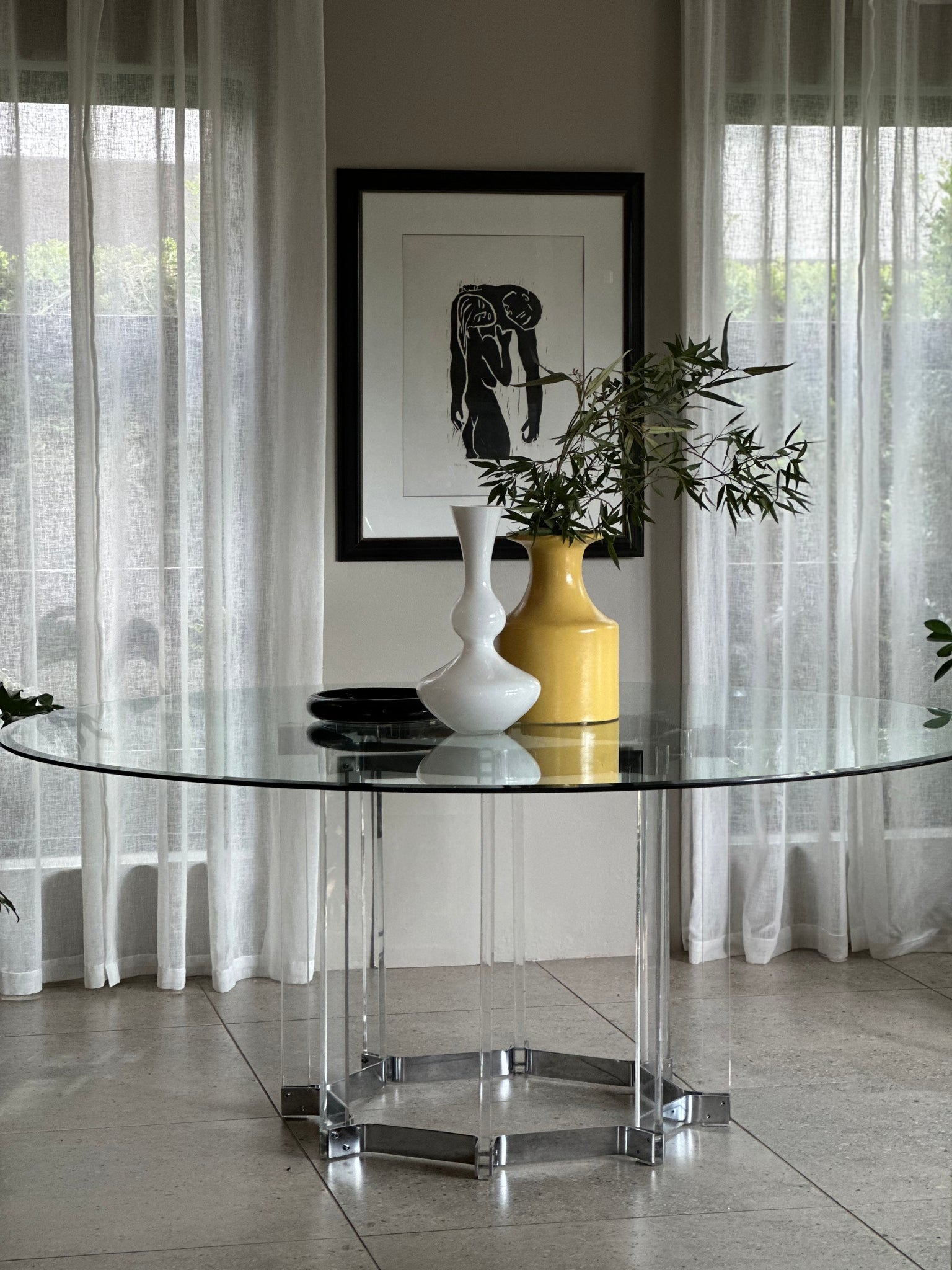 A stunning dining room table featuring a captivating blend of lucite and chrome. Its exquisite octagon-shaped base creates a truly remarkable centerpiece for any dining area, perfectly complementing various interior designs.