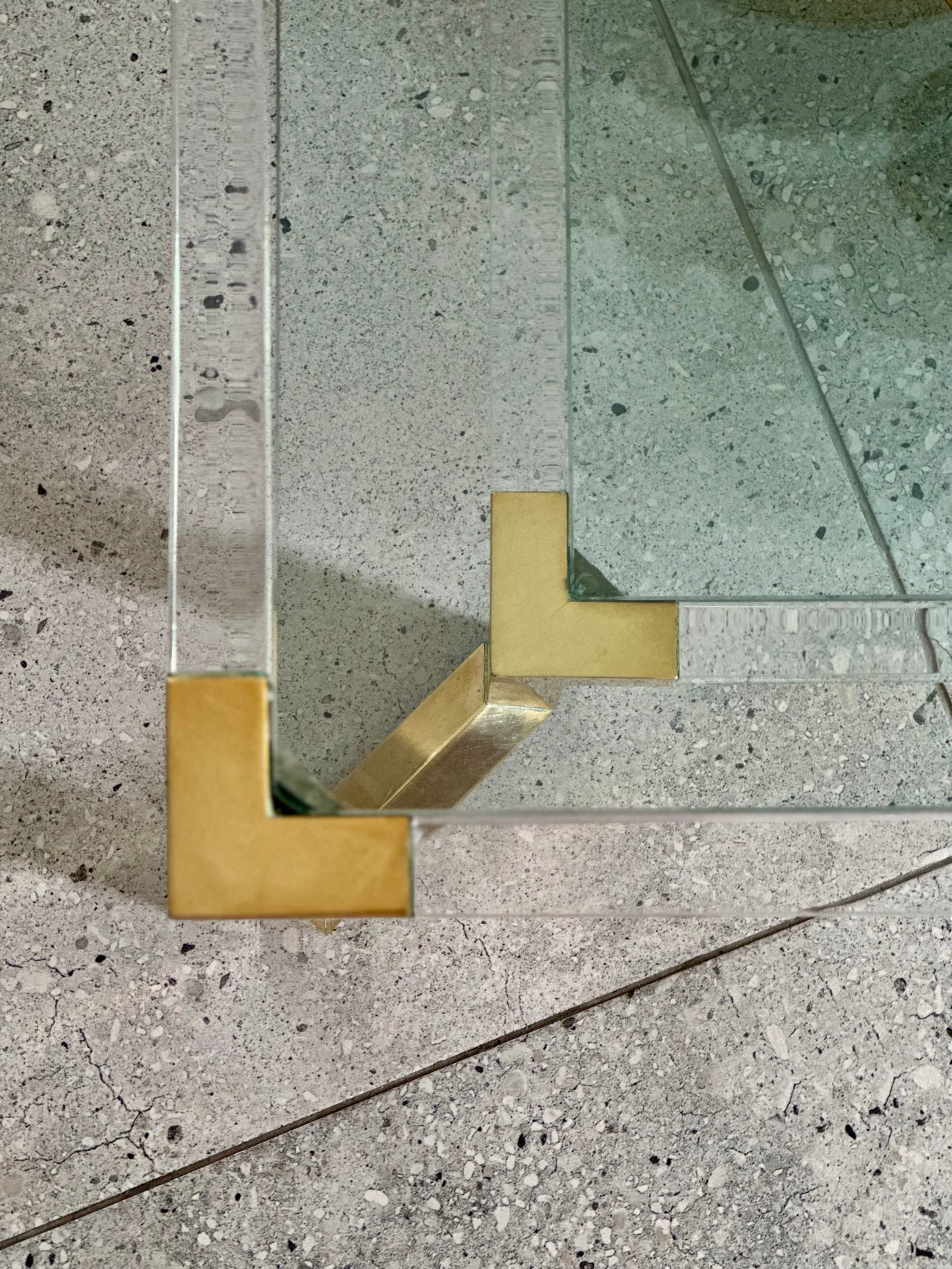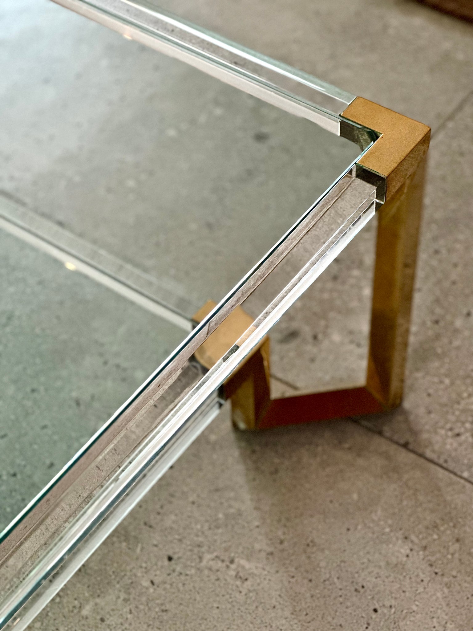 The table’s squared, geometric silhouette nods to high-end 1970s Hollywood Regency design style, possibly Design Benedict, where transparency, metallic accents, and architectural lines defined luxury. Whether styled with books and objets or left minimal to showcase its form, this table elevates any lounge, reading nook, or curated living space with effortless sophistication.