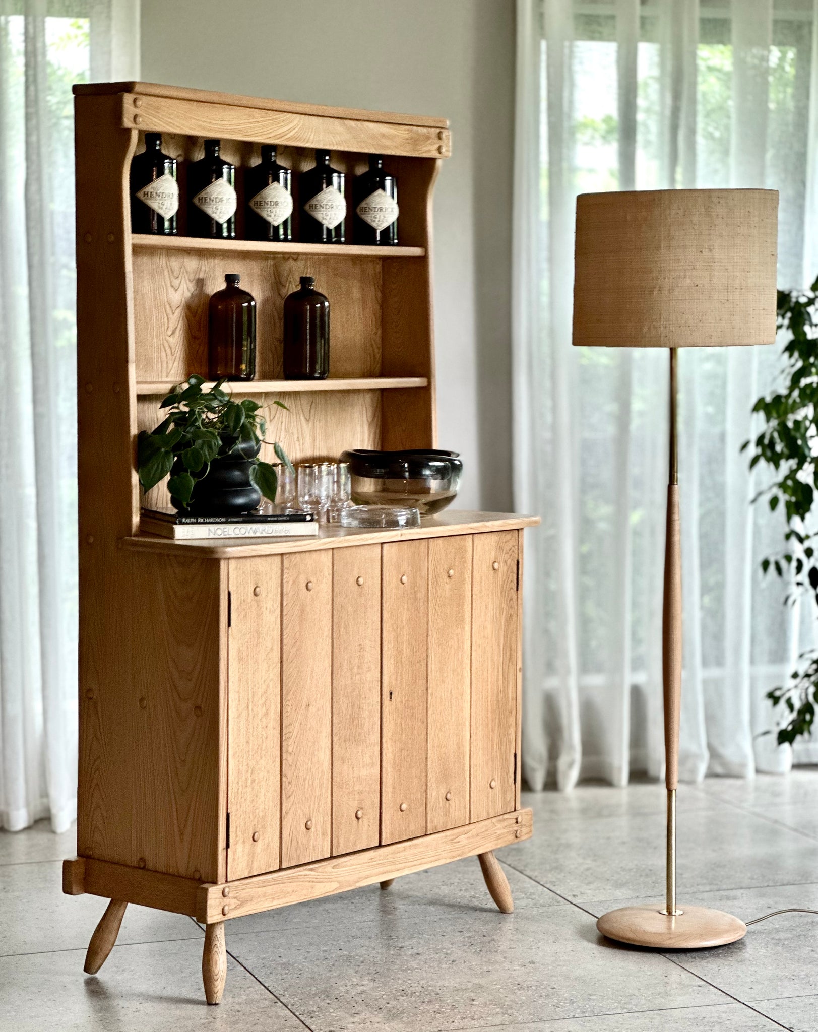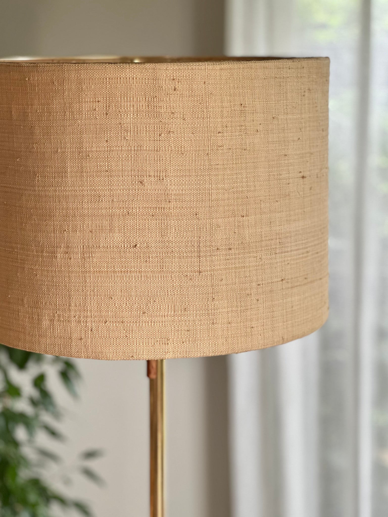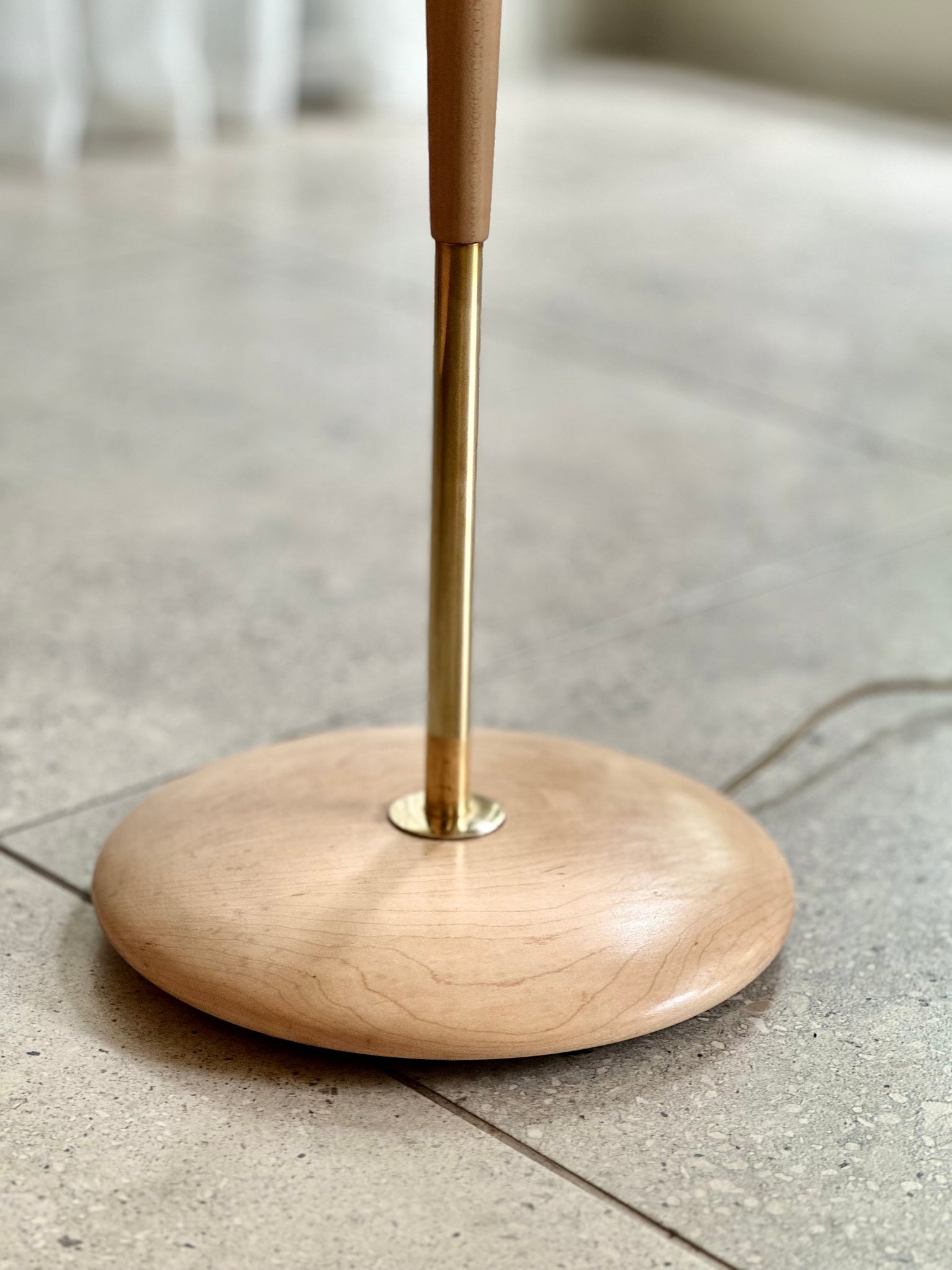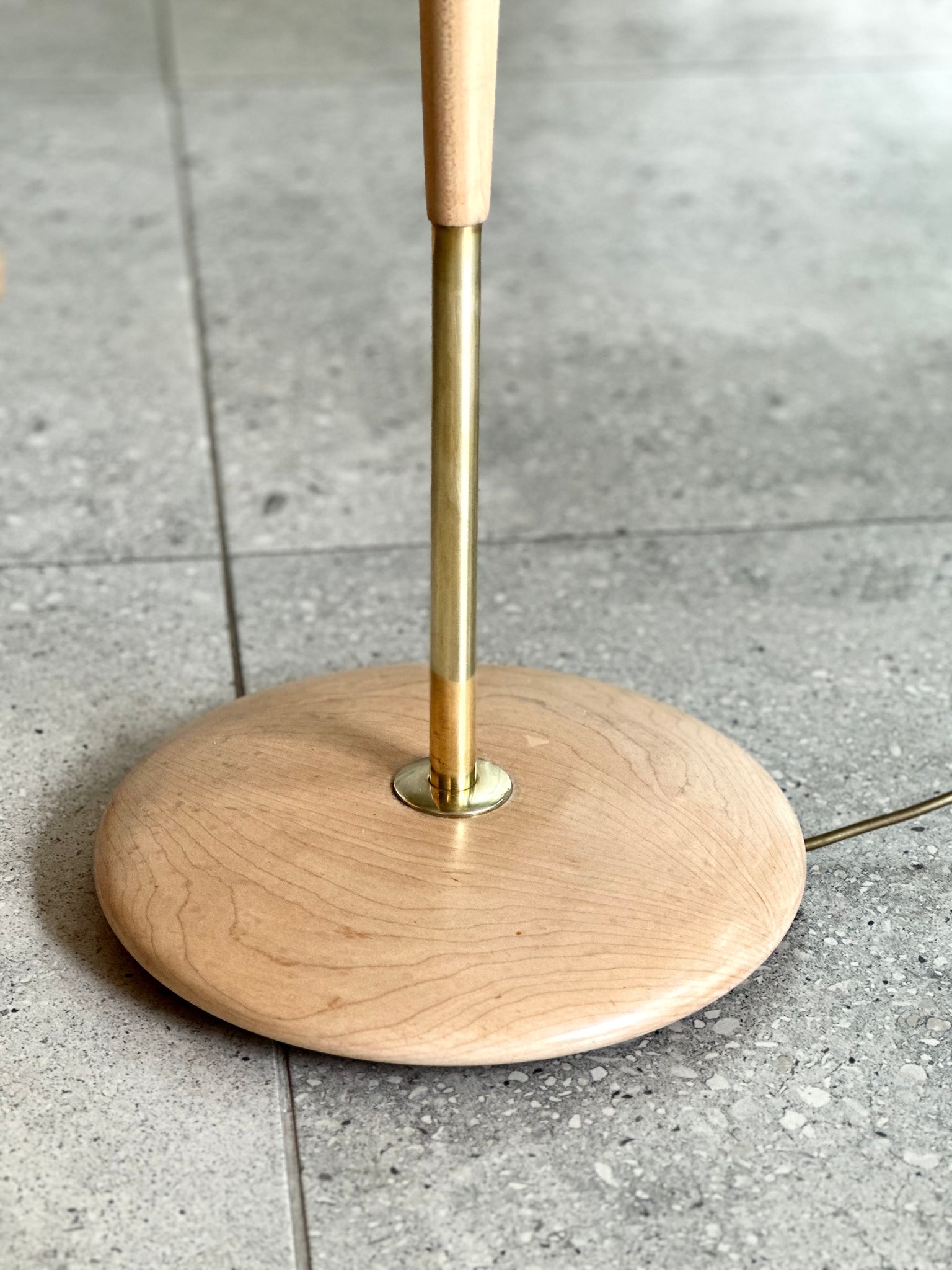 A beautifully composed mid-century floor lamp, defined by its warm material palette and refined, sculptural form.