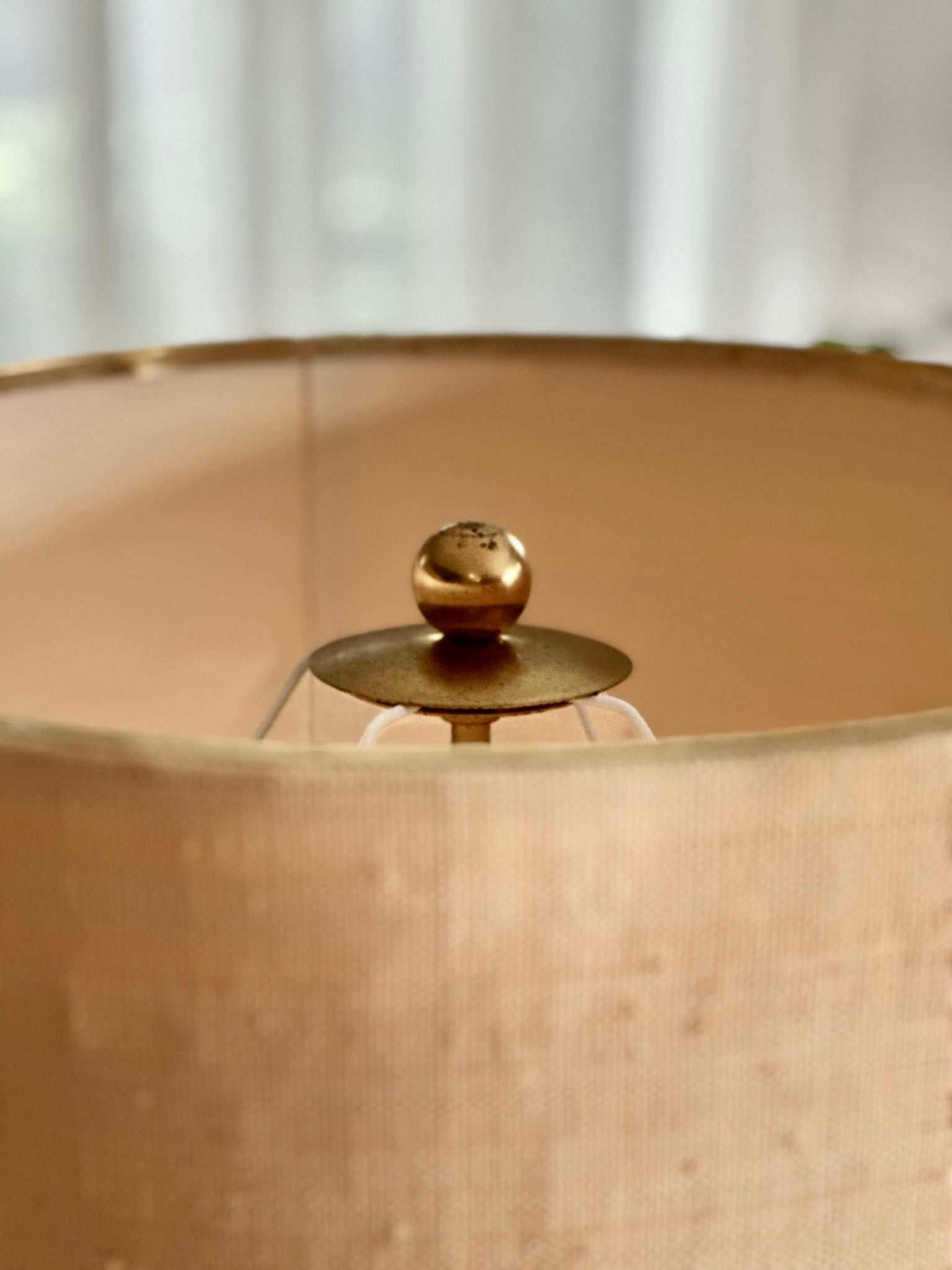 The vintage shade remains intact, finished in a natural woven fabric that casts a warm, ambient glow. Internally, the dual bulb fitting enhances light output, making it both atmospheric and practical for everyday use.