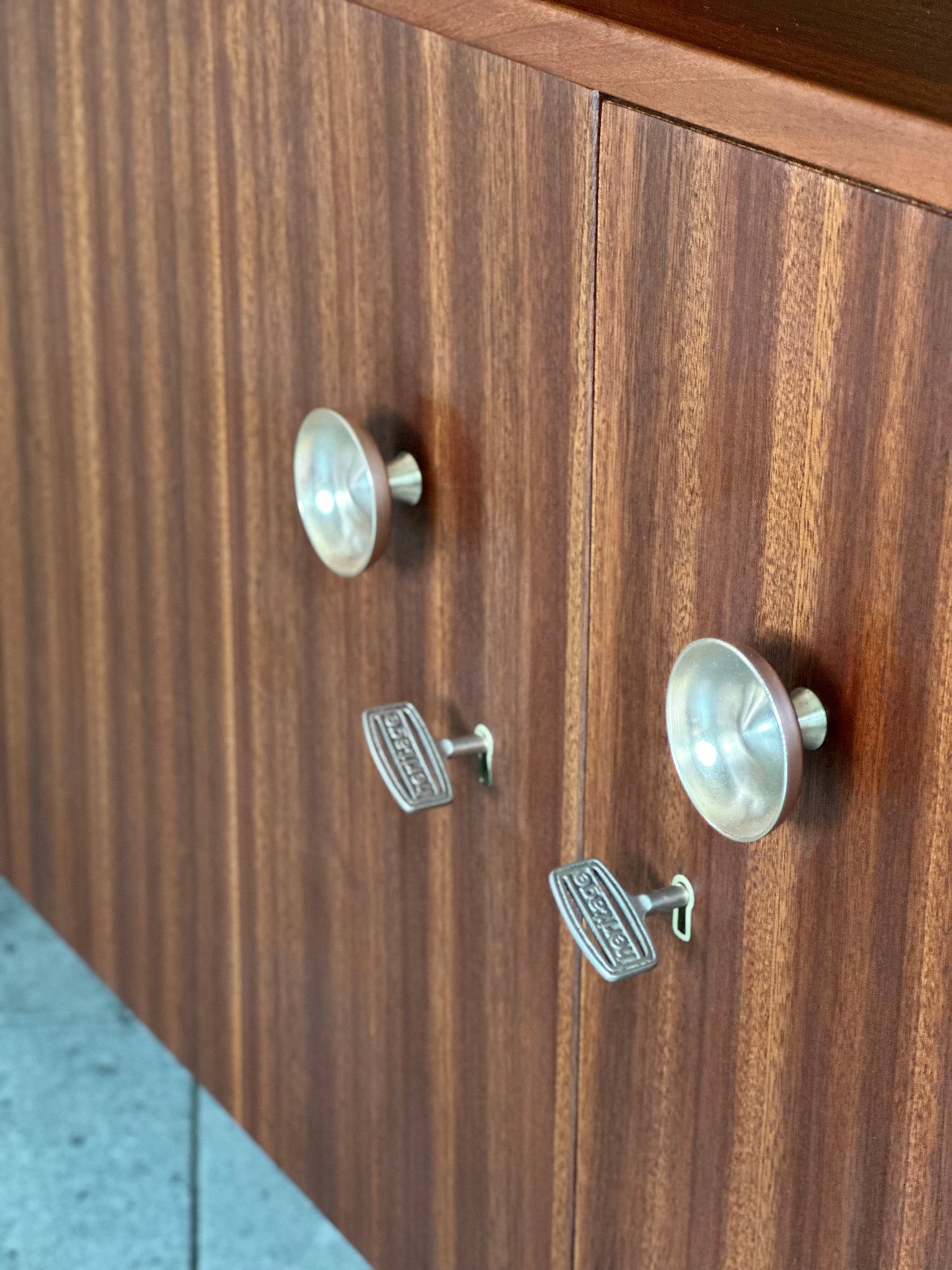As with many Mid-Century pieces, this item features a thoughtful combination of solid wood and high-quality wood veneer. Veneer has a long and respected tradition in furniture making, valued for both its aesthetic and structural benefits. When crafted with skill and applied in substantial thickness, vintage veneer proves highly durable, allowing for careful restoration, including retouching, sanding, and refinishing without compromising the integrity of the piece.