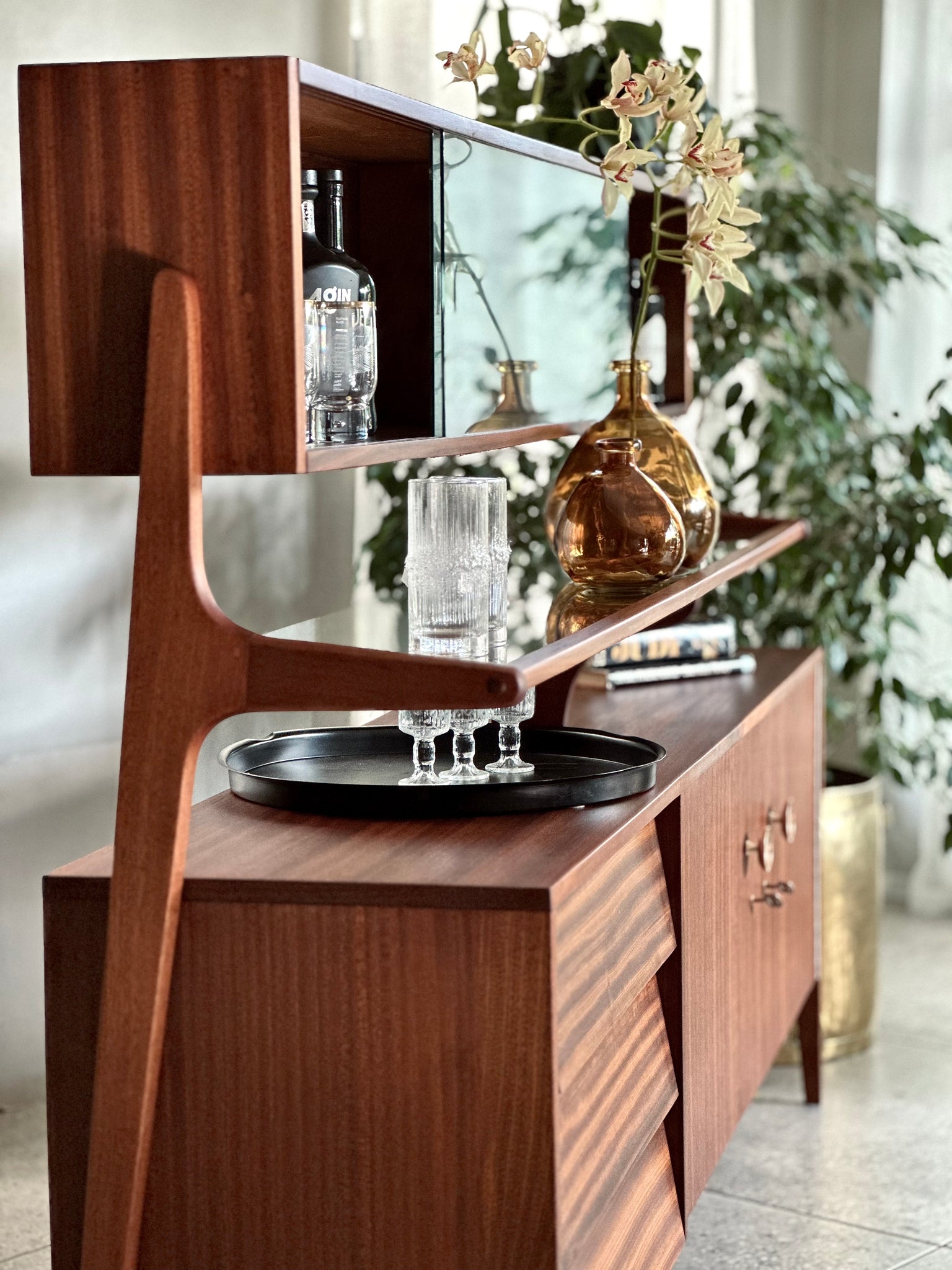 • Upper storage with glass doors, perfect for glassware, books, or décor, framed by sculptural supports that give the piece its distinctive Mid-Century character.