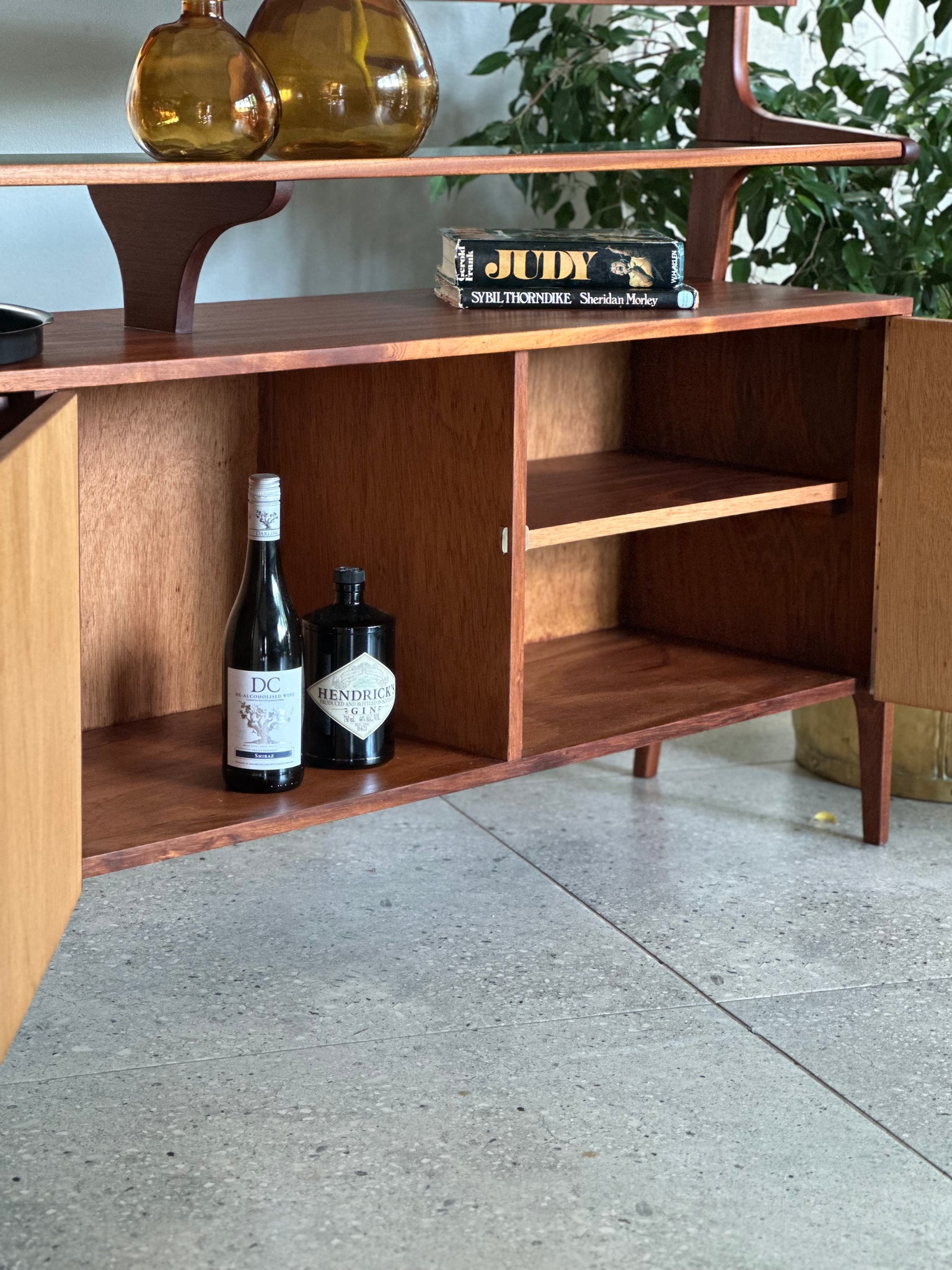 An exceptional example of South African Mid-Century Modern craftsmanship, this "Heritage Furniture" high-board and/or drinks cabinet embodies the refined aesthetic and build quality that made the brand a hallmark of the era.
