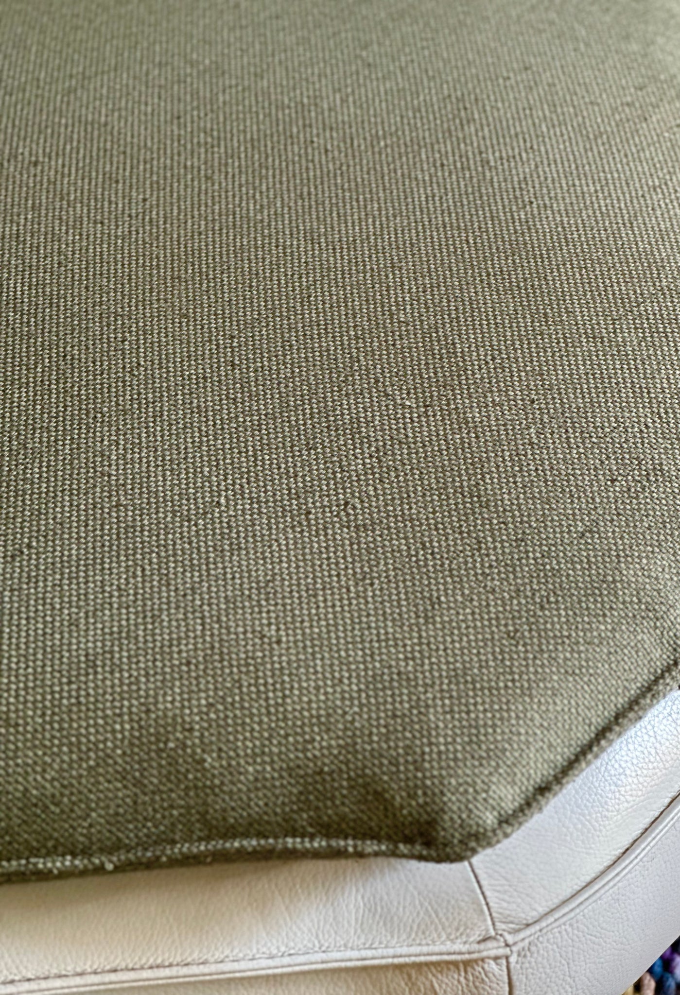 A true statement in Italian design, this spectacular modular couch is by Chateau d’Ax. It offers versatility, comfort, and presence in equal measure. Upholstered in supple white, genuine leather, the seating is offset with textured light sage fabric cushions, creating a sophisticated contrast in both tone and texture. The set is marked throughout.
