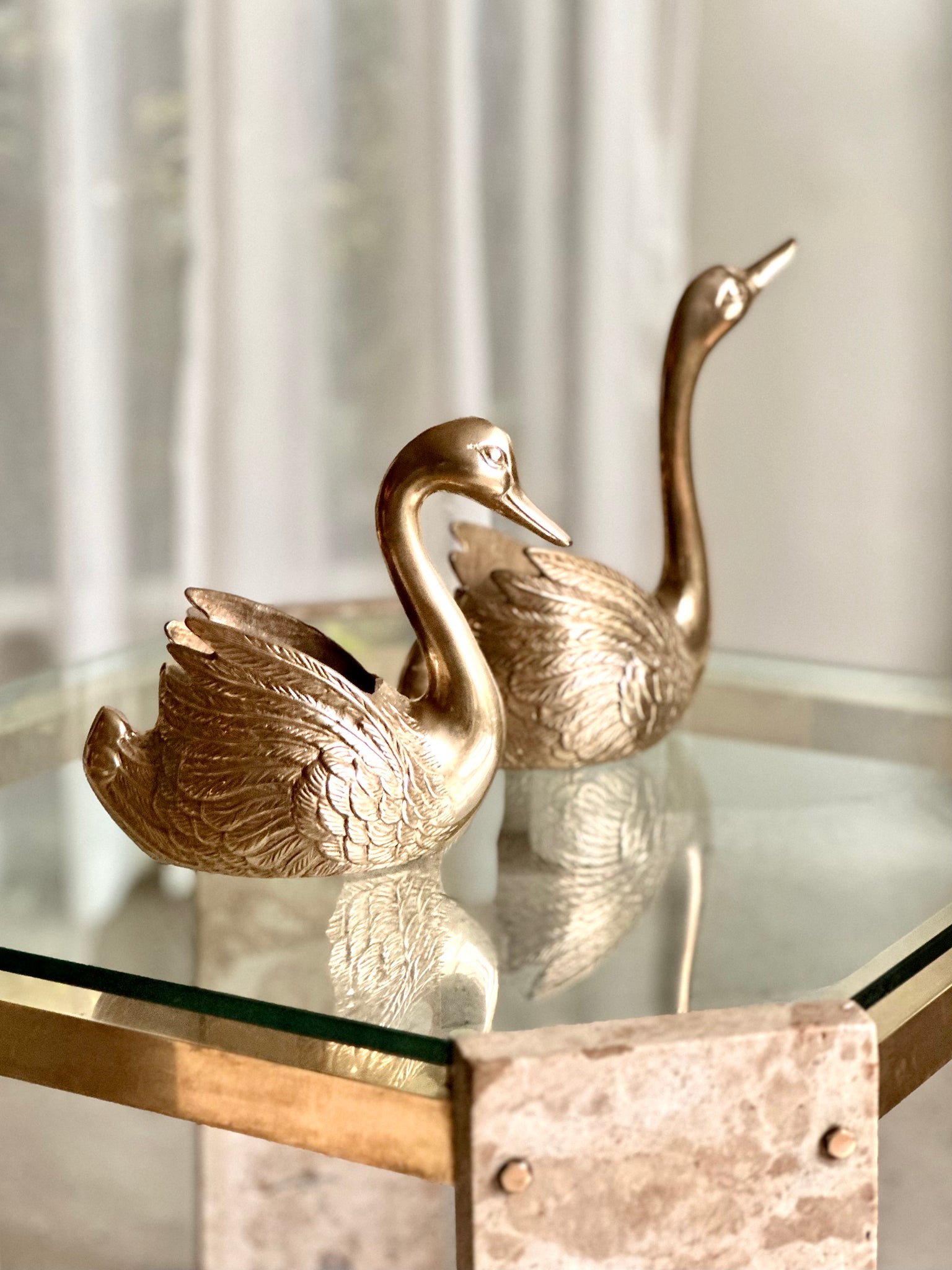 A beautifully styled vintage brass swan set, each swan is elegantly formed with gently curved necks and finely detailed feathering, finished in a warm brass tone that catches the light beautifully.