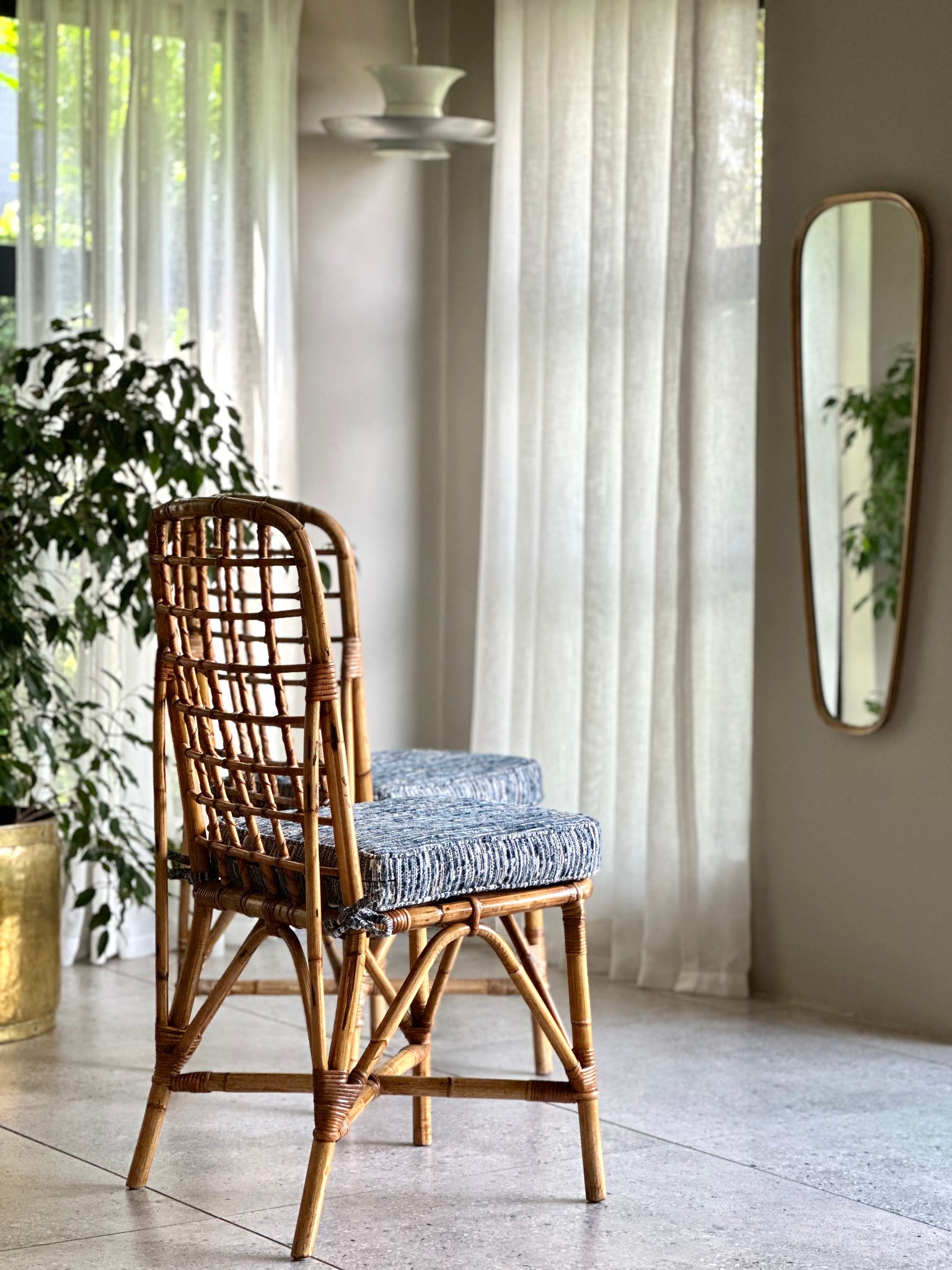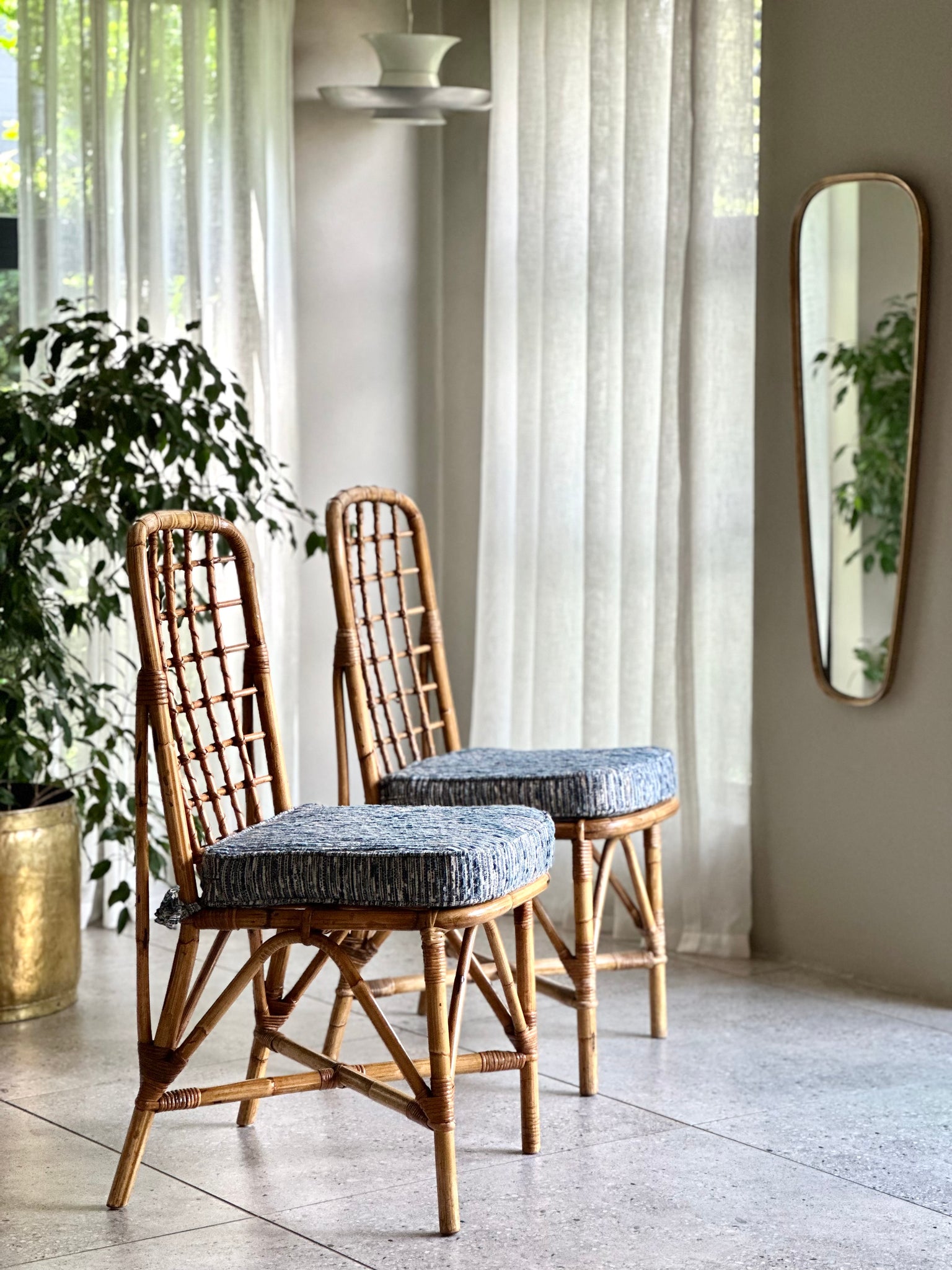 A charming and characterful pair of cane side chairs, where natural material and relaxed design come together effortlessly. Perfect at heads of a table or occasional use under patio use.