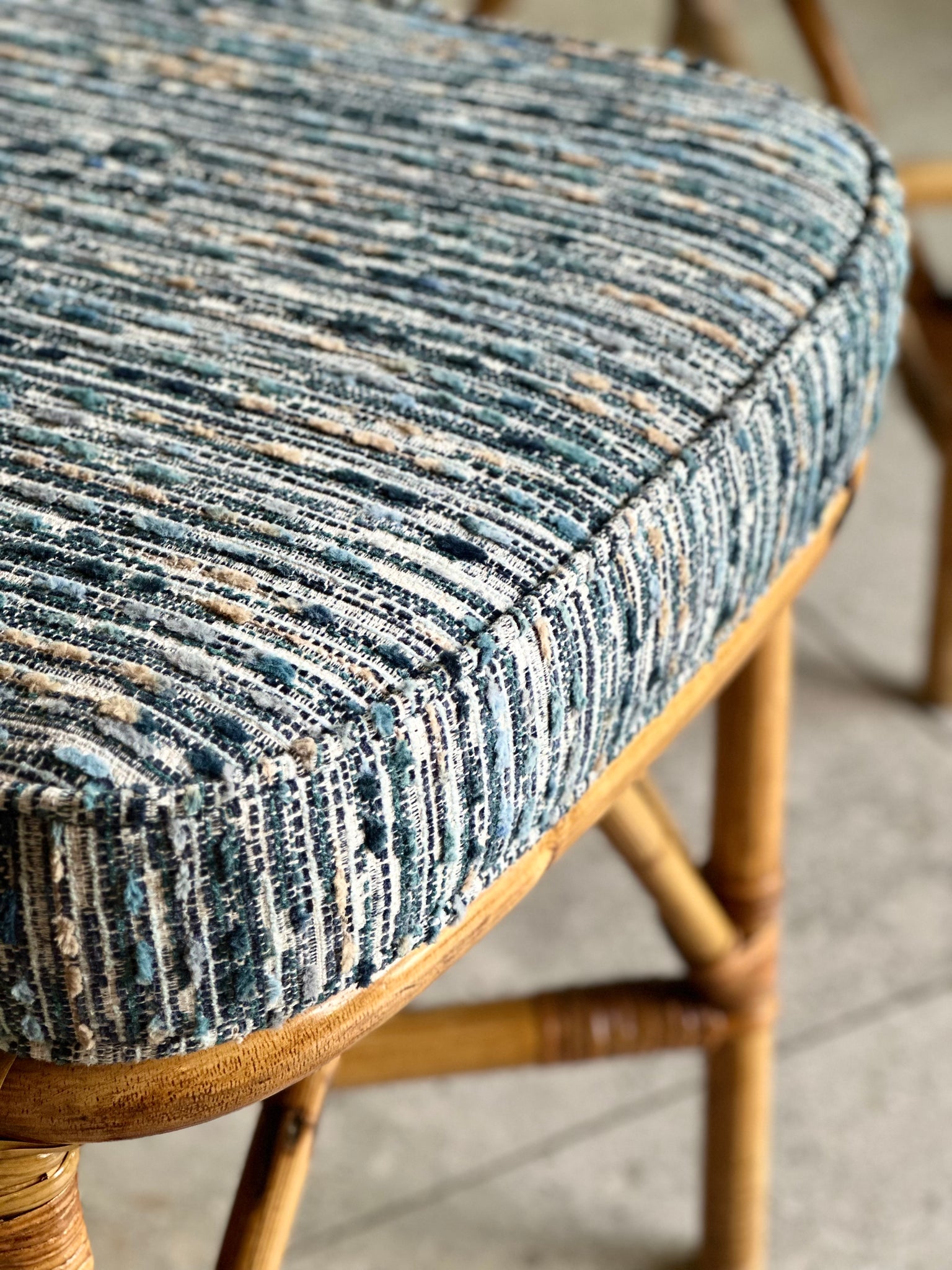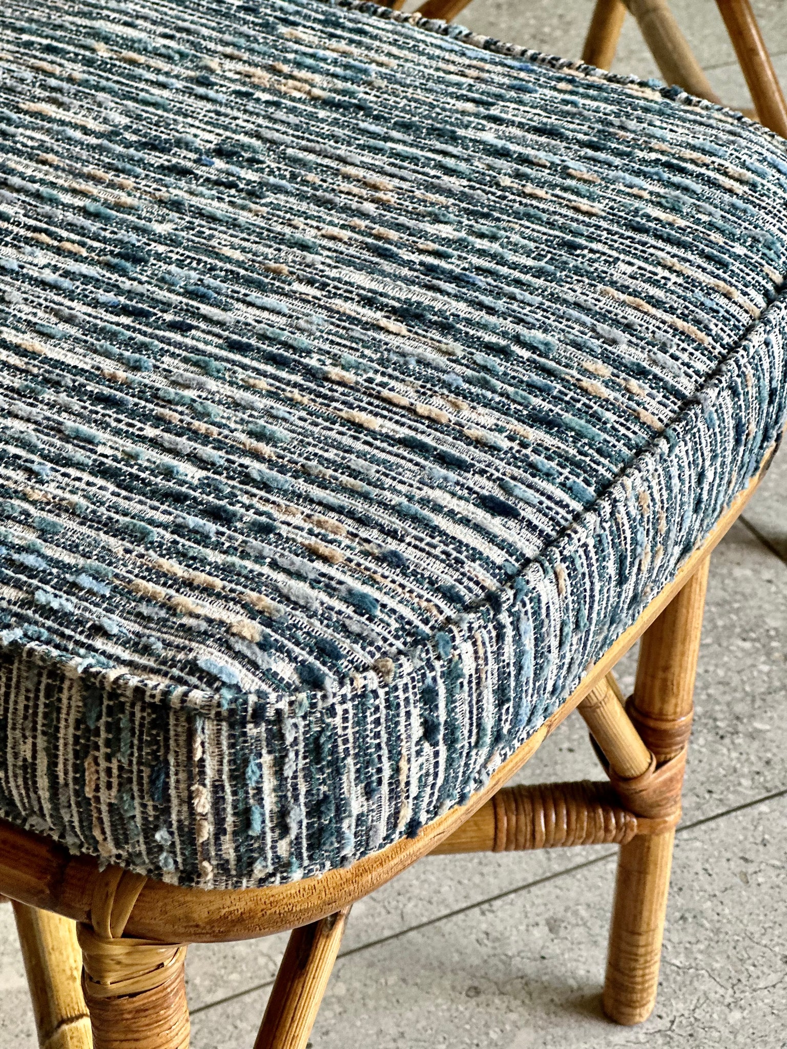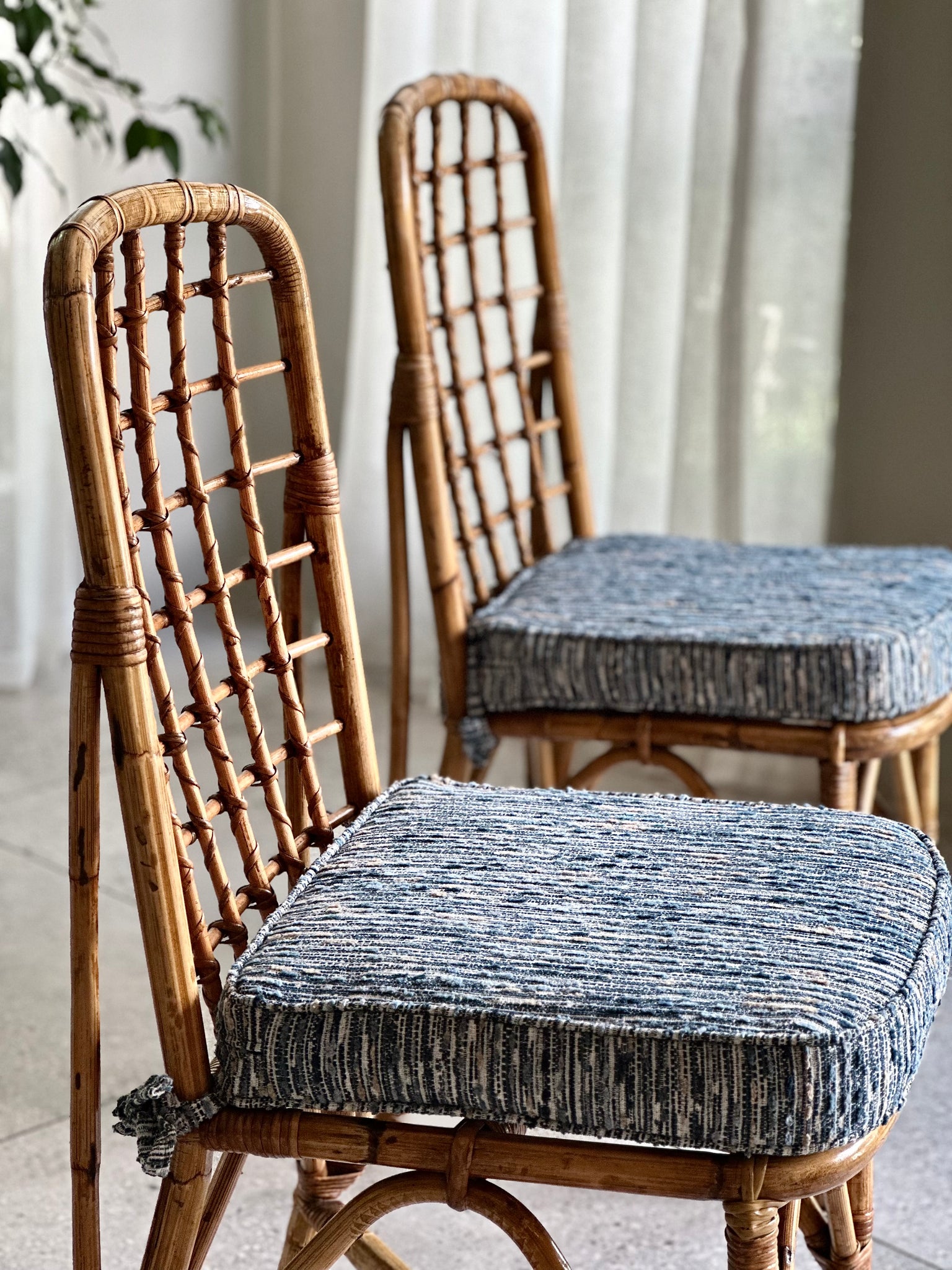 The seats have been updated with newly made cushions in a richly textured fabric, blending layered tones of blue and natural hues. Generously padded for comfort, the cushions make these chairs as practical as they are visually appealing.