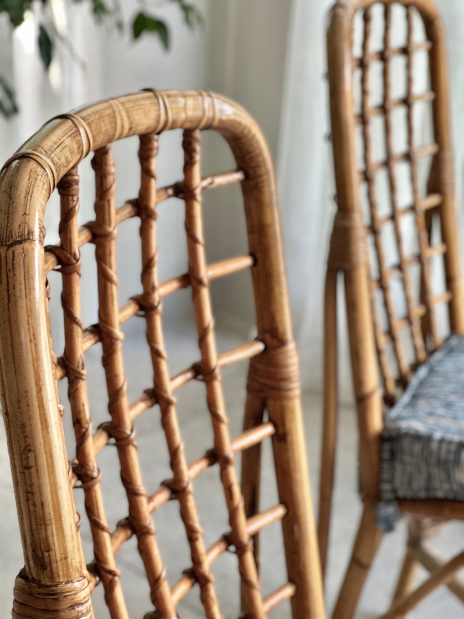 Crafted in warm-toned cane, these chairs feature beautifully shaped frames with softly curved backrests and a distinctive lattice-style back detail. The construction highlights the organic nature of the material, with wrapped joints and subtle tonal variation throughout, giving each chair its own unique character.