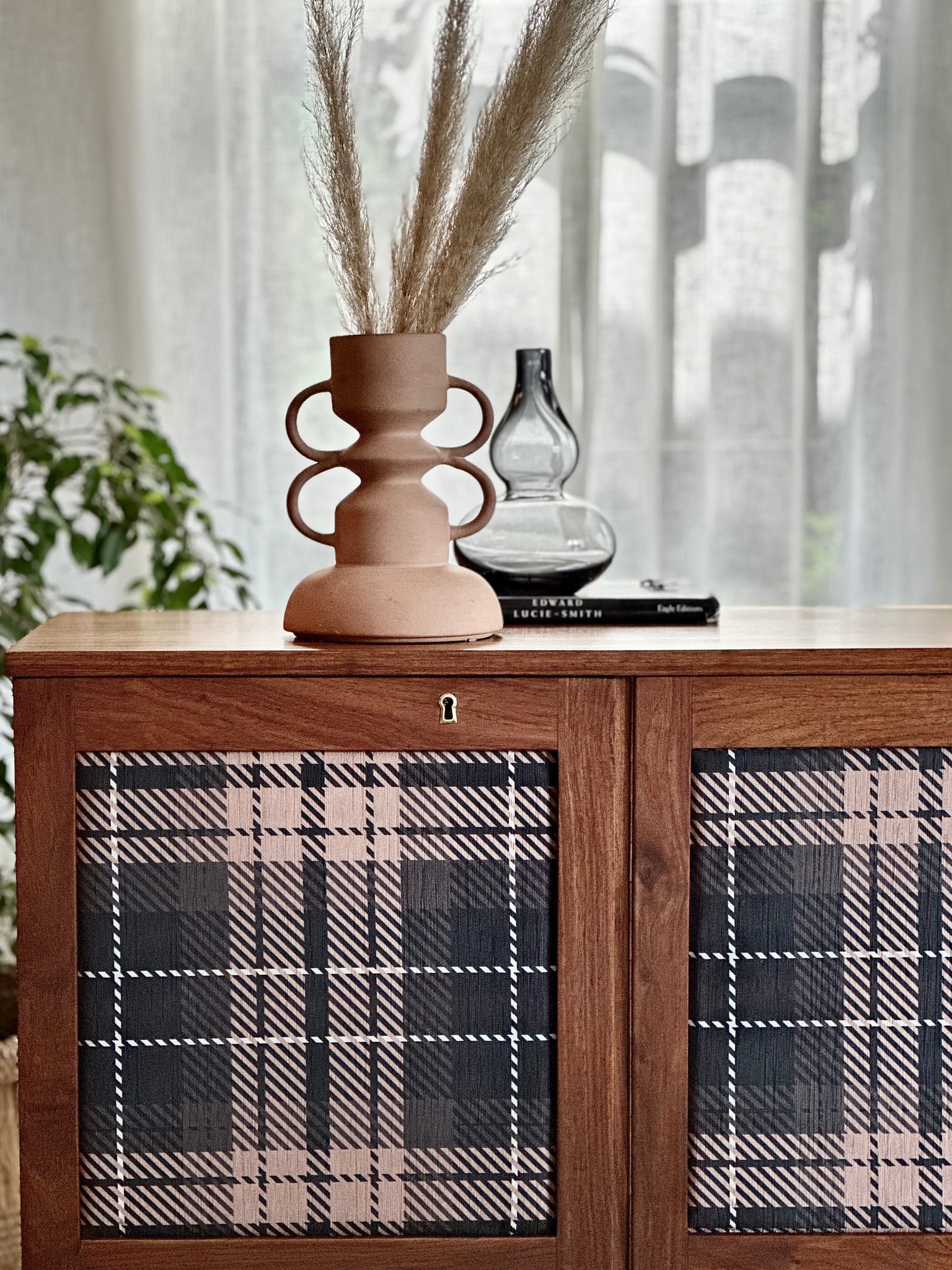 This elegant vintage sideboard in Kiaat has been thoughtfully reimagined to highlight both its craftsmanship and its versatility. Originally designed with faux black leather panelling, the unit has been given a contemporary update with bespoke fabric-covered panels in a bold plaid pattern, adding a striking layer of texture and individuality to the piece - mix of charcoal shades, black, white and a pale terracotta pink tones.