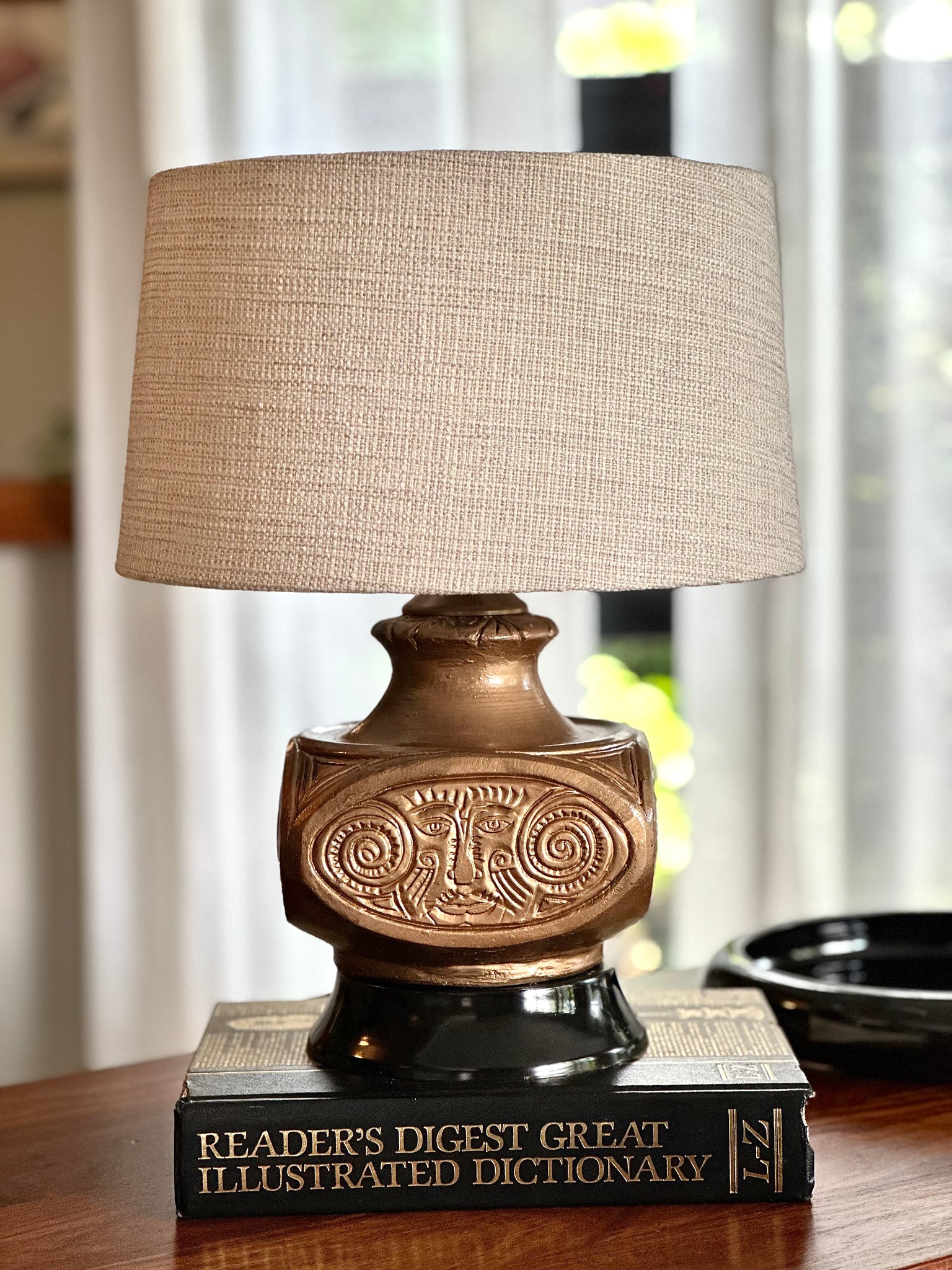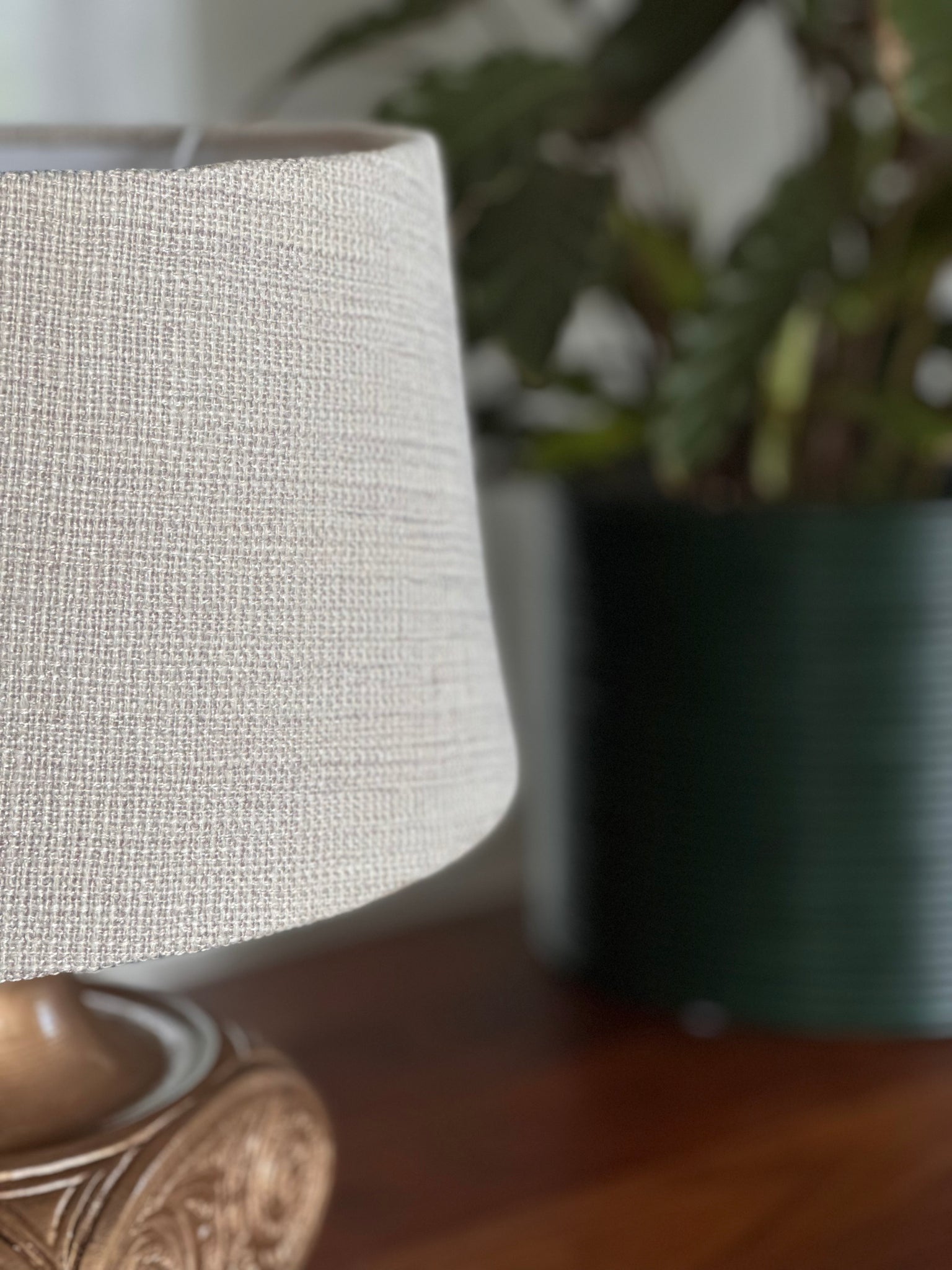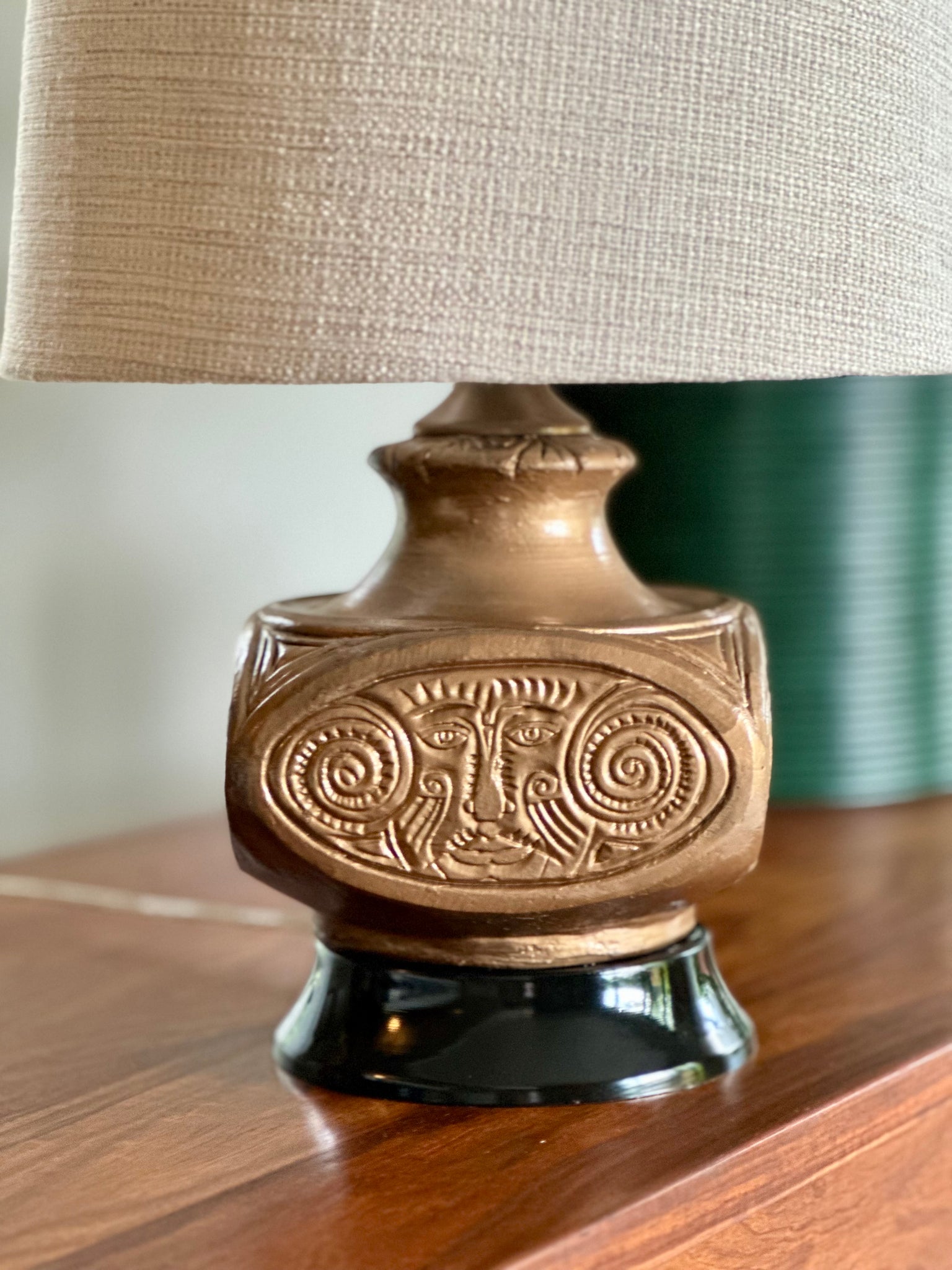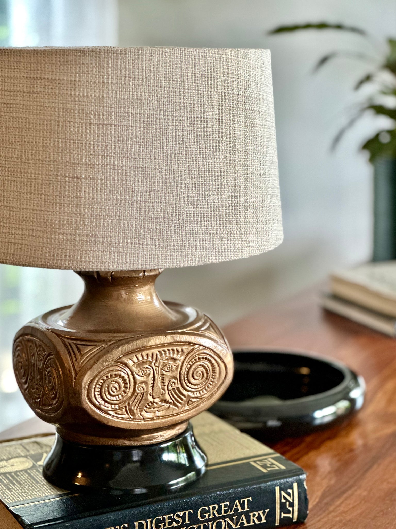 A beautifully detailed occasional lamp featuring an intricately embossed ceramic base, rich in texture and character. Paired with a newly fitted earthy-toned shade, it brings warmth and a grounded, natural feel to any space.