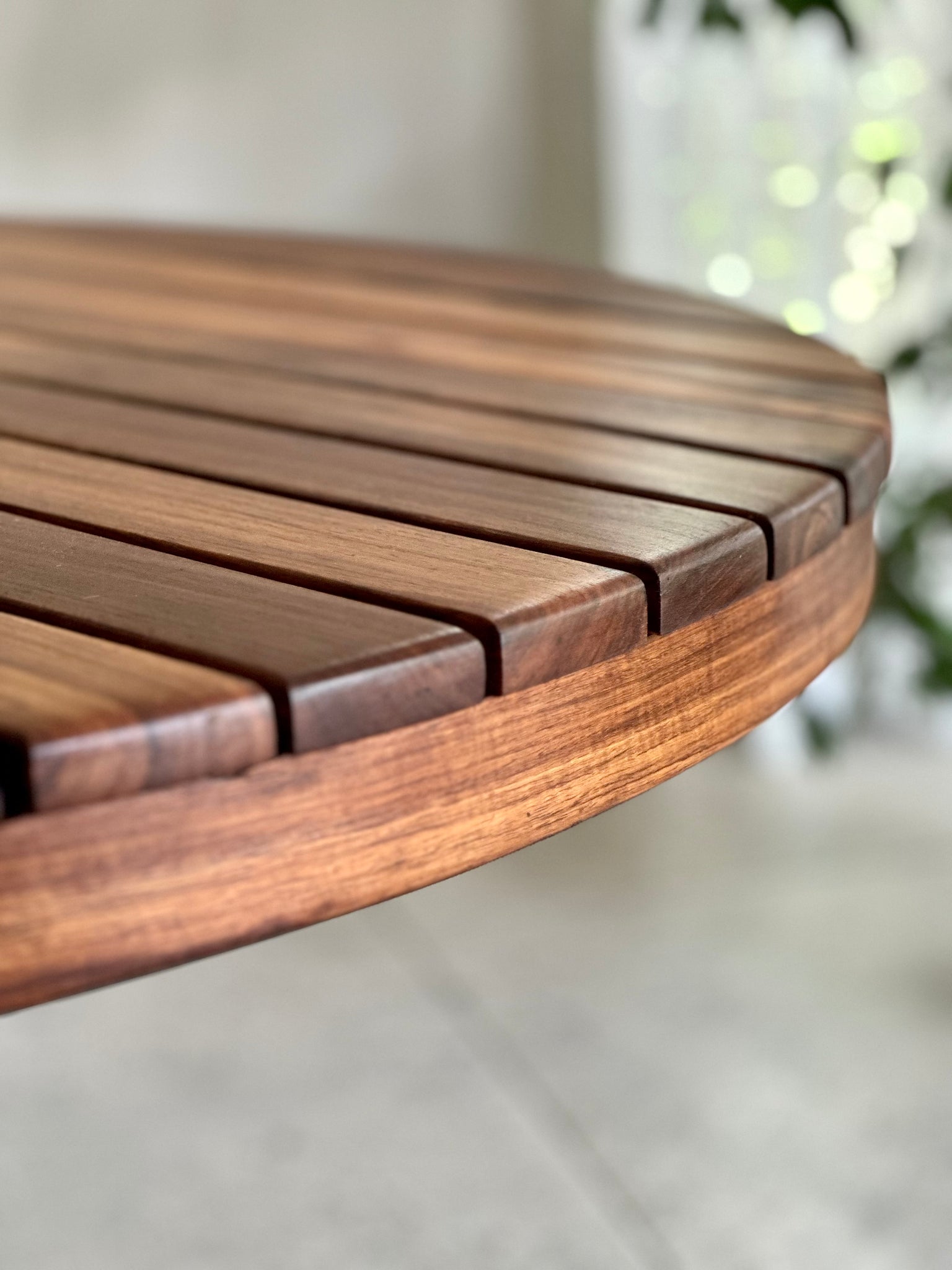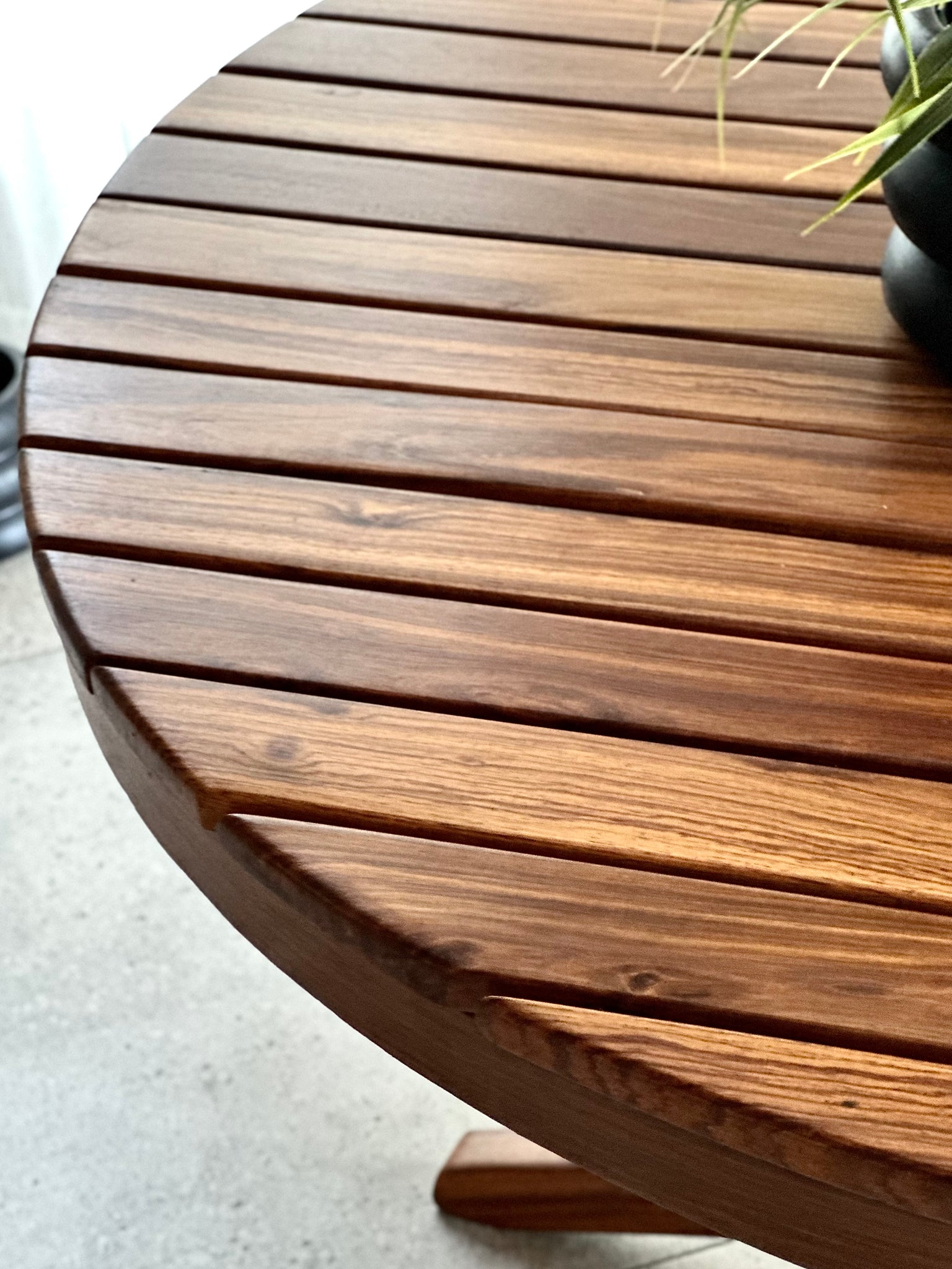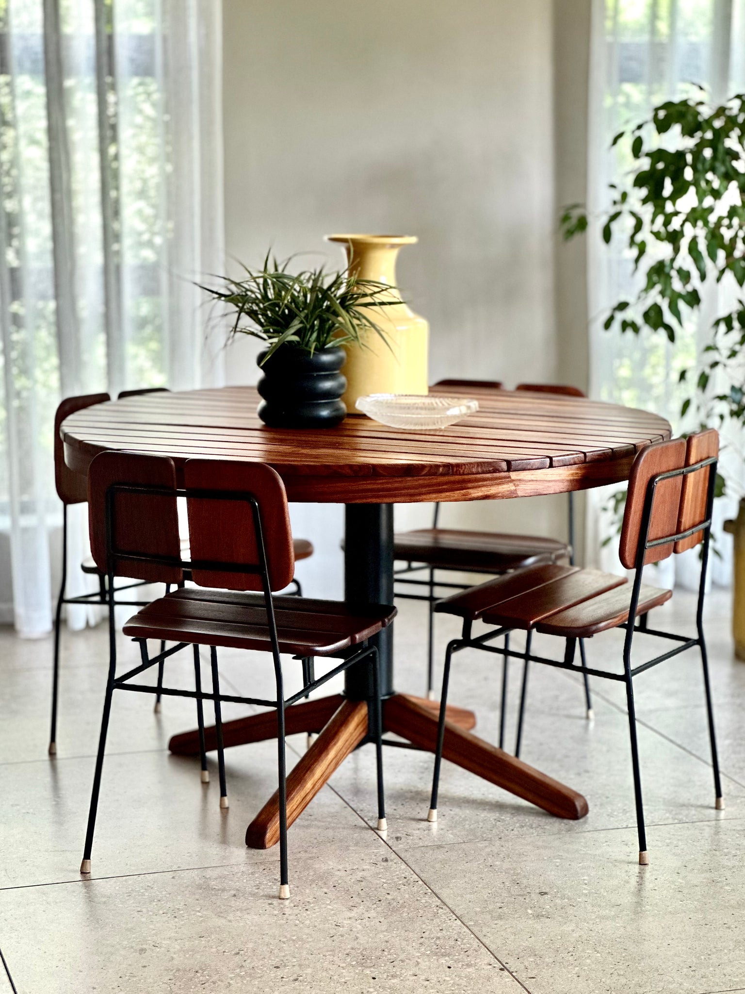 A well-balanced round table featuring a distinctive slatted solid Kiaat top, paired with a mixed material base that combines warm timber with a central steel column. The slatted surface adds texture and visual interest while allowing the natural grain and rich tone of the Kiaat to take centre stage.