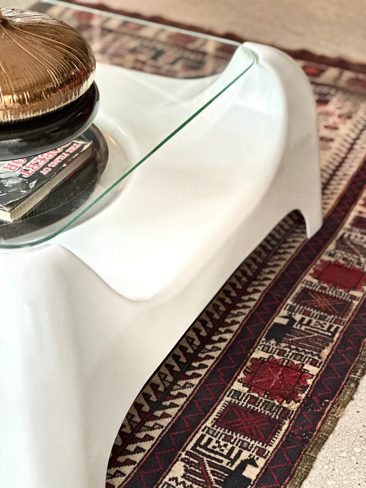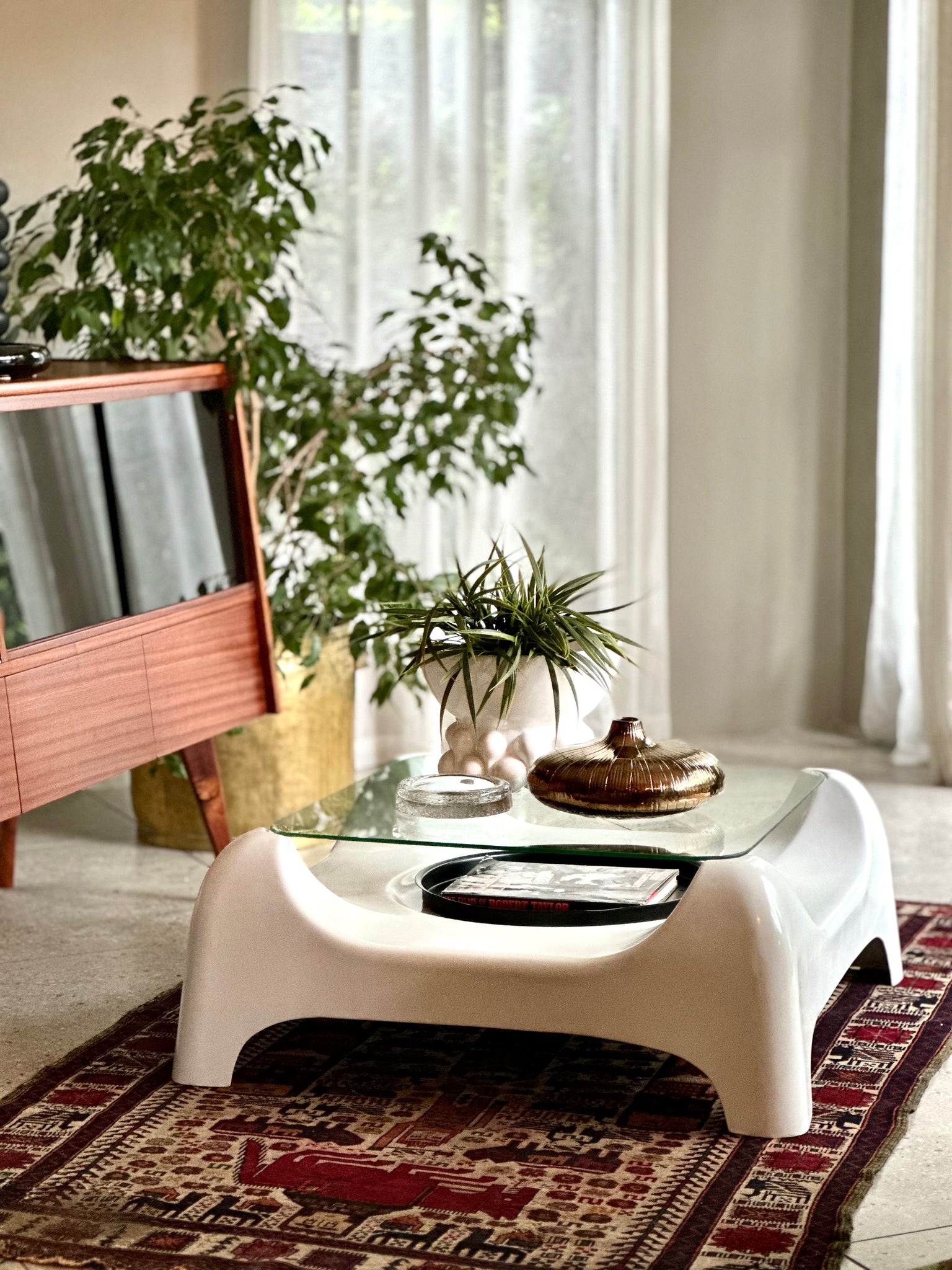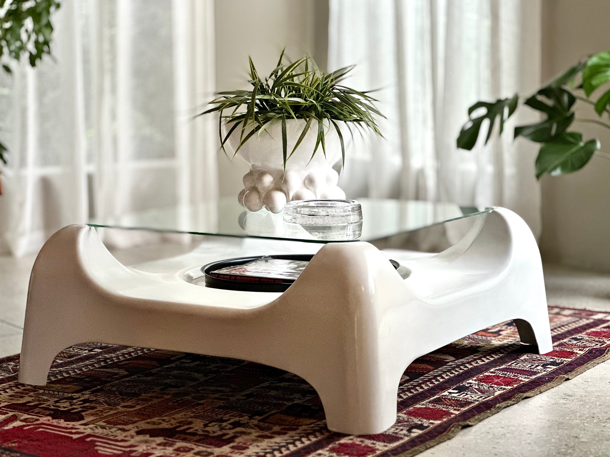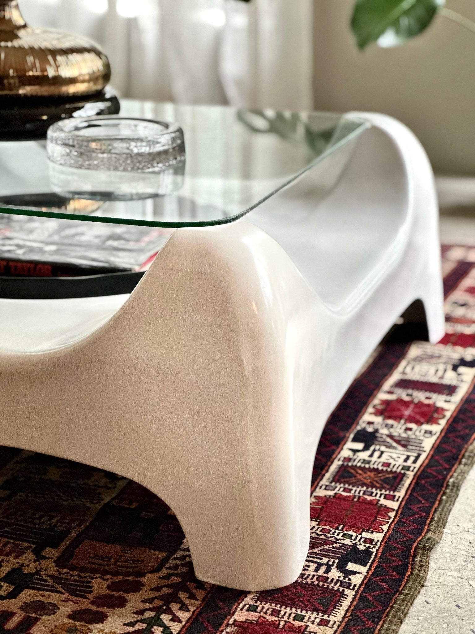 Defined by its bold moulded fiberglass base, the design forms a smooth architectural silhouette with deep recessed curves that create the illusion of a floating glass top. The flowing form reflects the Space Age movement of the period, when designers began exploring new materials and confident organic shapes.