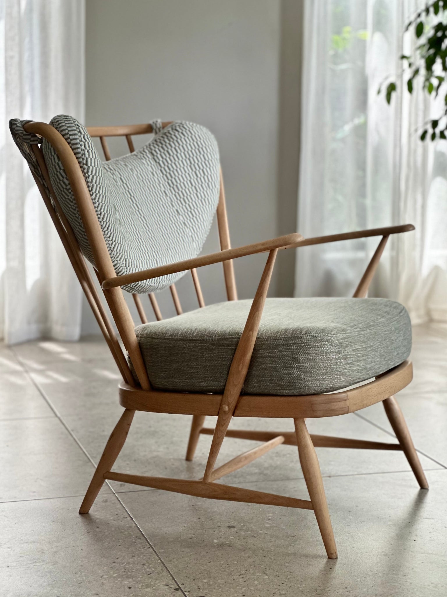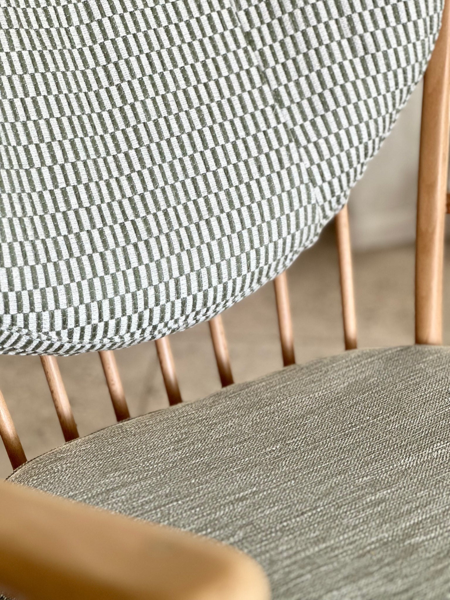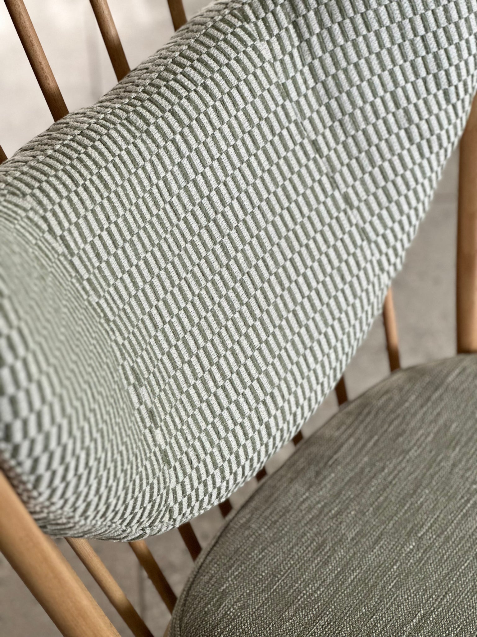 In this refreshed interpretation, the design has been lightened with a newly upholstered seat cushion and a floating hanging backrest cushion, allowing the beautifully turned spindles to remain visible from every angle. Both cushions are upholstered in a complementary sage green textured fabric from Hertex, adding softness and comfort while maintaining a calm, understated palette.