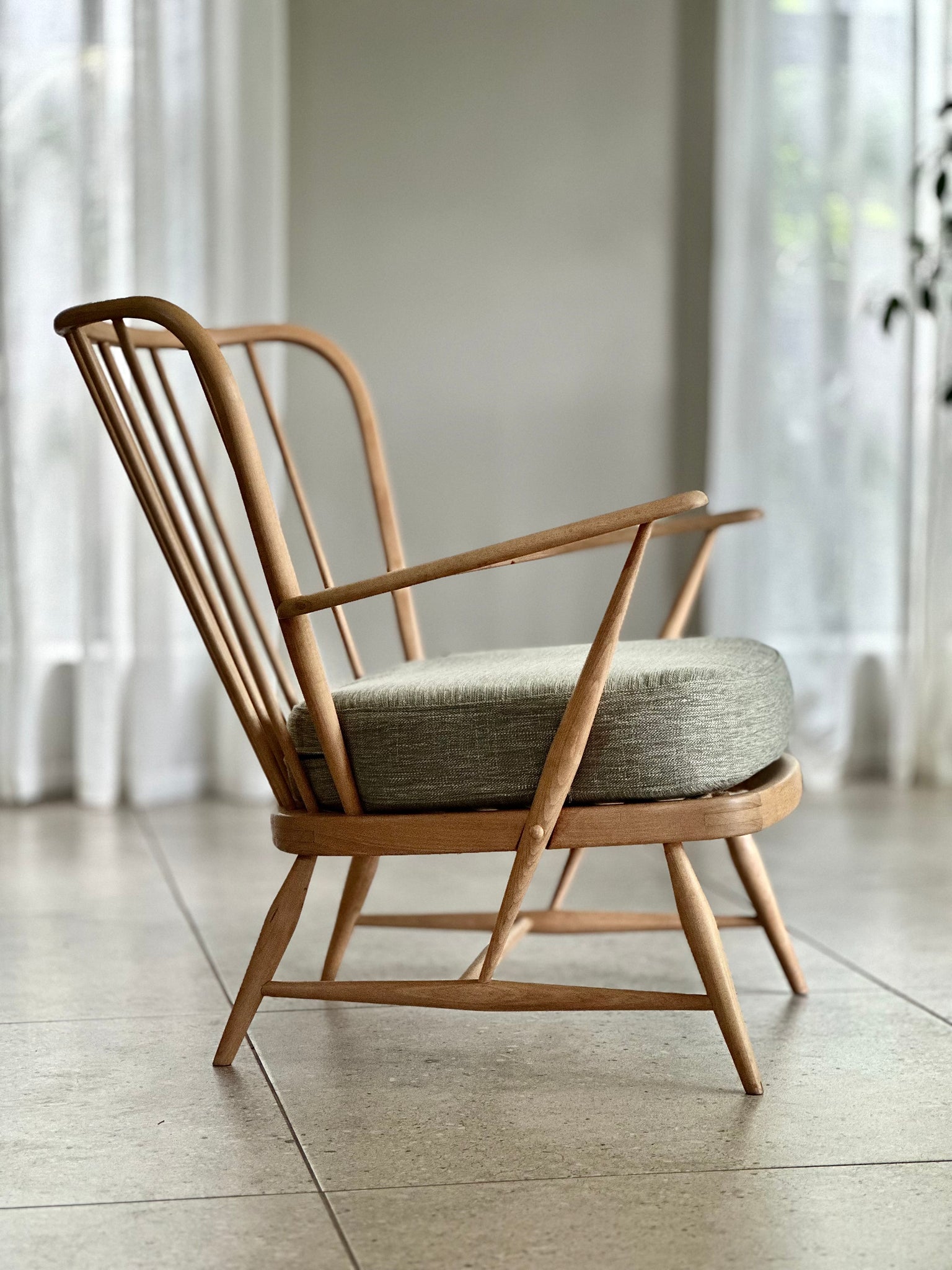 This refined spindle back armchair is a timeless mid-century design, carefully restored and subtly updated for contemporary living. With no maker’s mark present, the chair could be attributed to either Ercol or Lubis Furniture, both known for their elegant spindle back forms and high standards of craftsmanship throughout the 1950s and 1960s.