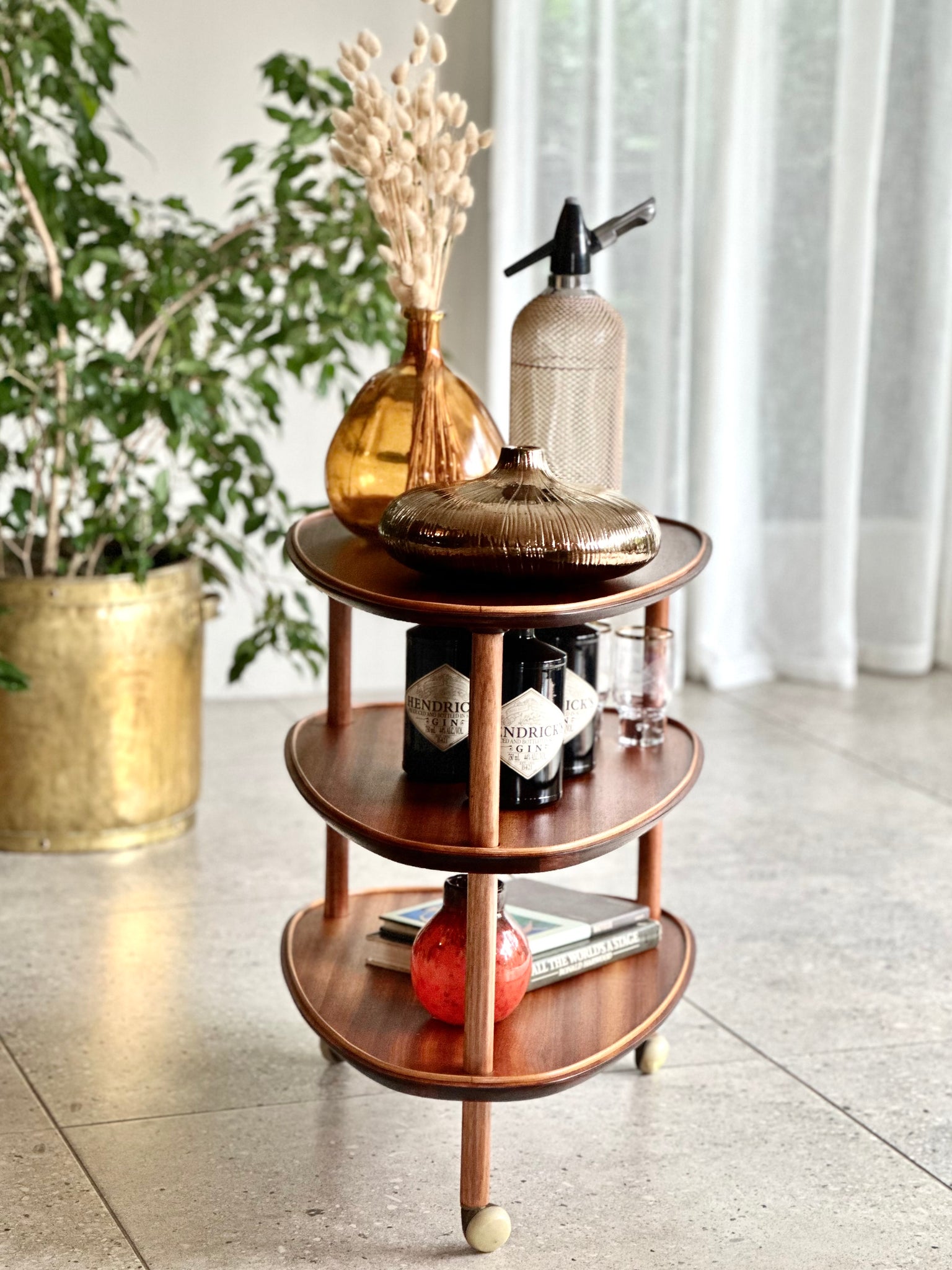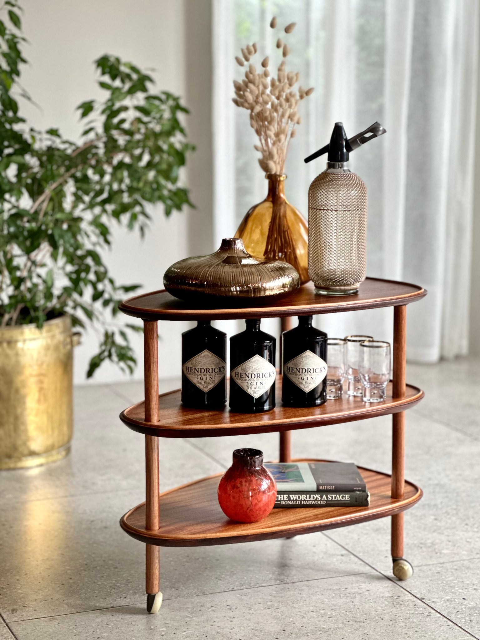 A beautifully proportioned three tier drinks cart crafted in Sapele, defined by its elegant, angular oval form and clean mid-century lines. The gently shaped tiers are supported by slender uprights, creating a light, balanced profile while offering space for bottles, glassware, or serving pieces.