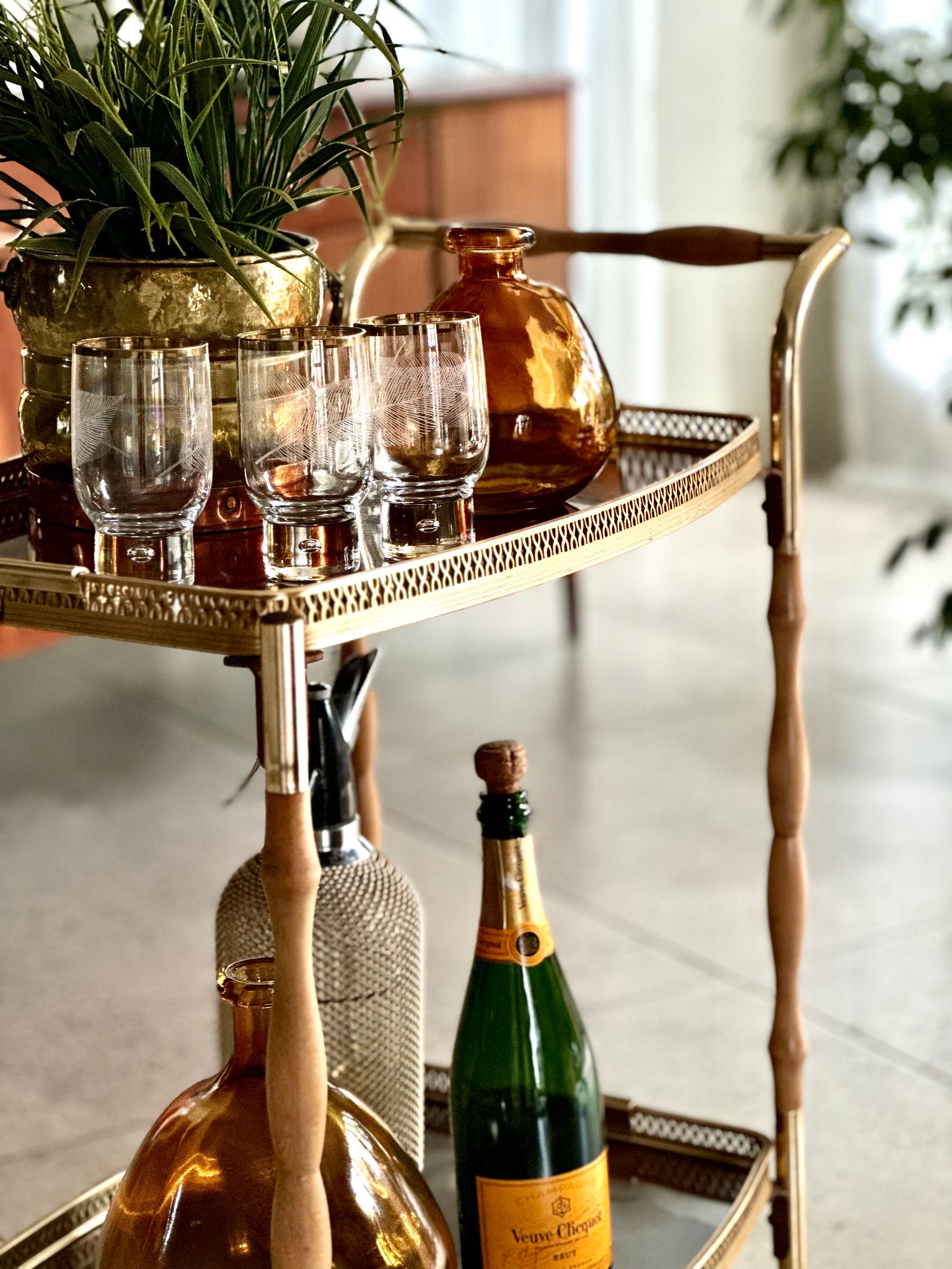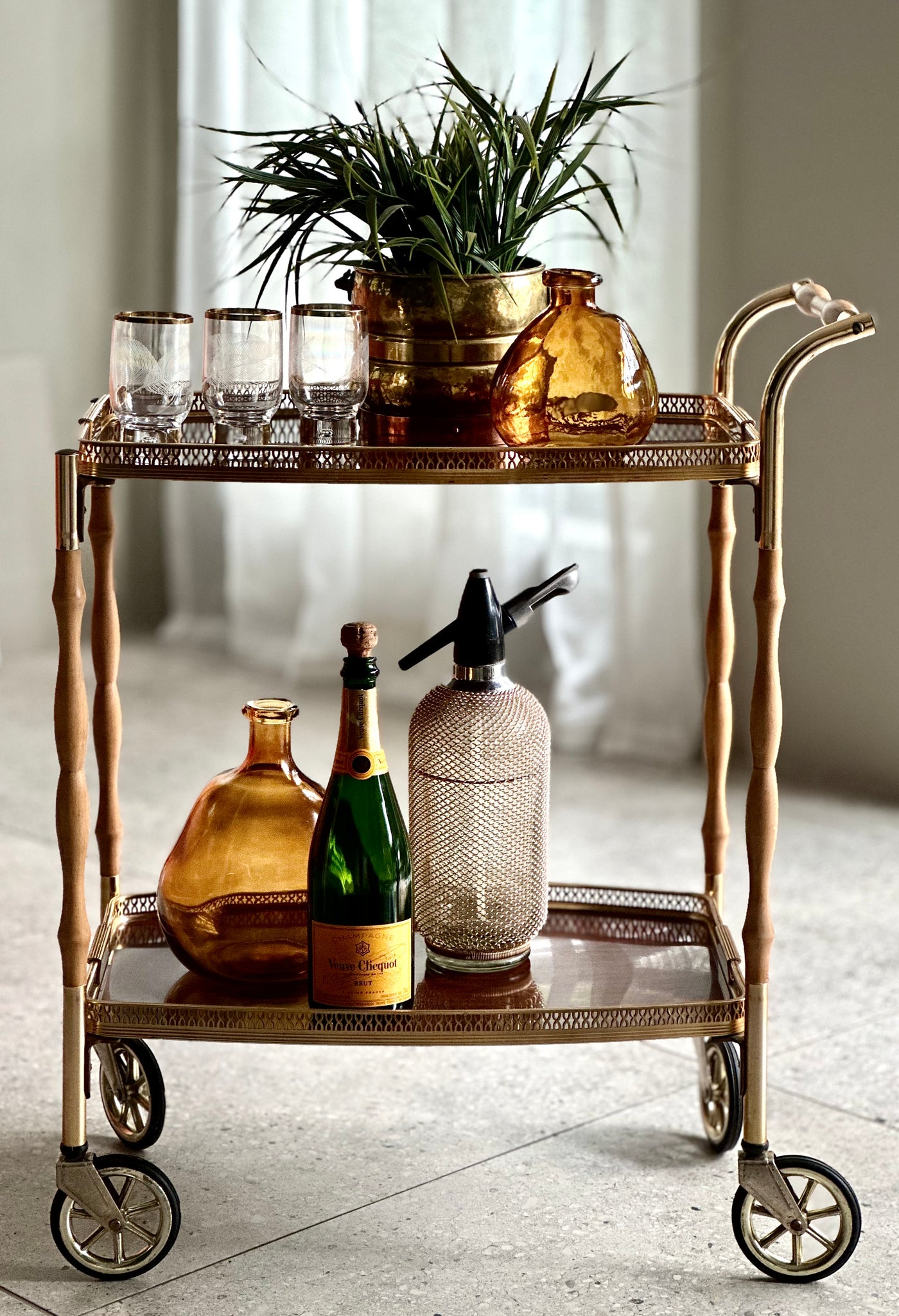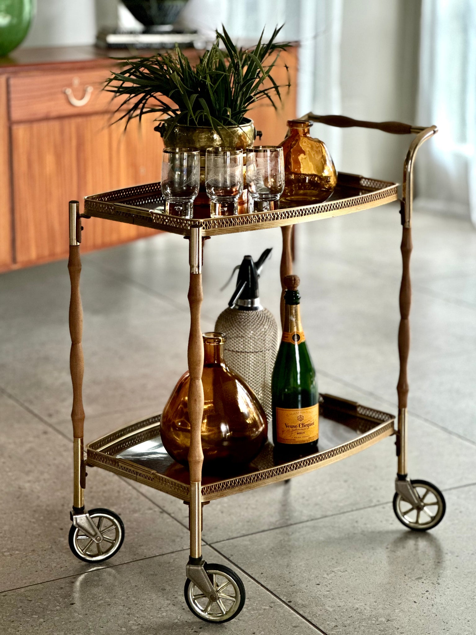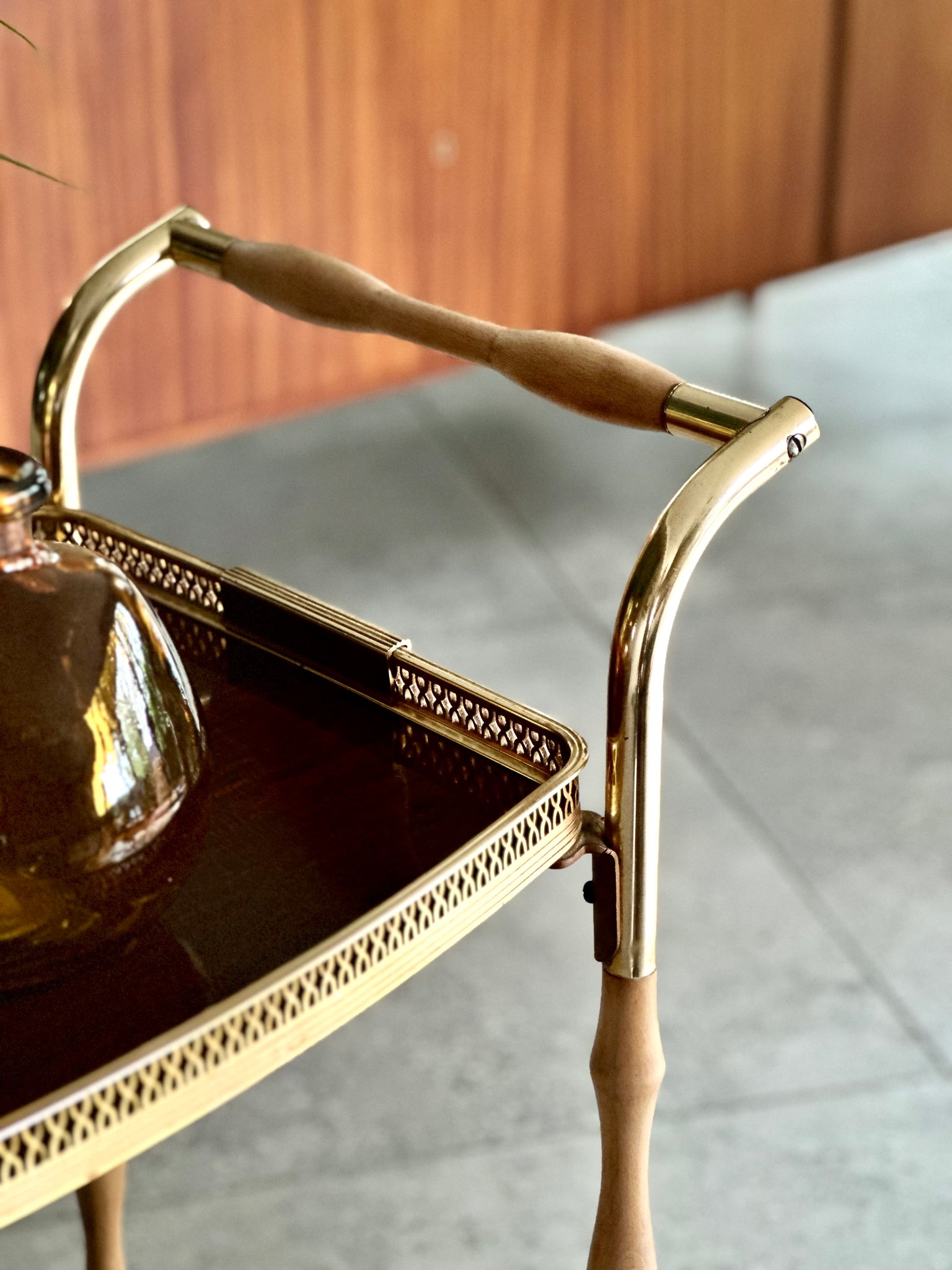 The wooden elements have been carefully restored and sealed, and the trolley is in great overall vintage condition with the brass plating & formica showing minor signs of age-related wear