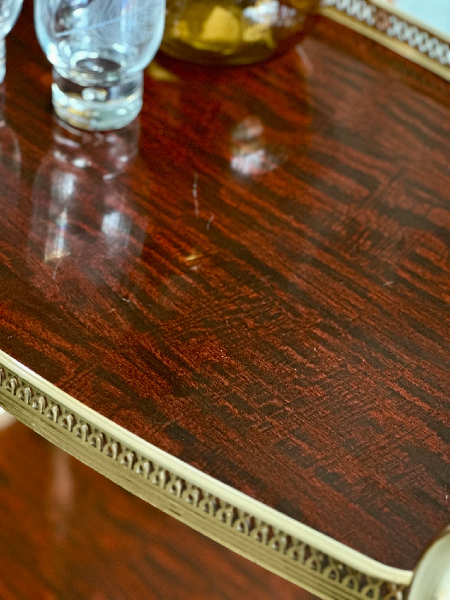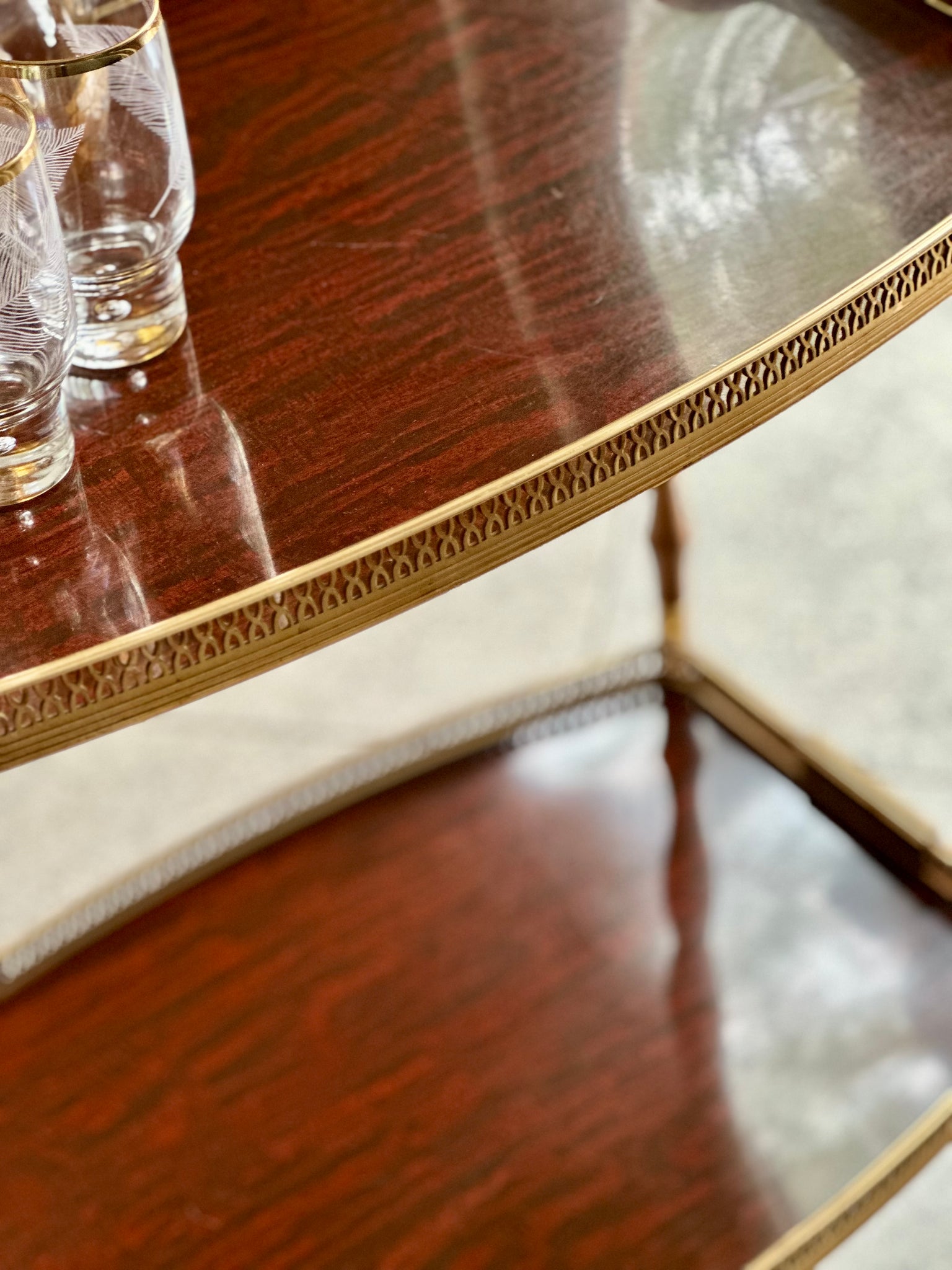 A charming vintage two-tier drinks trolley, combining elegant metalwork with warm wooden details. The trays feature Formica tops framed by beautifully detailed pierced gallery edges, giving the piece both visual refinement and practical function.