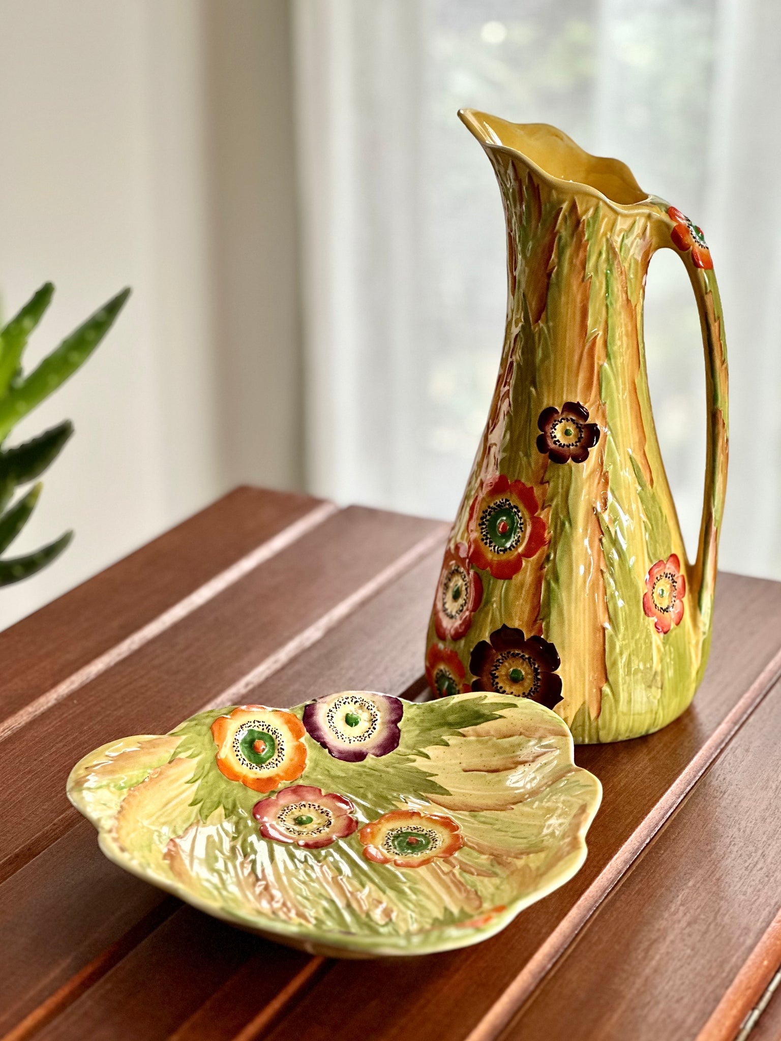 A vibrant vintage duo from Carlton Ware, featuring a sculptural pitcher and matching platter in a textured leaf-and-flower relief pattern. Rich greens, yellows, and bold poppy-like florals sweep across both pieces, showcasing the playful colour palette and expressive modelling for which the brand became famous.