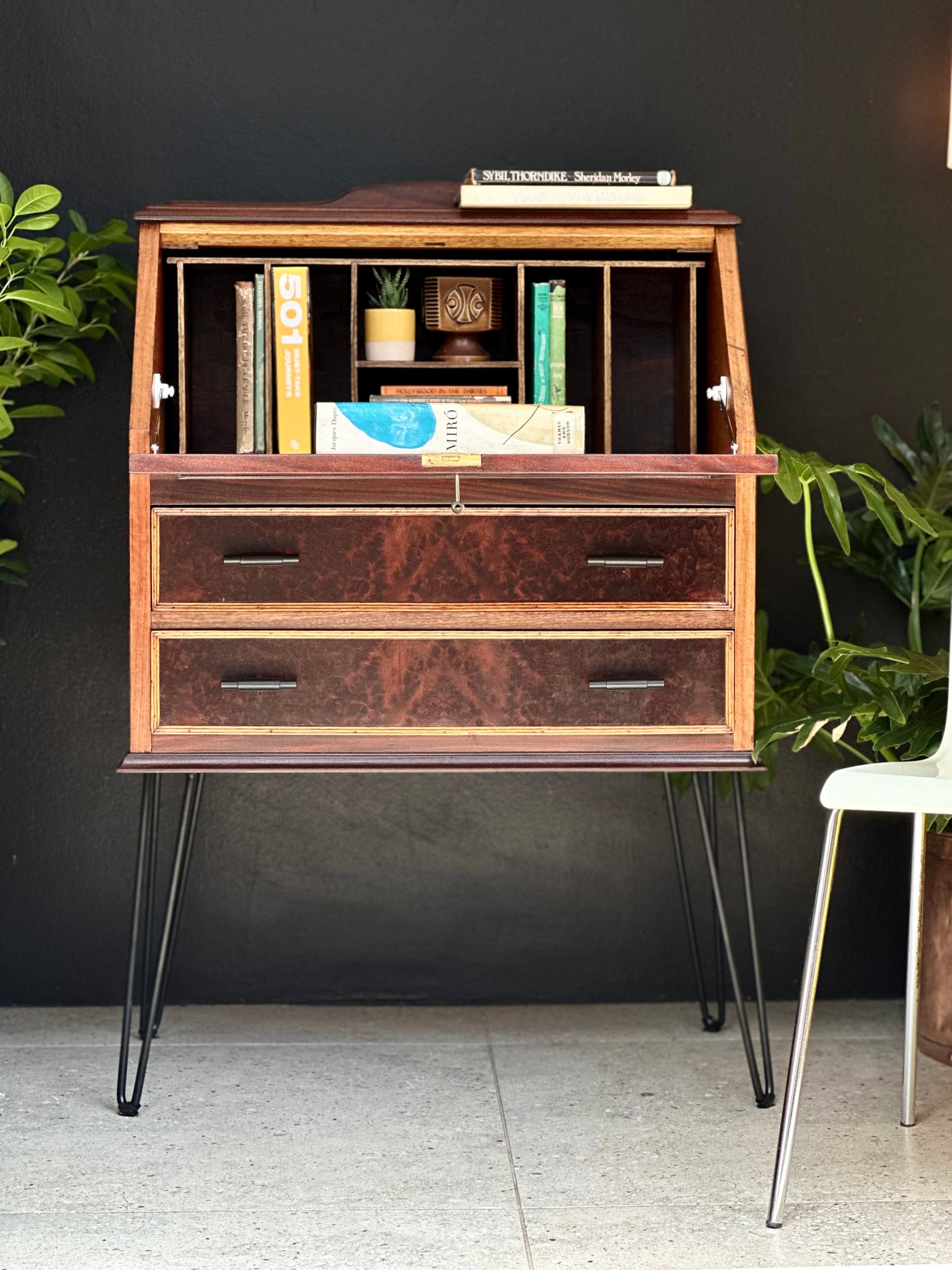 As part of its transformation, the piece has been elevated on newly added black steel hairpin legs, giving it a light, considered stance and allowing it to sit comfortably in both vintage-inspired and modern interiors. New drawer handles complete the look, subtly tying the old and the new together.