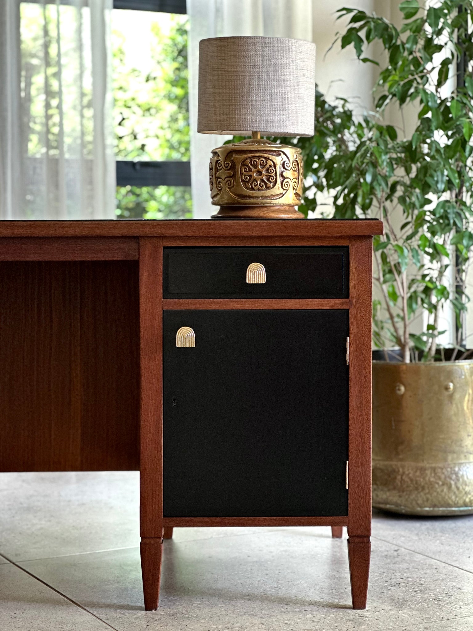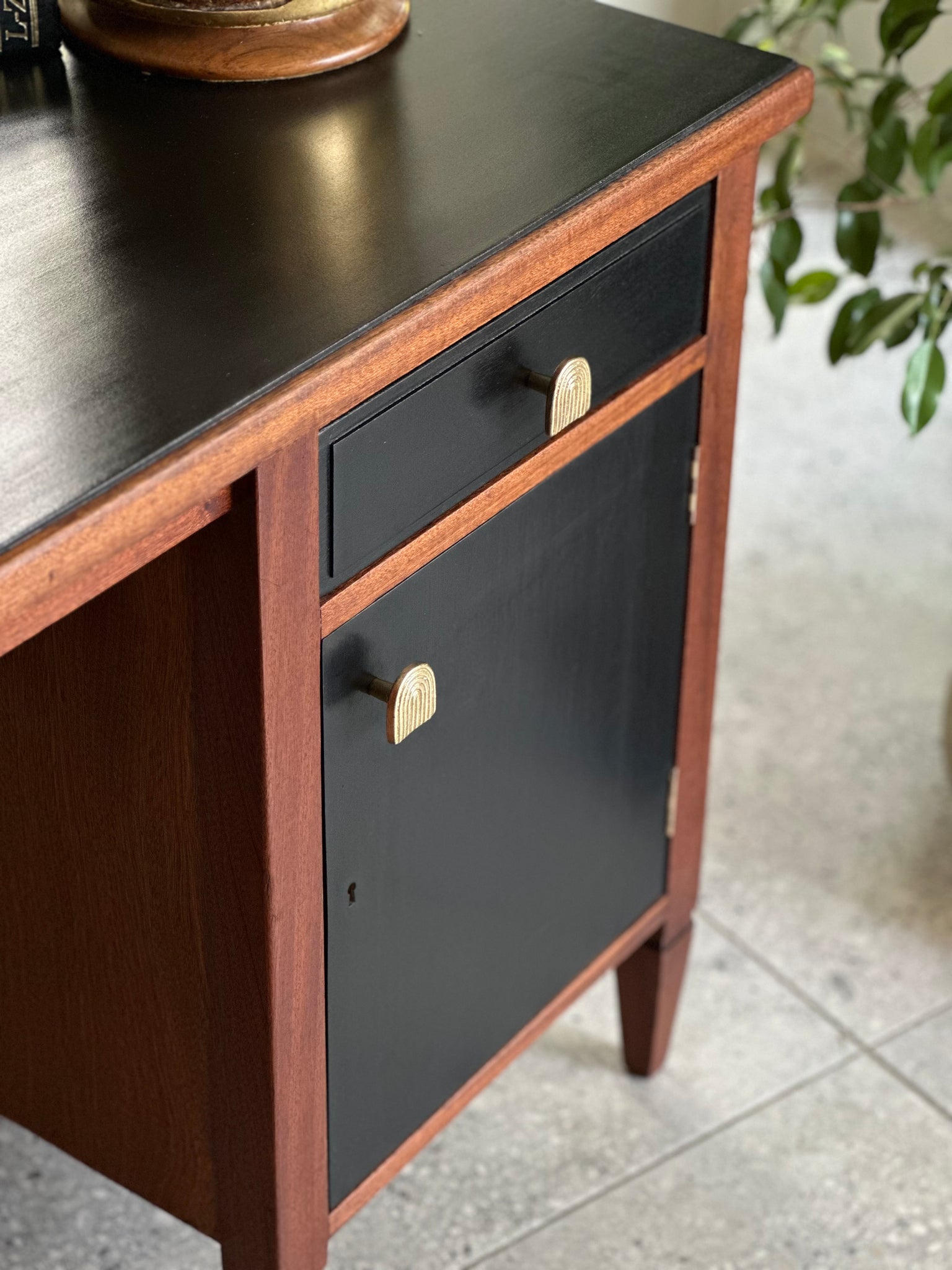 A great "upcycled" Vintage desk with a single drawer that provides storage and additional cabinet space. Black-stained & natural wood tones with the new handles perfectly complement each other. Notice the beautiful finish on the back of the desk and sides allowing this desk to be centred in a room.