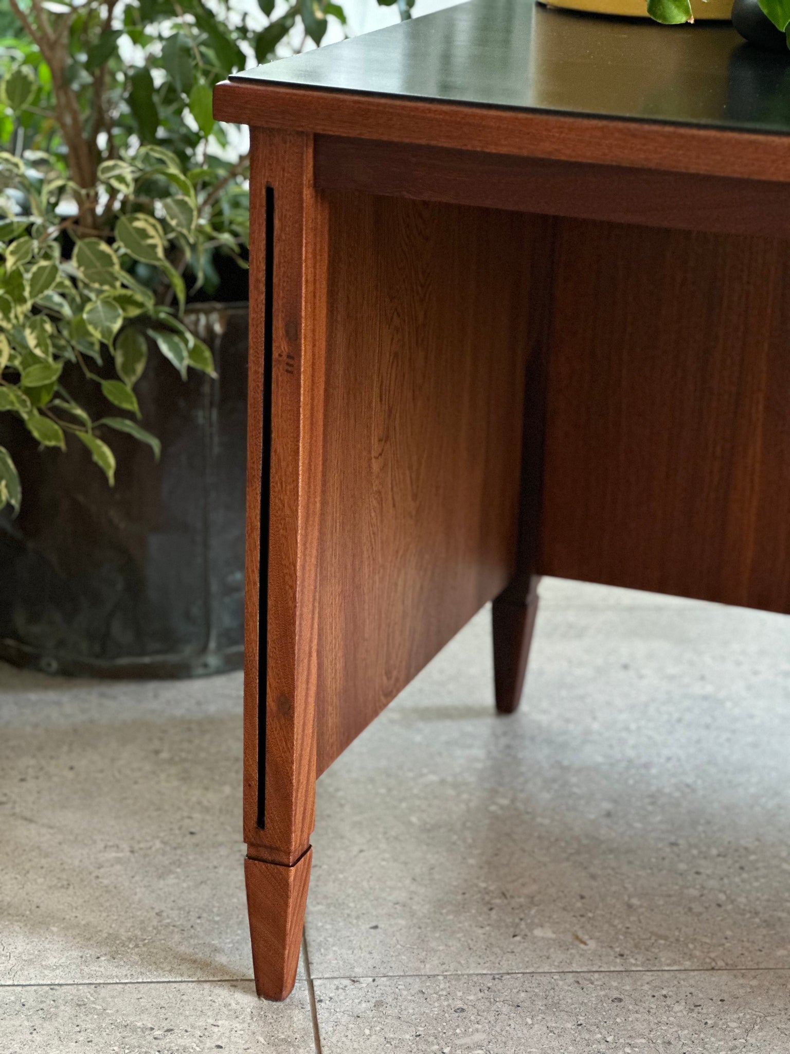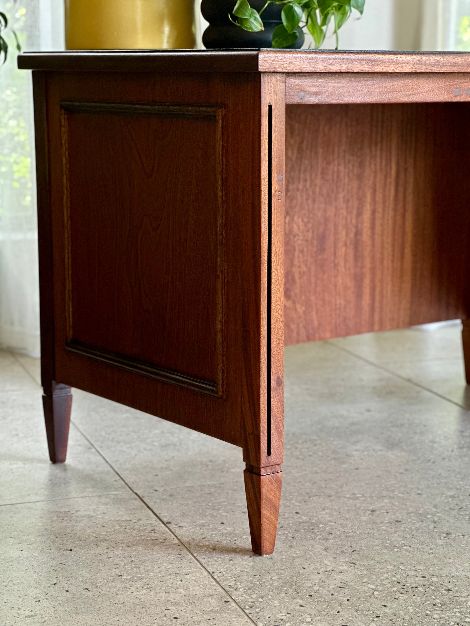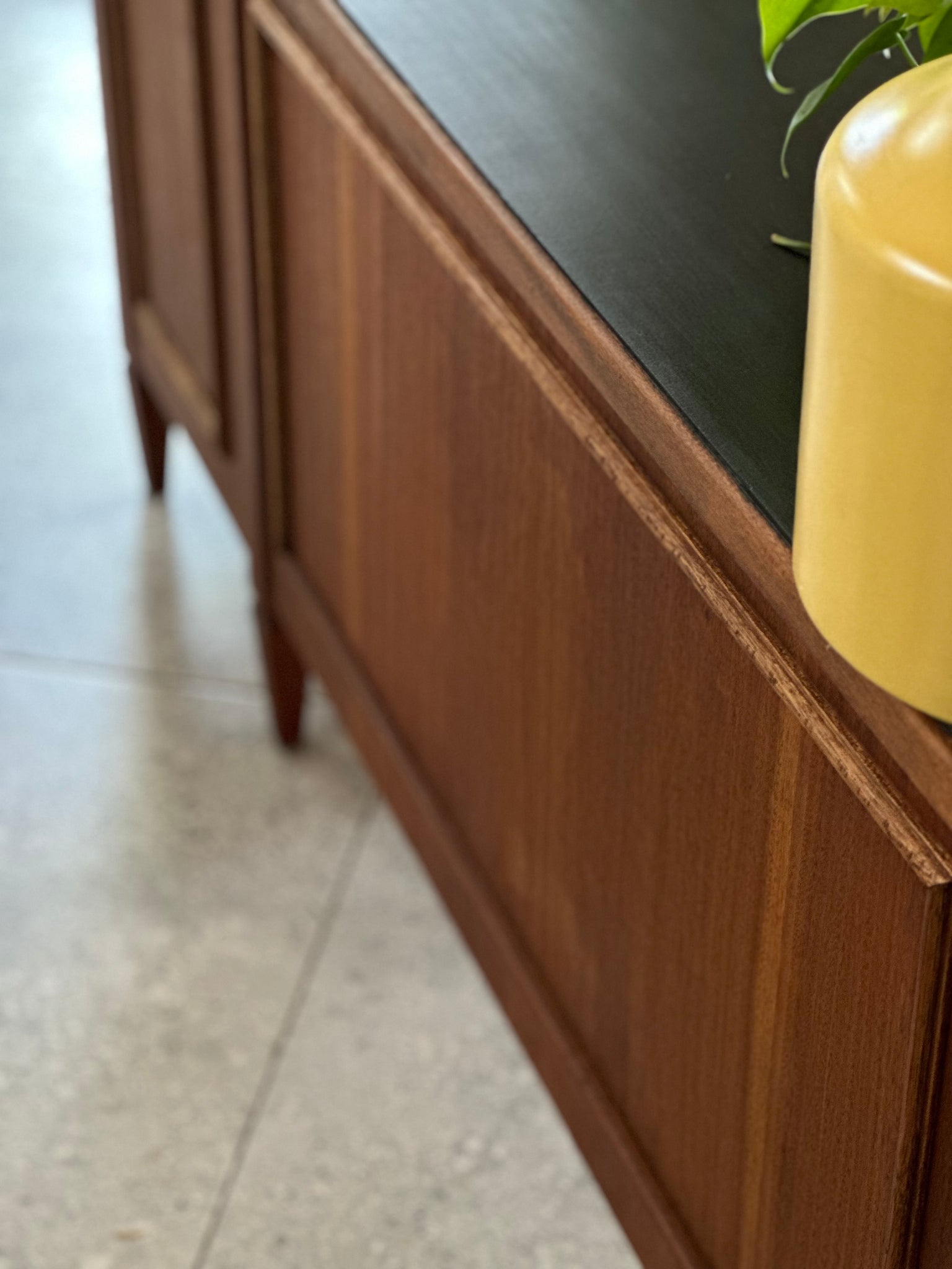 As with most Mid-Century pieces and a hallmark of the era, it is a combination of solid wood and a high-quality wood veneer. Veneer has a rich history in furniture design, is admired for its craftsmanship, durability, and aesthetic appeal and is a long and honorable tradition. The quality of the veneer's artistry was long-lasting; for this reason, it can be retouched or sanded and refinished.