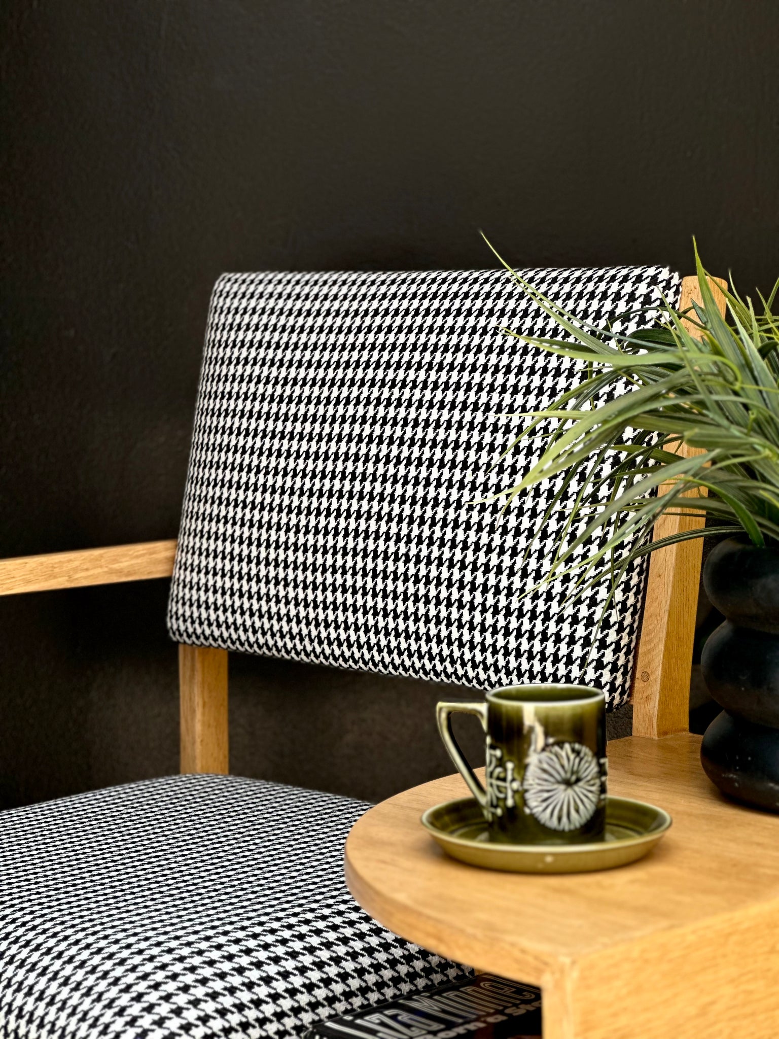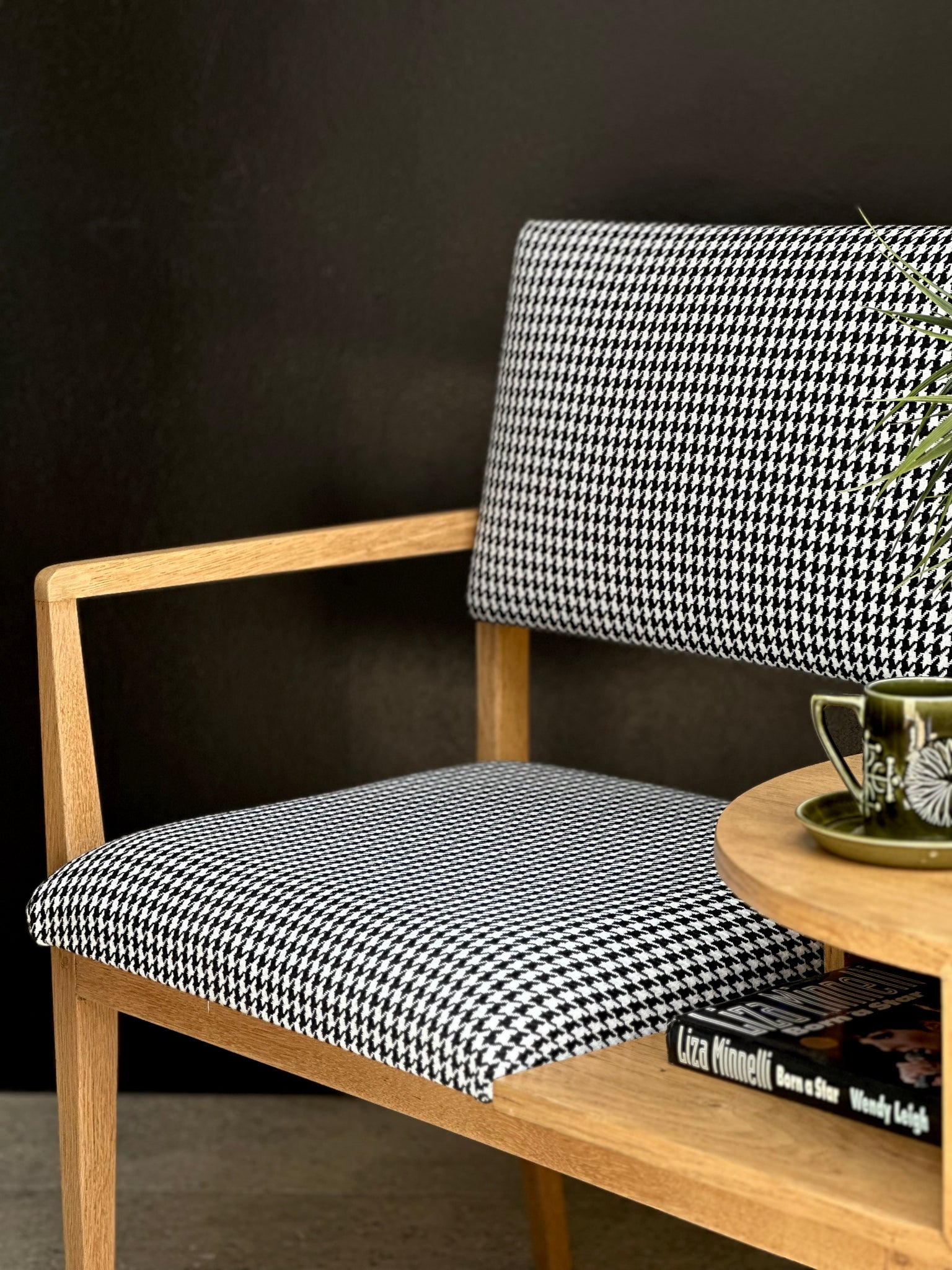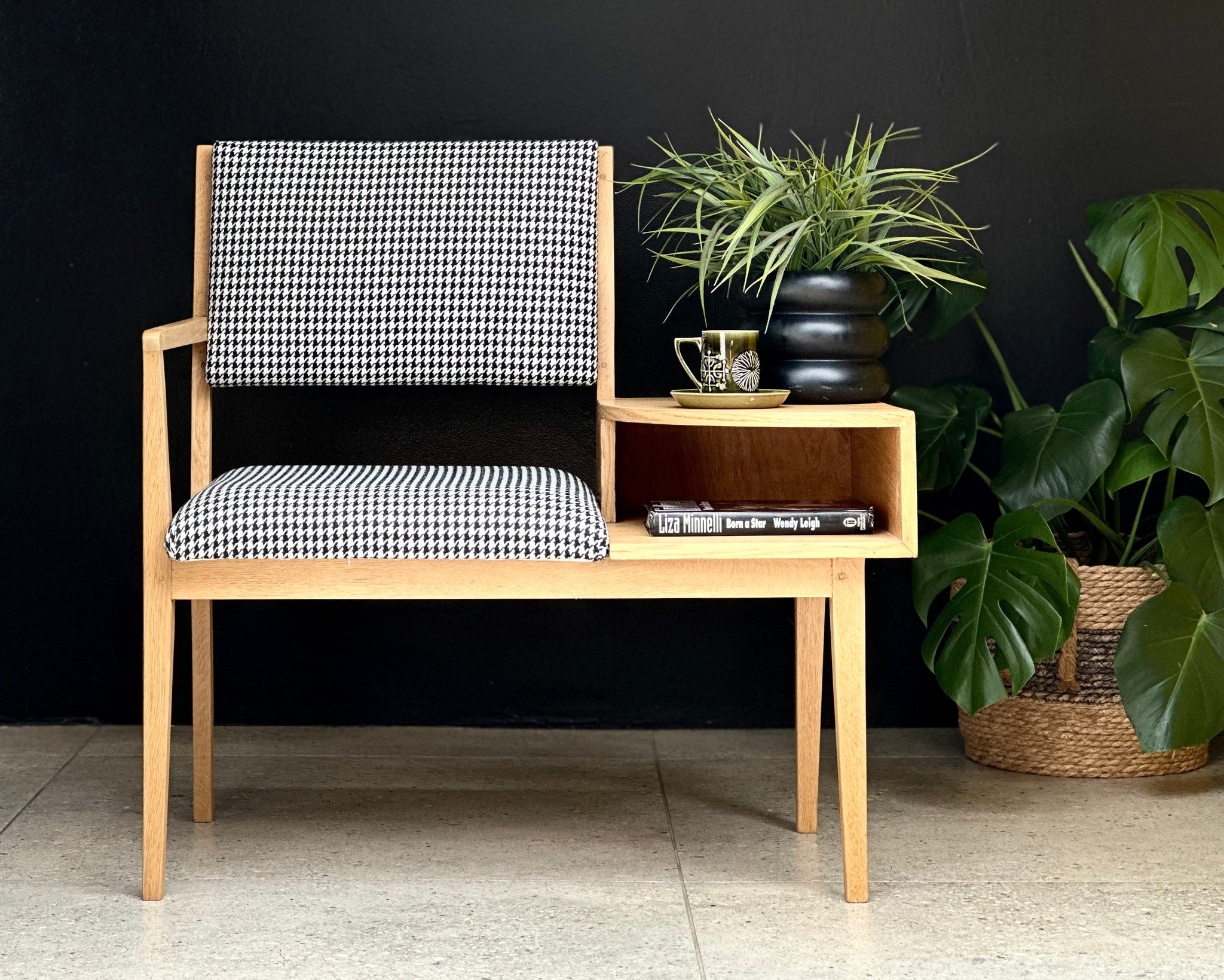 The chair has been fully restored and refurbished, with the timber carefully repaired where necessary, and resealed to preserve its honest character. It has been newly upholstered in a bold black-and-white houndstooth fabric from Hertex Fabrics, introducing a modern graphic contrast that lifts the piece while respecting its vintage roots.