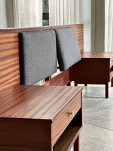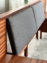 The wood has been fully restored (the headboard was in its original dark-stained color), and the headrests have been newly upholstered in dark charcoal Hertex fabric.