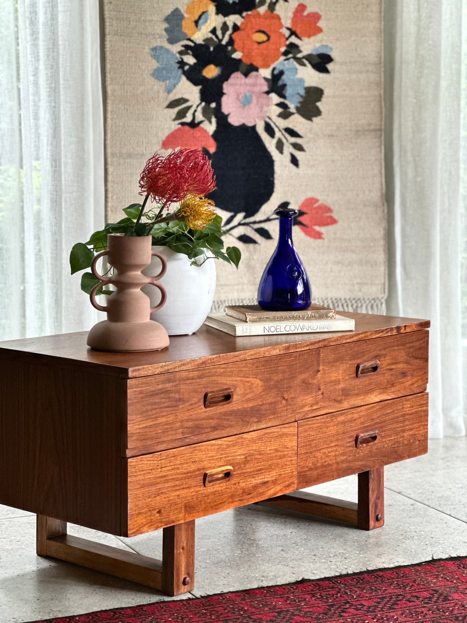 Retro minimalist style South African manufactured, multi-purpose chest of drawers or media cabinet in a Kiaat finish.