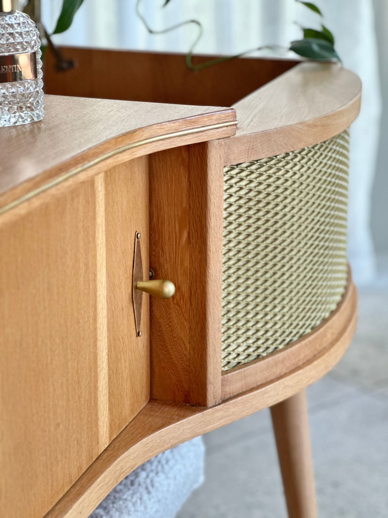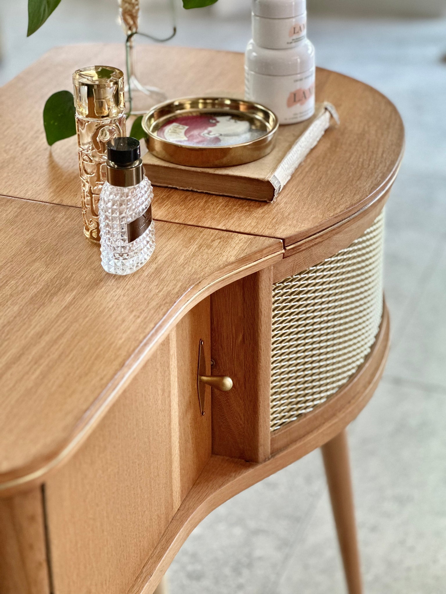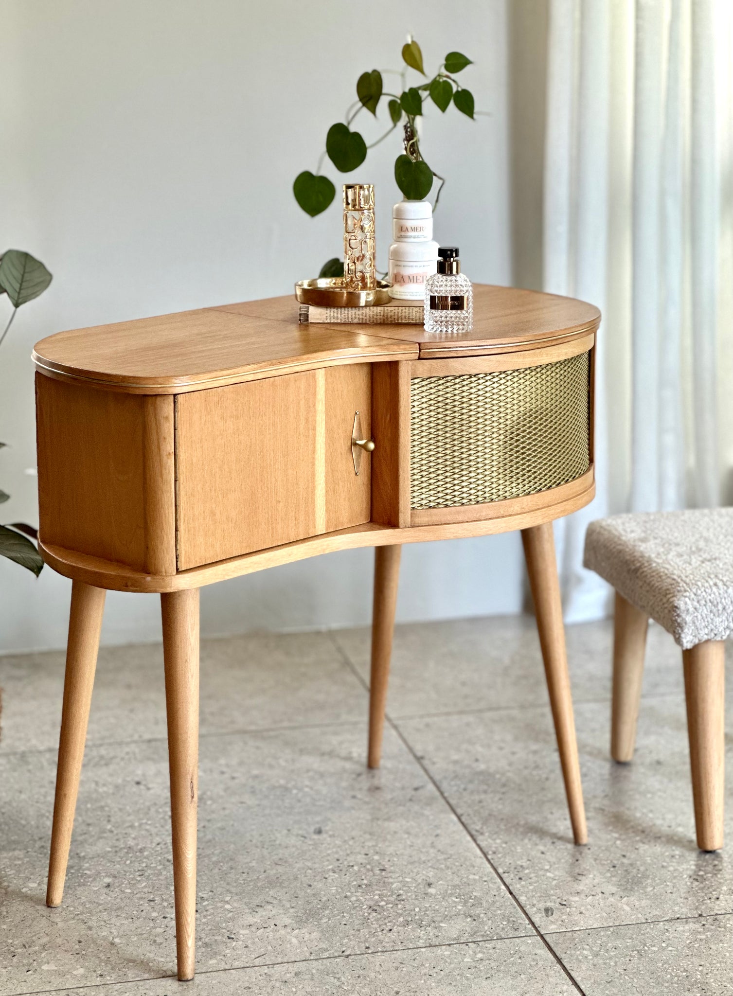 Restored in our workshop, it now features a newly added mirror and a custom-made & upholstered stool, complementing its soft, organic curves. The left side houses a small storage cabinet, while the right retains its original mesh panel, updated in a refined gold finish that adds a touch of modern glamour while celebrating its vintage roots.
