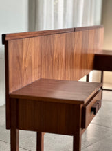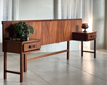 A stunning Retro headboard with attached bedside pedestals. A perfect fit for a double-size bed, but if you measure your mattress height a queen could fit at a squeeze. The drawers on each side of the headboard offer ample storage and surface space, combining practicality with timeless style. The design is versatile, while the drawer pulls stand out. Notice the detail on the top of the headboard section.