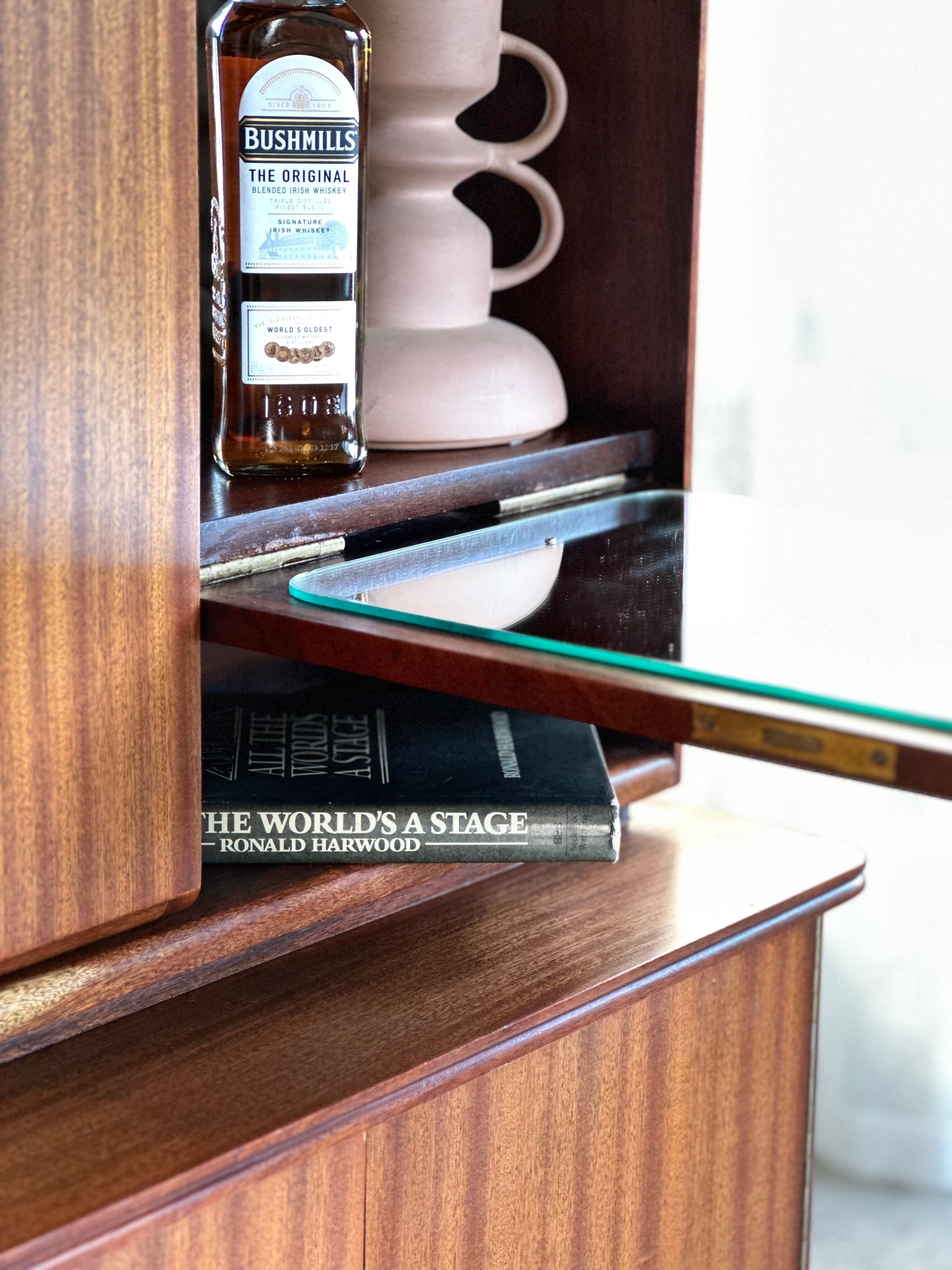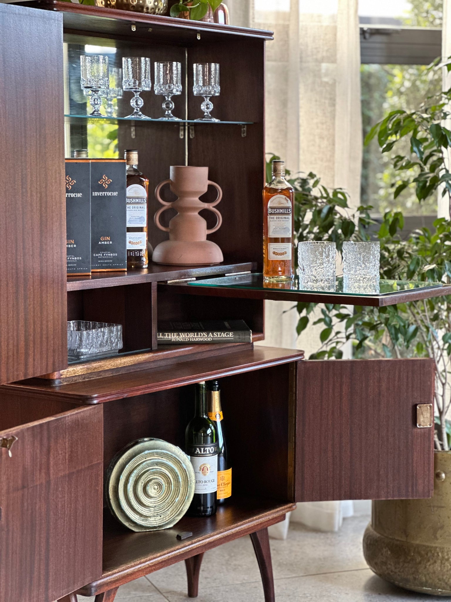 This Mid-Century drinks cabinet is a timeless piece featuring elegant wishbone legs and a practical drop-front serving space on the right. Great space saving option.