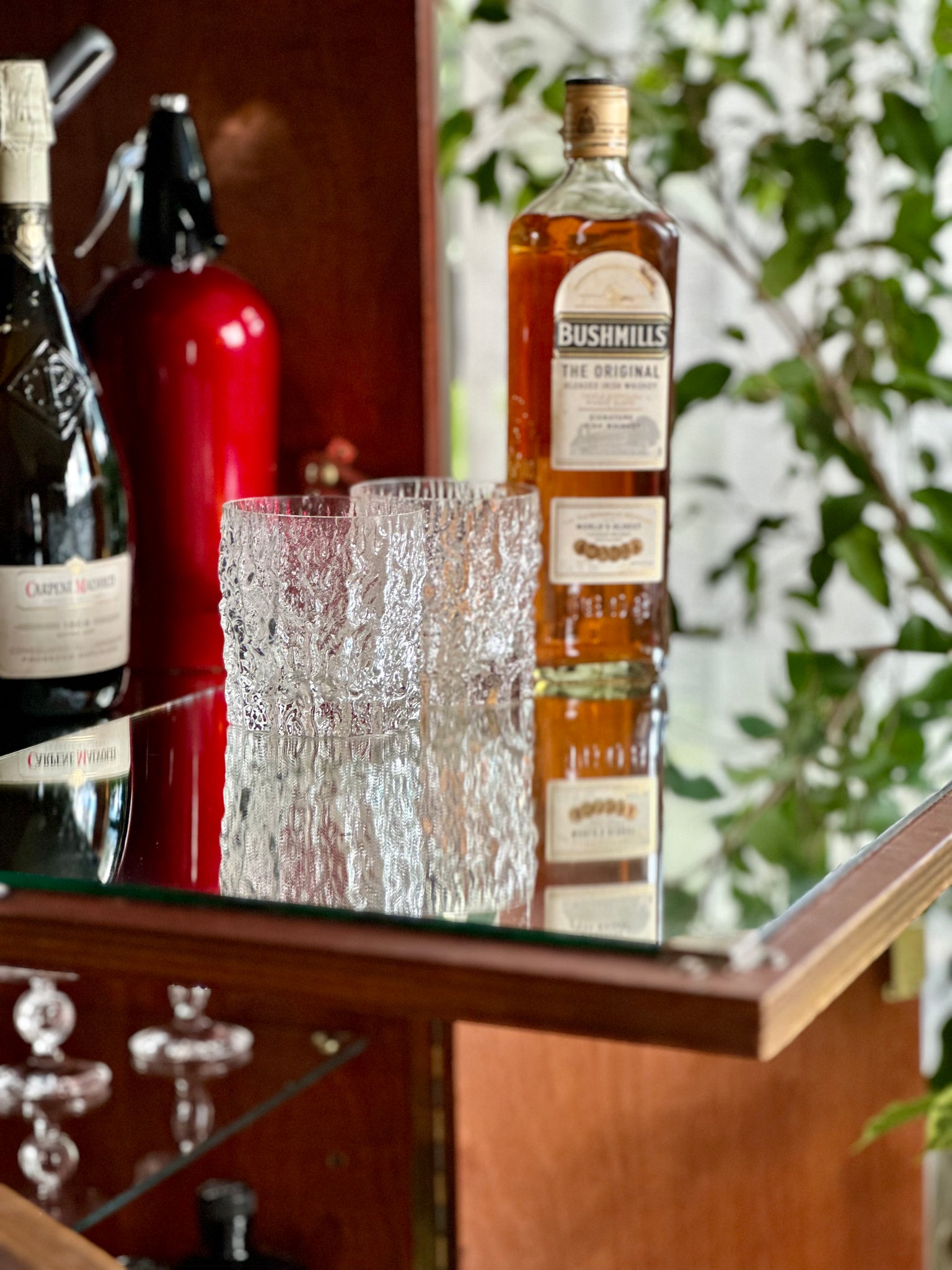 Additionally, the bottom cabinet with its glass shelved area provides ample storage space for bottles and other bar essentials.
