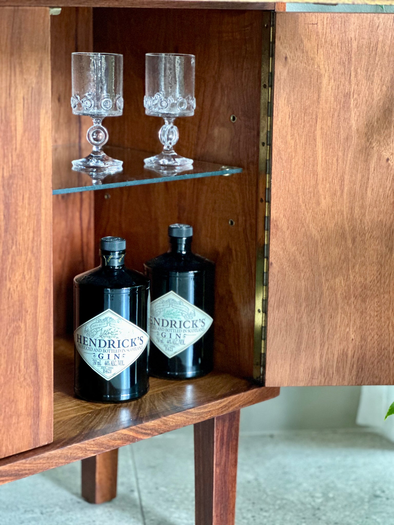 A fantastic Kiaat retro drinks cabinet with a drop-fronted mirrored top, and built-in light, perfect for pouring your favorite drink. The top tier has a mirrored back and bottom, along with two fitted glass shelves on the inside left. The light operates by opening and closing the serving/drop-fronted cabinet door.