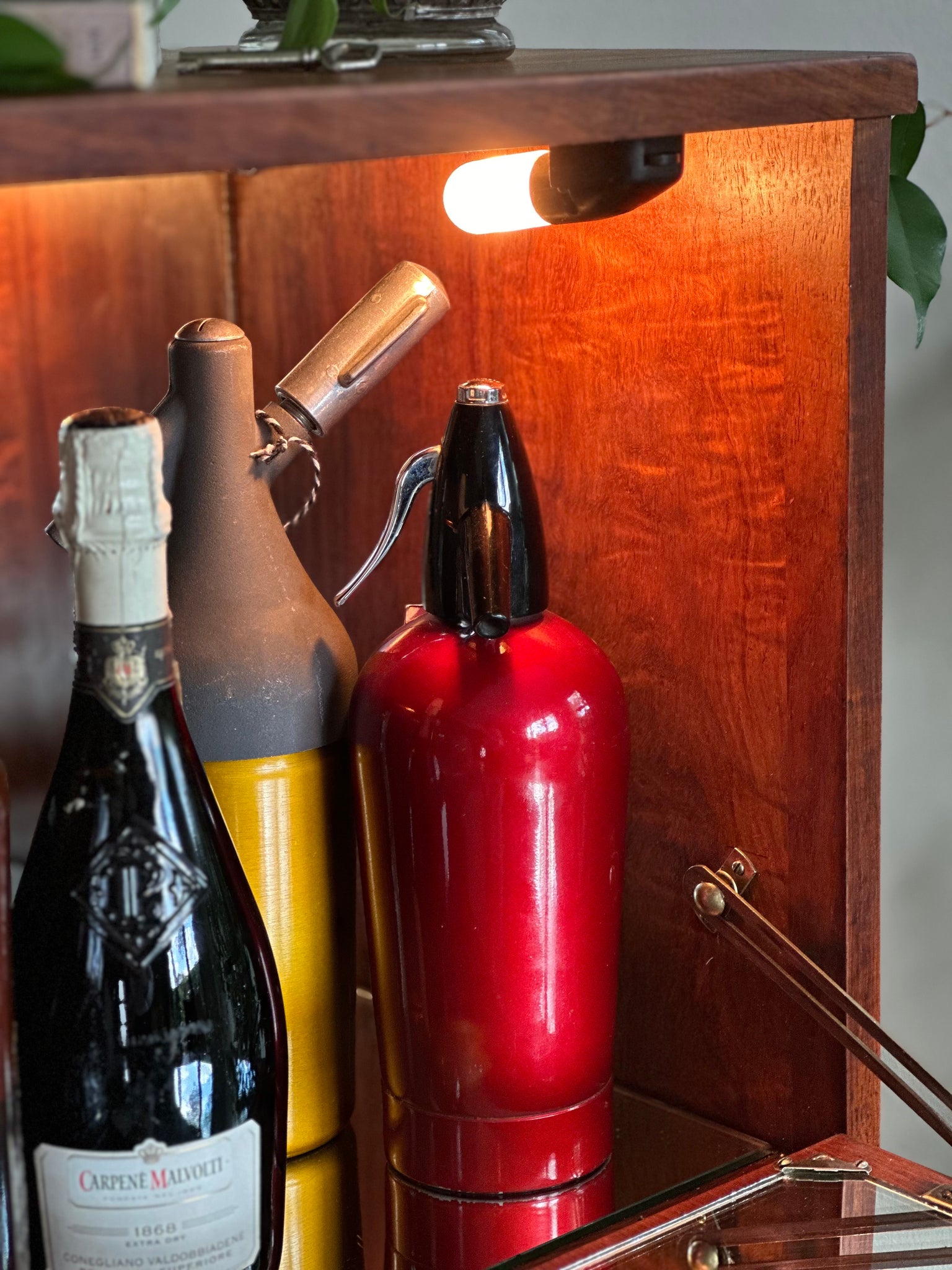 It's in fantastic restored condition with a new key made for the top-tier cabinet space. The Kiaat wood tones are very reminiscent of an Artecasa-made piece.