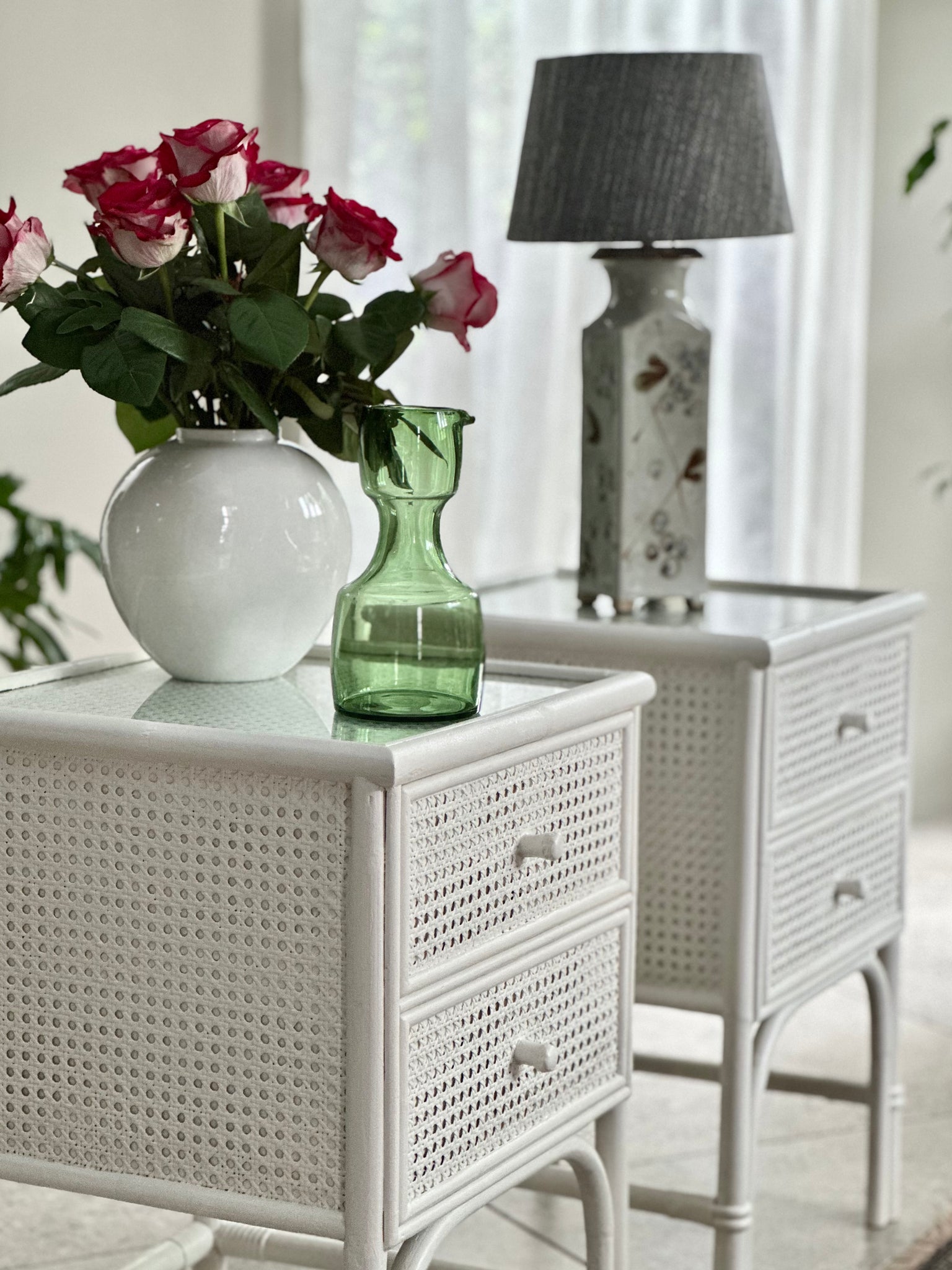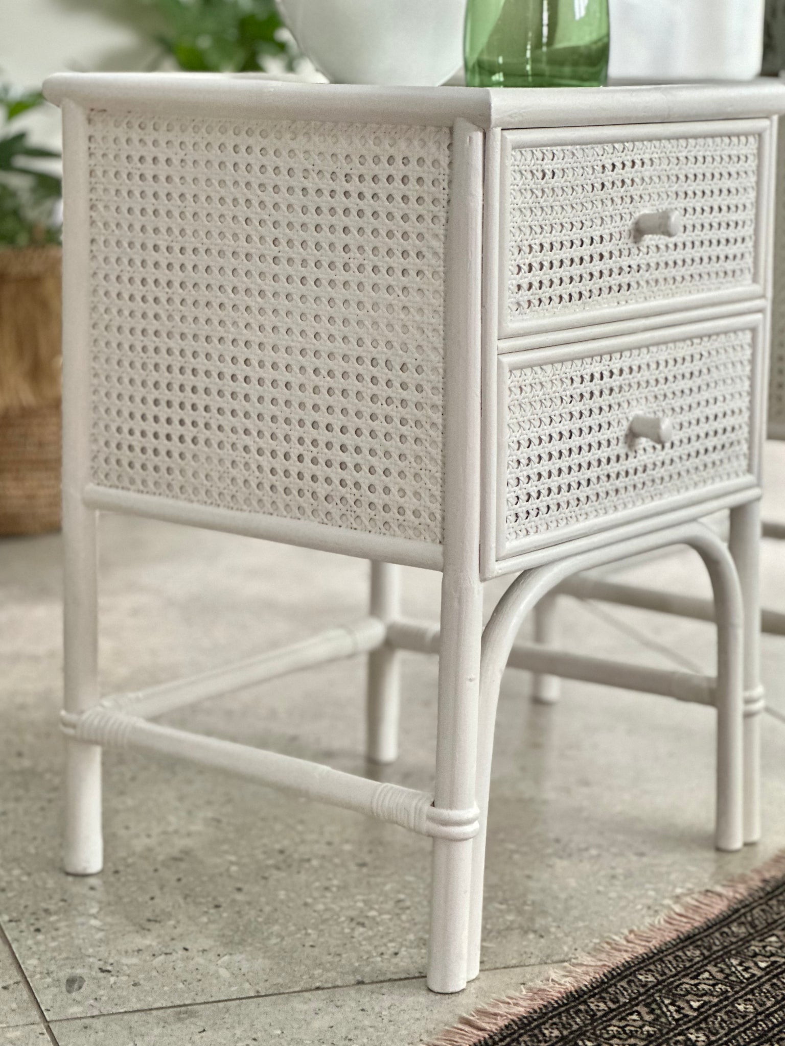 These pedestals offer practical storage with two spacious drawers, each fitted with a simple pull knob for a clean, minimal look. The top surface is finished with glass panels, thoughtfully added to protect the delicate cane weave beneath while keeping the texture beautifully visible.