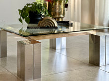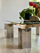 Much desirable Mid-Century brass, chrome and glass coffee table, typical of the period. Reminiscent of the designs and materials used by the Italian company Galotti & Radice dating back to the '50s-'70s although no maker's mark is visible.